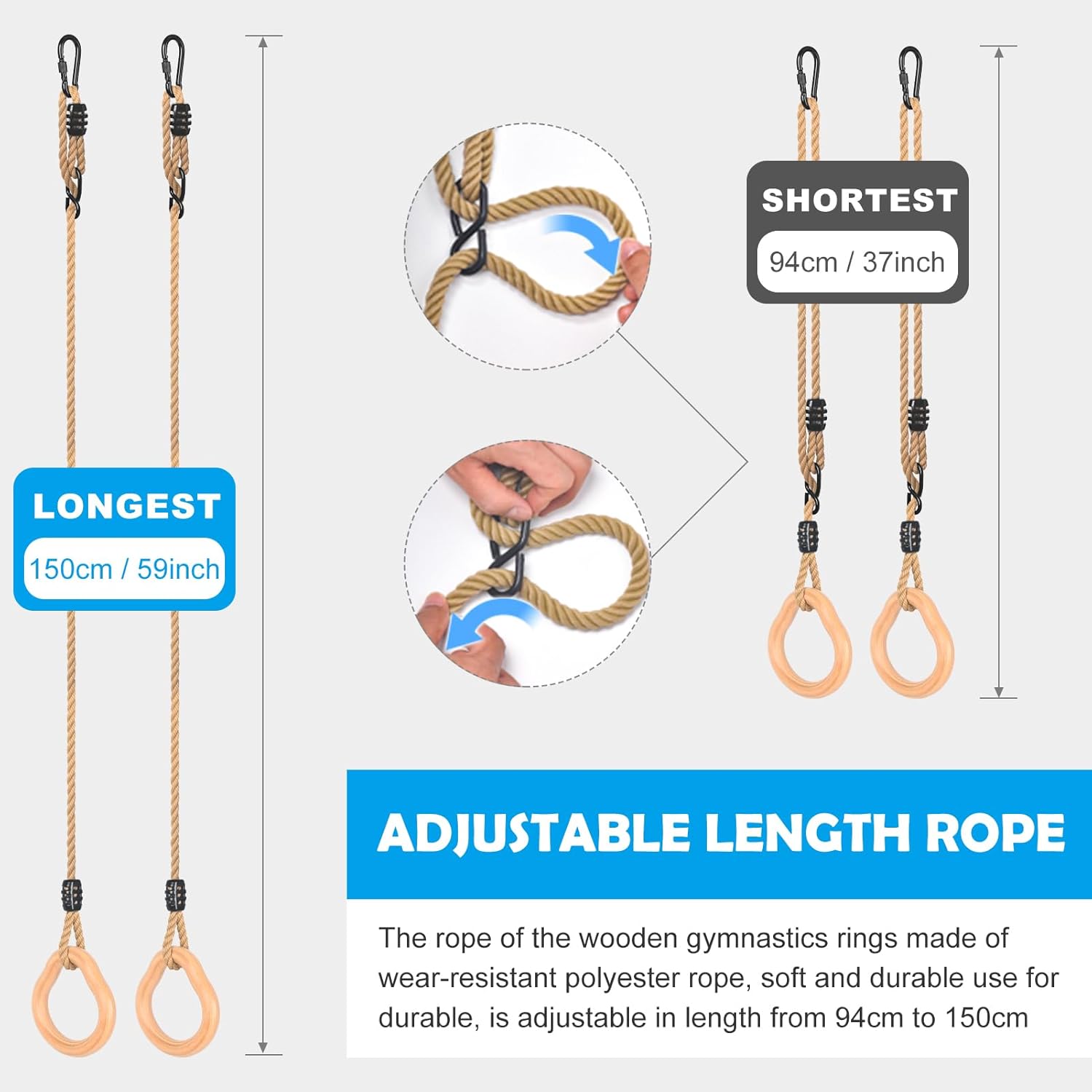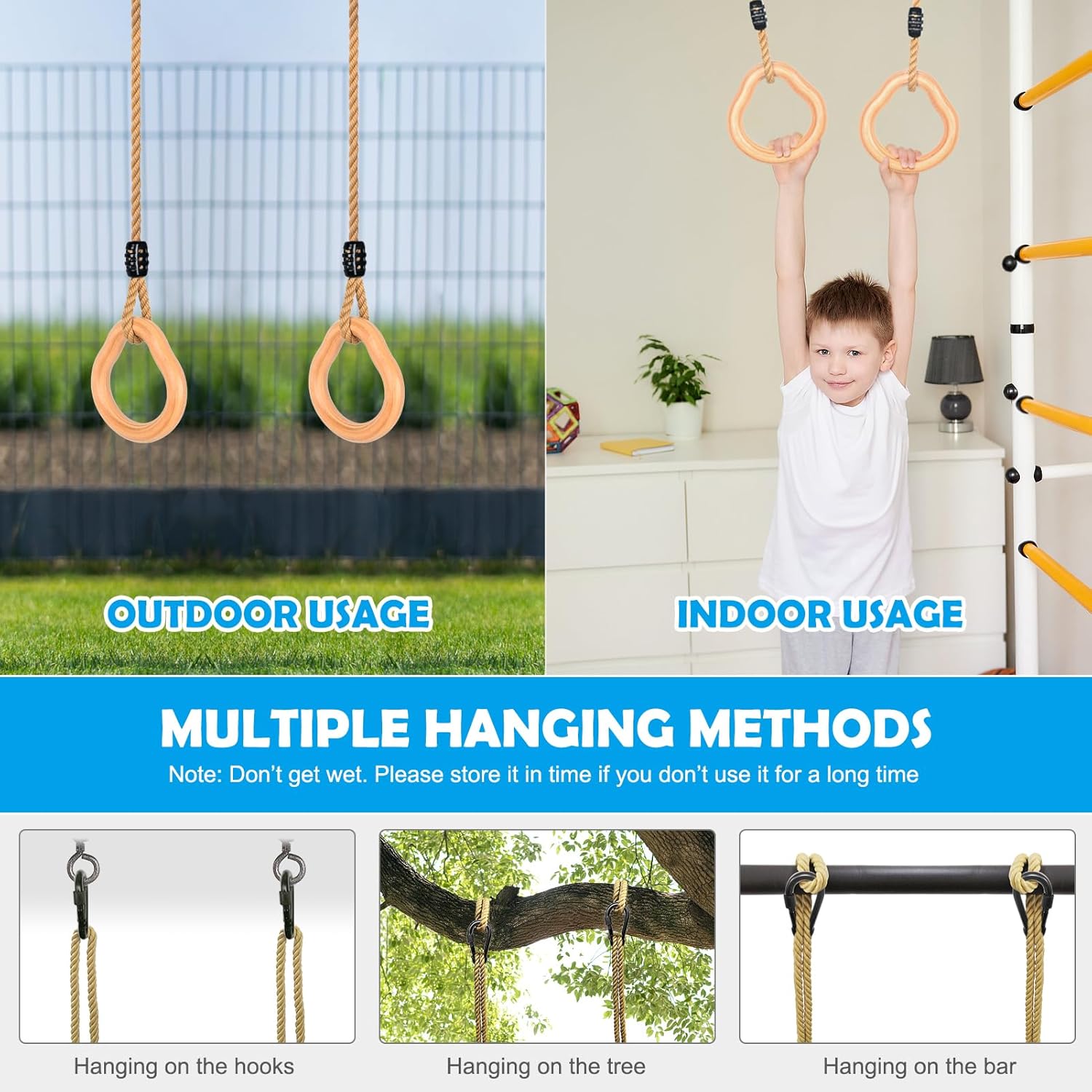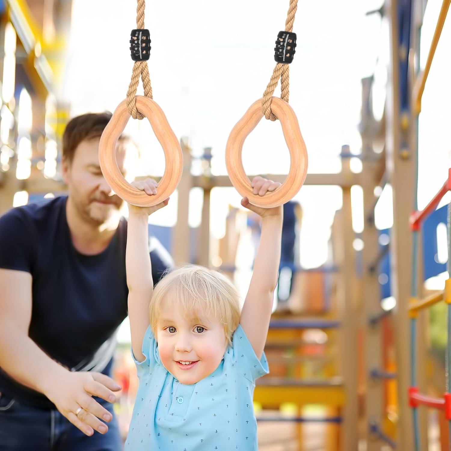 【Altalena a trapezio con anelli per ginnastica】 Il legno duro dell'altalena a trapezio con anelli è realizzato in pino massiccio. Anelli da ginnastica diametro 3,4 cm, design per bambini dai 3 anni in su, in legno massiccio che può sostenere fino a 100 kg. Combinazione di altalena a trapezio per esterni Lyndwin per uso interno ed esterno 【Corda di canapa morbida e regolabile】 La corda ad anello, altalena a trapezio per struttura da arrampicata realizzata in comoda corda di canapa, uso morbido e durevole per una lunga durata, è regolabile in lunghezza da 94 cm a 140 cm, il diametro della corda è di 1,3 cm, migliore sensazione della mano per i bambini Tiralo fuori e appendilo per ore all'aperto, trasformando qualsiasi giardino in un parco giochi sicuro. Lyndwin inventa sempre la tua barra trapezio da gioco all'aperto per aiutare te e i tuoi bambini a costruire ricordi che durino tutta la vita.,Installazione rapida: puoi appendere l'anello da ginnastica in legno su un robusto ramo di un albero o su un telaio nel tuo garage. Quindi lega la corda per appendere il ramo dell'albero. Viene fornito con due anelli di connessione facili da montare e smontare. Che si tratti del cortile, del giardino, del parco o della casa, l'area giochi dei tuoi bambini. Lascia che i tuoi bambini si godano l'infanzia con tutta la famiglia.,Attrezzatura per arrampicata di buona qualità Altalene: l'altalena a trapezio Lyndwin con anelli ha una superficie liscia e senza sbavature, facile da impugnare. I bambini devono essere accompagnati da un adulto durante il gioco. Si prega di non esporre l'altalena a trapezio alla luce solare diretta o all'umidità per un periodo di tempo prolungato