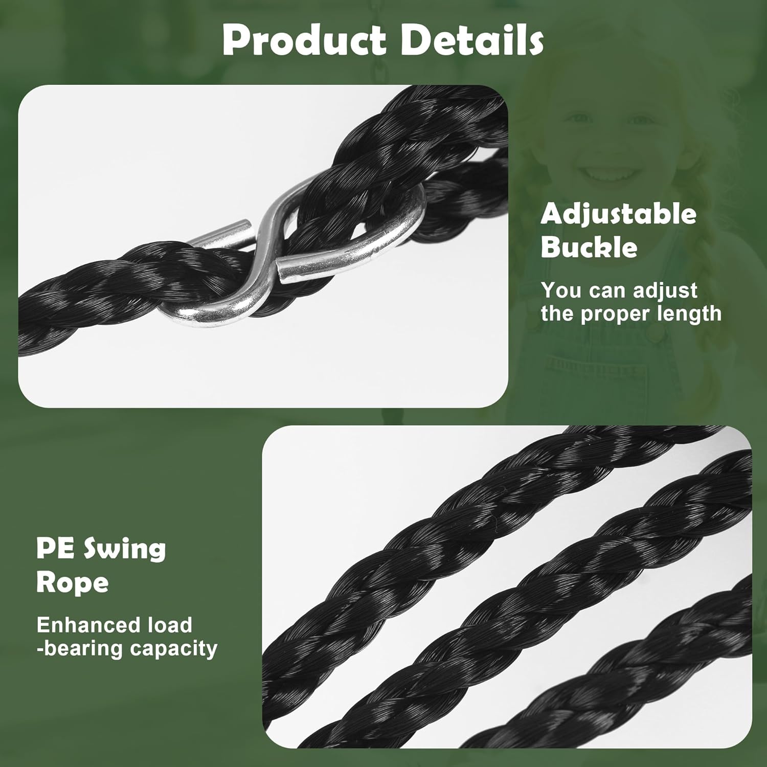 【Escort di sicurezza】QuestaAltalena da giardino presenta una seduta ergonomica, una superficie 3D antiscivolo e angoli arrotondati per ridurre efficacemente il rischio di urti. Che sia in casa o in giardino, il tuo bambino potrà godersi un momento di divertimento dondolandosi in tutta tranquillità. 【Facile installazione】Dotato Seggiolino altalena bambini di 2 moschettoni e 2 cinghie di collegamento, si aggancia rapidamente a stipiti di porte, rami o altalene senza bisogno di attrezzi. È facile da installare e puoi iniziare a giocare in pochi minuti, permettendo al tuo bambino di iniziare subito a giocare in allegria. 【Altezza regolabile】La corda Seggiolino altalena è regolabile in lunghezza per adattarsi a bambini di diverse età. È comoda da impugnare e robusta, rendendola un compagno ideale per il gioco e l'esplorazione dei bambini fin dalla prima infanzia. 【Abbraccia la natura】I bambini possono divertirsi giocando, facendo esercizio, migliorando la coordinazione e l'interesse per lo sport in giardino o sul balcone. Le Seduta Altalena per Bambini un modo divertente e salutare per giocare e promuovono il loro legame con l'ambiente esterno. 【Condivisione genitore-figlio】L'altalena ad Altalena bambini ha una capacità di carico massima di 100 kg e il robusto sedile in plastica è dotato di corde resistenti alle intemperie. Anche mamma e papà possono partecipare, dondolarsi con i loro bambini e godersi il caldo momento di interazione genitore-figlio.