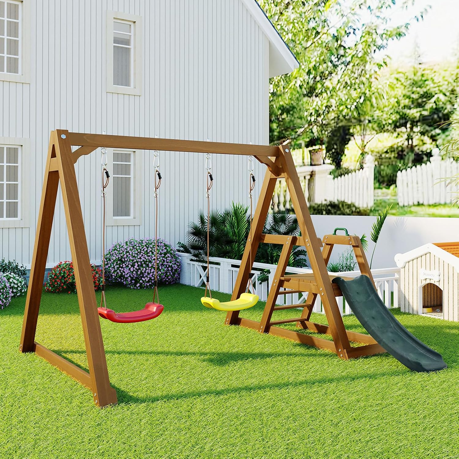 【Telaio per altalena in legno di alta qualità】Le travi in legno massello spesse 9 cm e le barre di supporto verdi hanno una capacità di carico massima di 50 kg, garantendo la massima sicurezza per i bambini dai 3 anni in su. 【Design di sicurezza】Questa altalena da giardino è realizzata in legno spesso con una struttura antiscivolo. La catena/corda dell'altalena è dotata di protezione per le dita e bordi arrotondati per una presa sicura e sicura. 【Telaio per altalena per tutte le stagioni】Design resistente alle intemperie per giardino, patio o cortile: per dondolarsi, scivolare e arrampicarsi in qualsiasi condizione atmosferica. 【Altalena per bambini come torre da gioco】Lo scivolo integrato, la scaletta di risalita e i 2 seggiolini per altalena creano un paradiso di gioco multifunzionale per interni ed esterni. 【Montaggio rapido senza attrezzi】Istruzioni chiare con parti numerate e un sofisticato di collegamento a spina: facile montaggio da parte di 2 adulti.