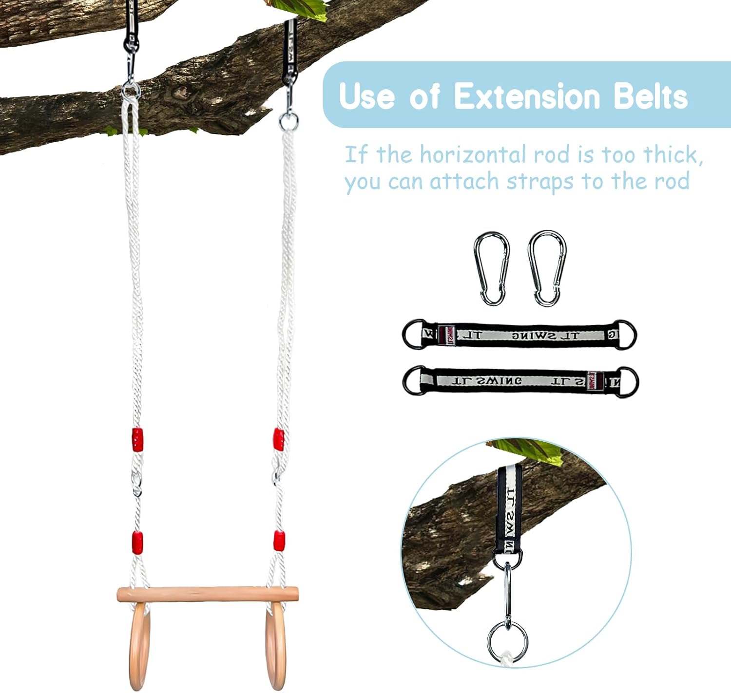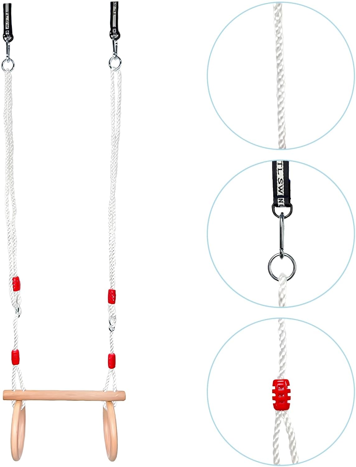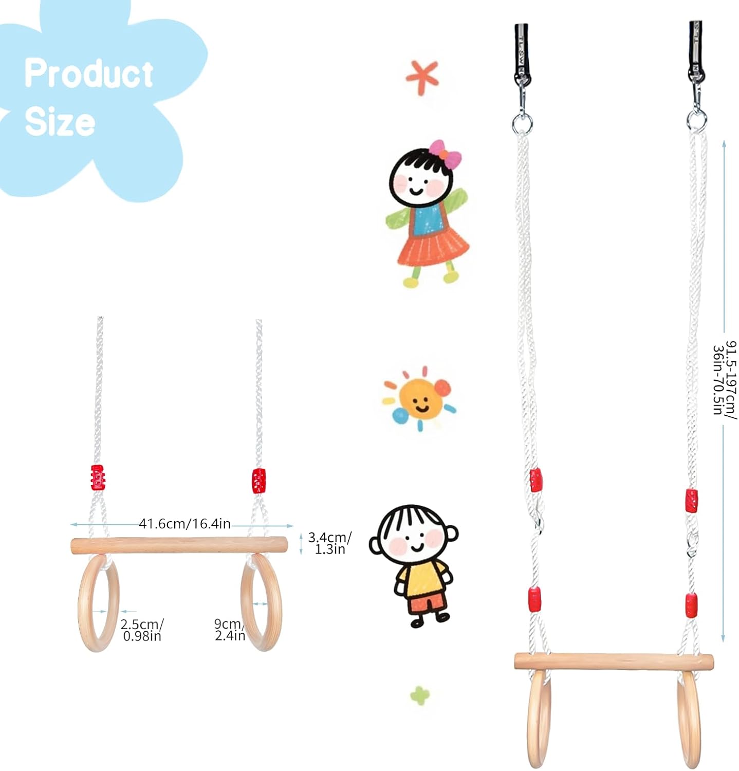 Design Adatto ai Bambini: la nostra altalena per bambini è realizzata in legno e metallo di alta qualità, che la rendono resistente alla corrosione e all'umidità. È dotata di corde morbide e bordi arrotondati per garantire una presa sicura e proteggere le mani dei bambini da eventuali fastidi Dotato di Corde di Bloccaggio: Questa altalena per bambini utilizza una resistente corda di canapa da 10 mm di diametro, che offre un'elevata resistenza per l'arrampicata. Le fibbie regolabili consentono di regolare facilmente la lunghezza e la tensione della cinghia, garantendo il comfort e la sicurezza del bambino Altalena e Cerchio da Anelli Ginnastica: Questa altalena per bambini può essere utilizzata sia come altalena che come cerchio da ginnastica. Offre divertimento e promuove lo sviluppo dei muscoli del core, l'equilibrio e la coordinazione. Lascia che il tuo bambino si goda la gioia e i benefici per la salute di un'infanzia attiva. Questa altalena è anche un regalo ideale che i bambini adoreranno Resistente e sicuro: il nostri anelli per altalena legno pesano 1,15 kg e sono dotati di traverse e maniglie robuste e antiscivolo, garantendo un gioco sicuro e duraturo. Inoltre, ogni componente dell'altalena è saldamente collegato, aumentando la sicurezza dei bambini. Il nostro set di altalene può supportare fino a 100 kg Diverse opzioni di installazione: il set di altalene include un multifunzionale altalena per bambini de anelli ginnastica, due moschettoni, due cinghie di prolunga e una borsa portaoggetti. Utilizzando i ganci a molla inclusi, l'altalena può essere fissata rapidamente e saldamente a una struttura stabile, come un albero, un gancio a soffitto o una struttura in legno. Ideale per giardino, parco giochi o uso domestico. Tuttavia, si sconsiglia di posizionare l'altalena sotto la pioggia, la luce diretta del sole o il gelo