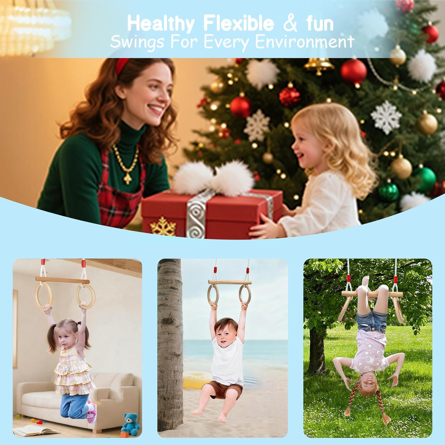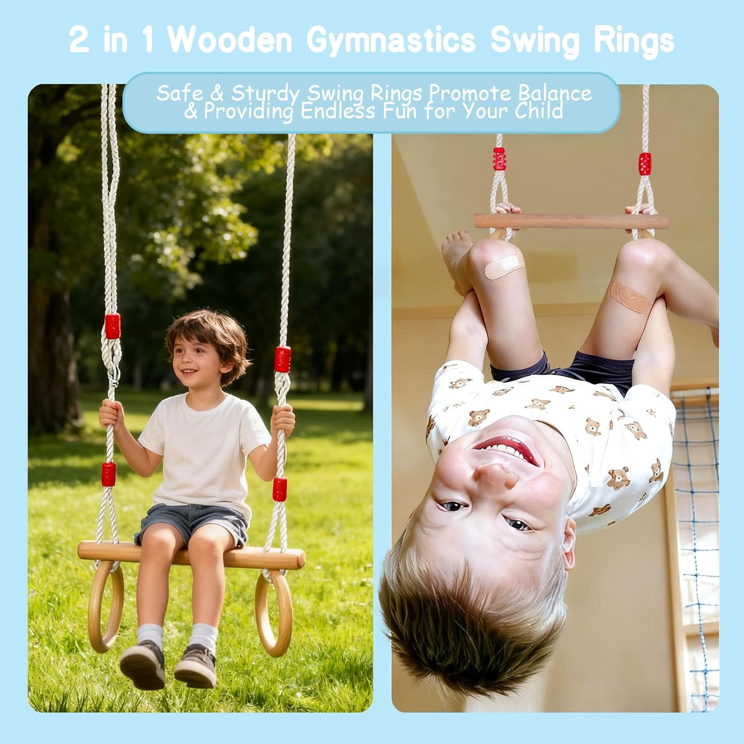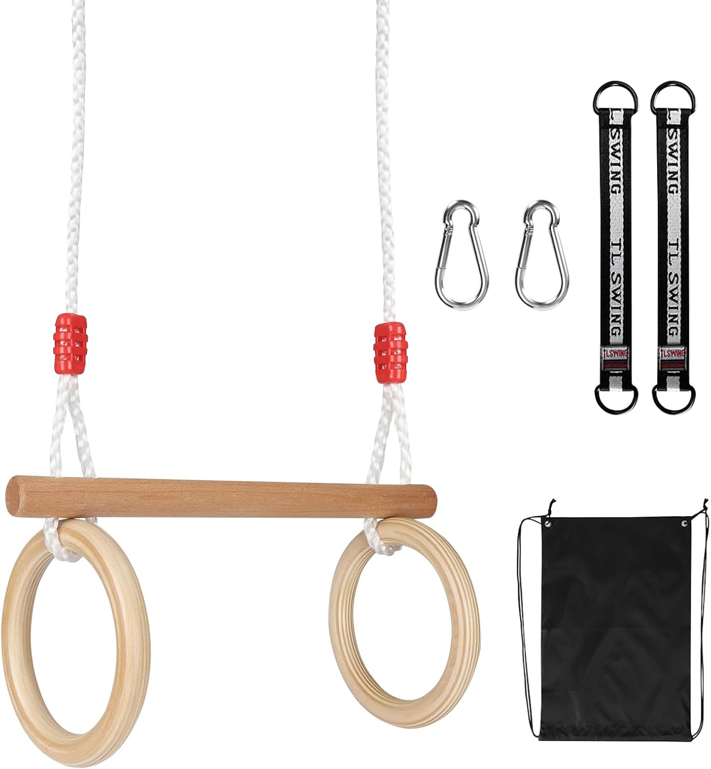 Design Adatto ai Bambini: la nostra altalena per bambini è realizzata in legno e metallo di alta qualità, che la rendono resistente alla corrosione e all'umidità. È dotata di corde morbide e bordi arrotondati per garantire una presa sicura e proteggere le mani dei bambini da eventuali fastidi Dotato di Corde di Bloccaggio: Questa altalena per bambini utilizza una resistente corda di canapa da 10 mm di diametro, che offre un'elevata resistenza per l'arrampicata. Le fibbie regolabili consentono di regolare facilmente la lunghezza e la tensione della cinghia, garantendo il comfort e la sicurezza del bambino Altalena e Cerchio da Anelli Ginnastica: Questa altalena per bambini può essere utilizzata sia come altalena che come cerchio da ginnastica. Offre divertimento e promuove lo sviluppo dei muscoli del core, l'equilibrio e la coordinazione. Lascia che il tuo bambino si goda la gioia e i benefici per la salute di un'infanzia attiva. Questa altalena è anche un regalo ideale che i bambini adoreranno Resistente e sicuro: il nostri anelli per altalena legno pesano 1,15 kg e sono dotati di traverse e maniglie robuste e antiscivolo, garantendo un gioco sicuro e duraturo. Inoltre, ogni componente dell'altalena è saldamente collegato, aumentando la sicurezza dei bambini. Il nostro set di altalene può supportare fino a 100 kg Diverse opzioni di installazione: il set di altalene include un multifunzionale altalena per bambini de anelli ginnastica, due moschettoni, due cinghie di prolunga e una borsa portaoggetti. Utilizzando i ganci a molla inclusi, l'altalena può essere fissata rapidamente e saldamente a una struttura stabile, come un albero, un gancio a soffitto o una struttura in legno. Ideale per giardino, parco giochi o uso domestico. Tuttavia, si sconsiglia di posizionare l'altalena sotto la pioggia, la luce diretta del sole o il gelo