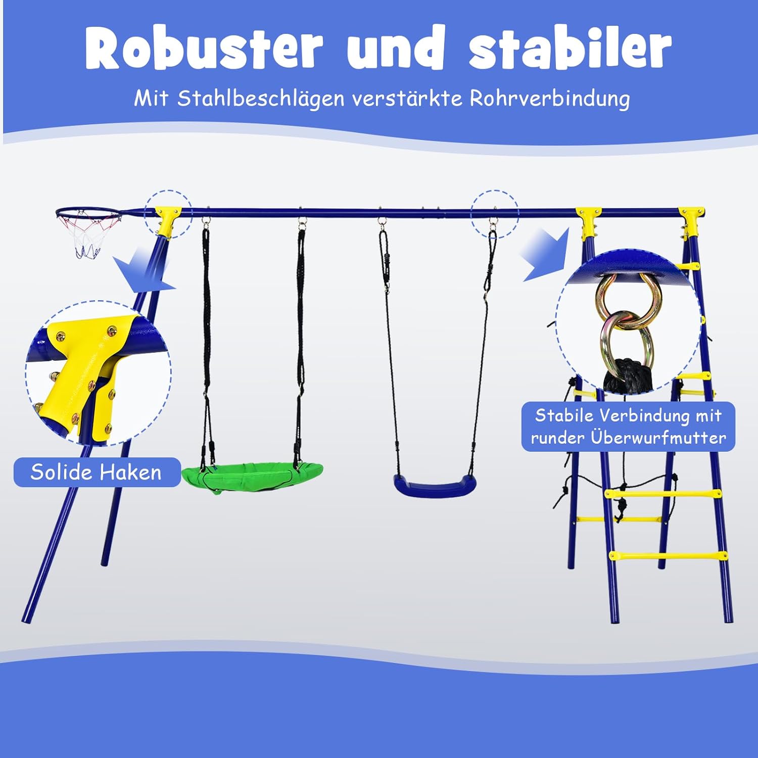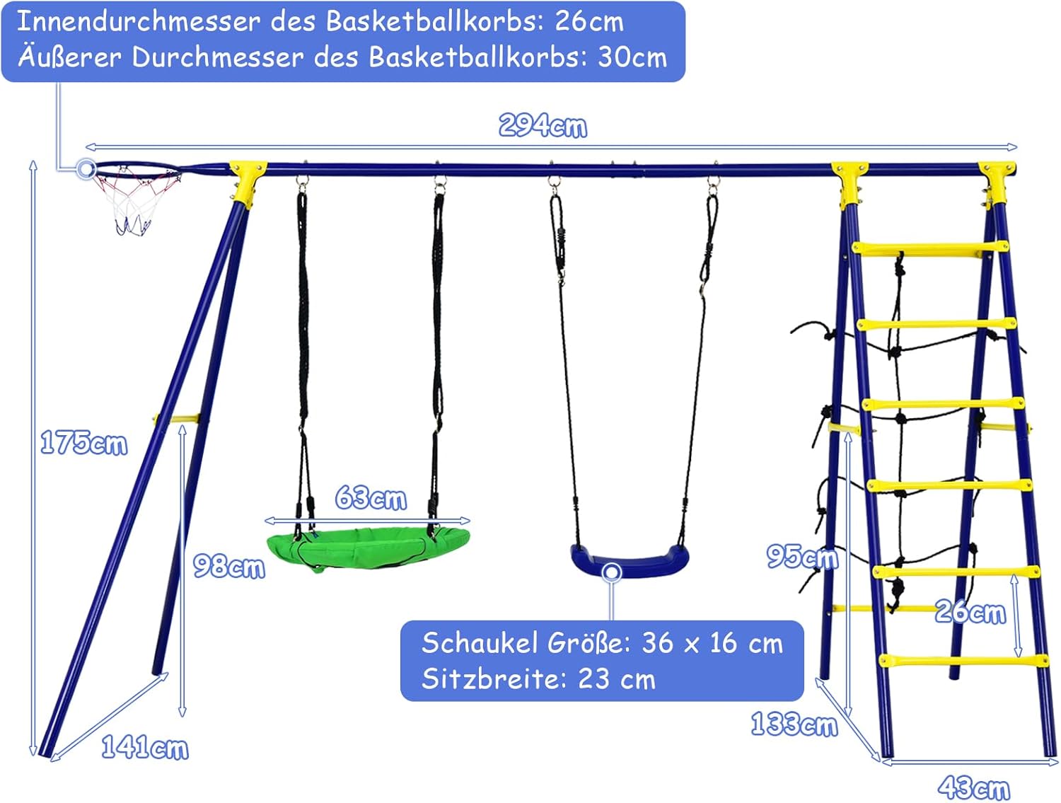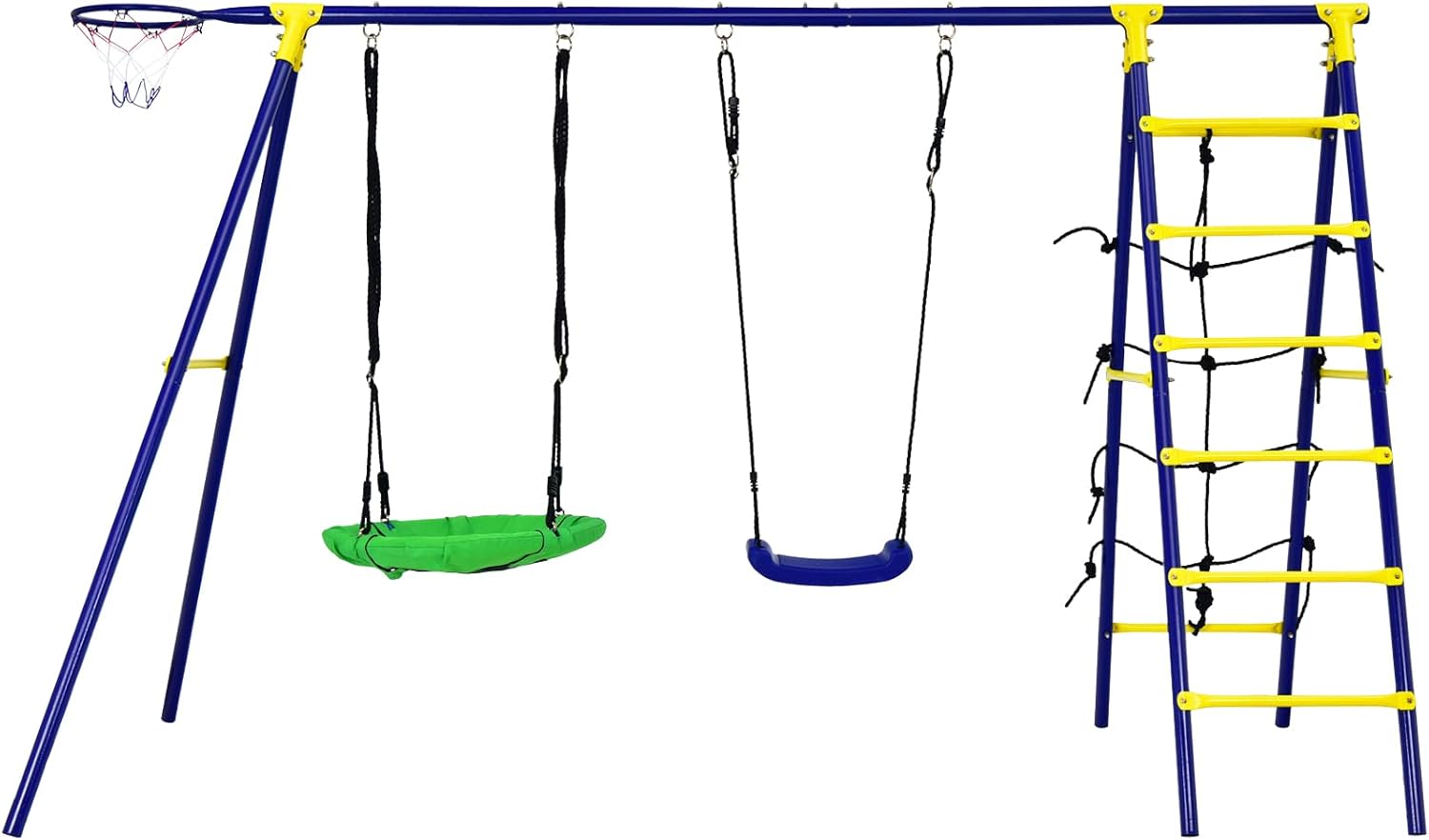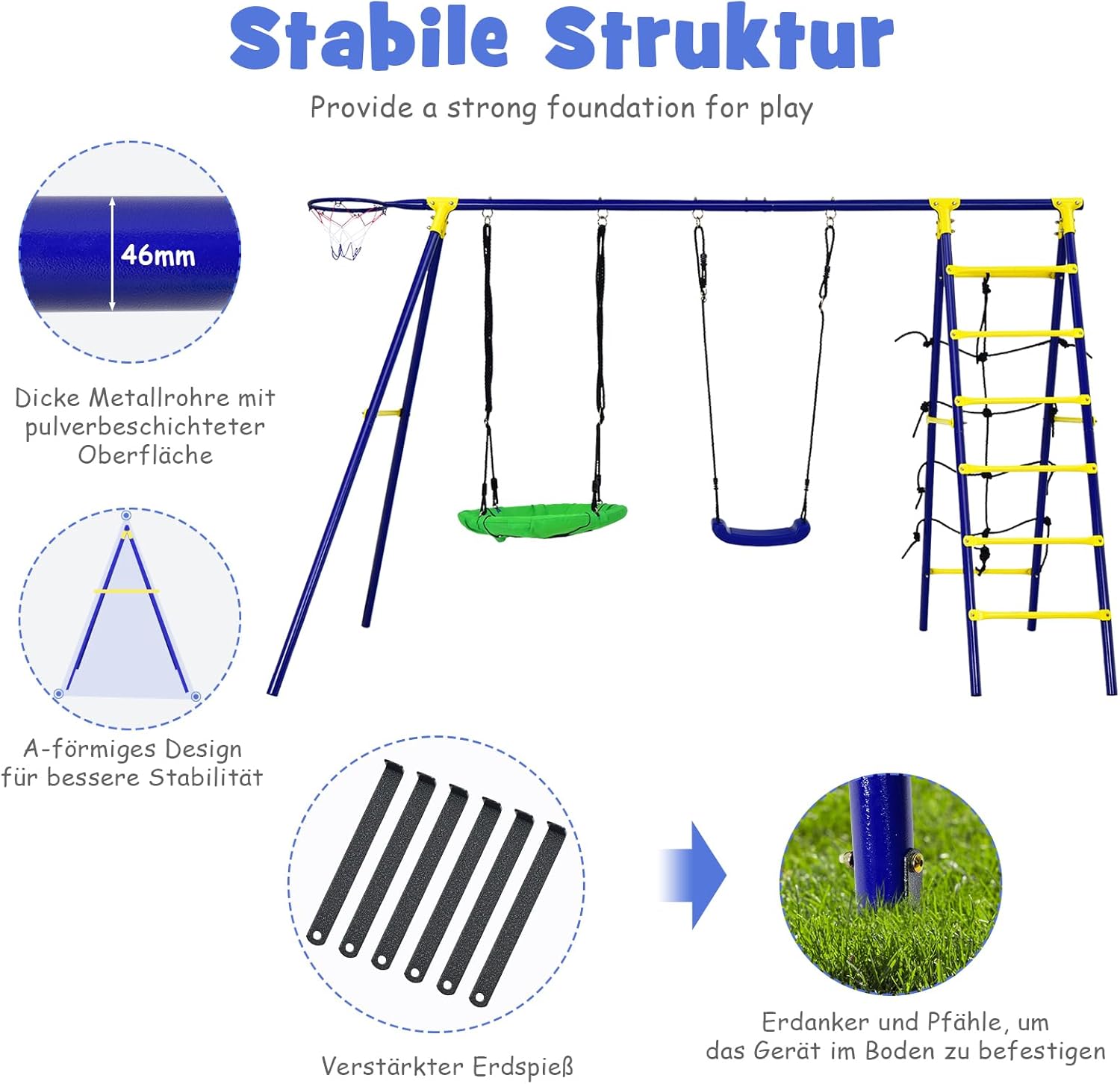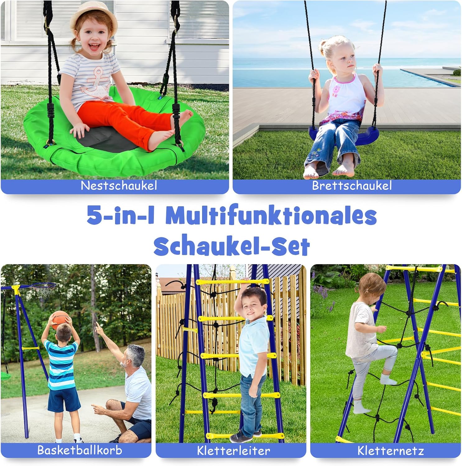 Altalena multifunzionale - Il nostro set di altalene per bambini 5 in 1 è composto da 2 altalene, 1 canestro da basket, 1 scala da arrampicata e 1 rete da arrampicata e offre ai tuoi bambini un divertimento senza fine. 2 altalene regolabili in altezza: entrambe le altalene sono regolabili in altezza per soddisfare le esigenze dei bambini di diverse altezze. Telaio girevole stabile e robusto - La struttura a forma di A e 6 picchetti da terra assicurano che il telaio girevole sia stabile sul terreno. I tubi in acciaio verniciati a polvere garantiscono elevata durata e robustezza. Adatto per uso esterno - La nostra altalena da giardino con diverse aree di gioco è adatta a bambini di età diverse per giocare in luoghi diversi, ad es. Per esempio. in giardino, cortile, parco giochi, parco, ecc. Aiuta i bambini ad allenare le proprie capacità motorie, sviluppare abilità e promuovere la coordinazione occhio-mano durante il processo di gioco. Facile da montare: l'altalena da esterno viene fornita con tutti gli accessori necessari e istruzioni di facile comprensione. E la superficie dell'altalena e dello scivolo per bambini è liscia, quindi puoi pulirli facilmente.