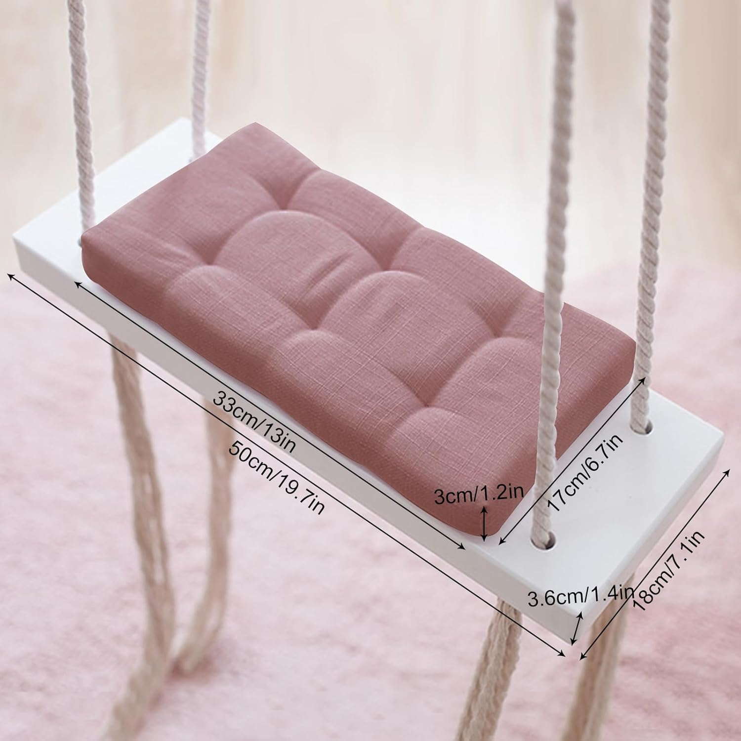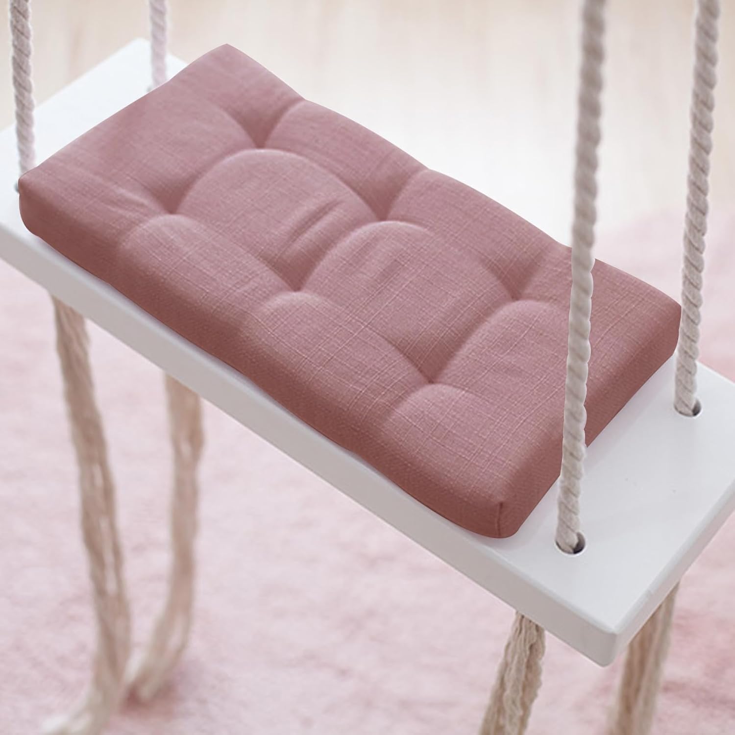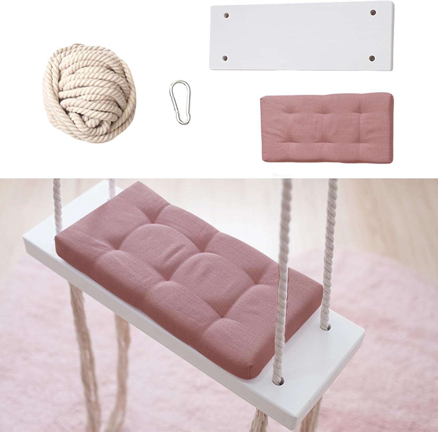 Materiali di alta qualità: seduta in legno massello, morbido cuscino in tessuto delicato sulla pelle e corde di canapa ispessite garantiscono stabilità, comfort e lunga durata. Comodo e sicuro: cuscini spessi imbottiti, corde stabili e superfici lisce offrono ai bambini un'esperienza di oscillazione sicura e confortevole, ideale per l'uso quotidiano. Bel design: cuscino rosa combinato con legno bianco e corde di canapa beige, l'aspetto fresco e luminoso rende l'altalena una decorazione elegante. Versatile: adatto per la cameretta dei bambini, giardino, parco giochi, studio fotografico o asilo. L'altalena è un vero e proprio colpo d'occhio sia all'interno che all'esterno. Facile installazione: con gancio in dotazione e corde lunghe 5 m, l'altalena può essere facilmente montata su robusti soffitti in cemento o cemento.