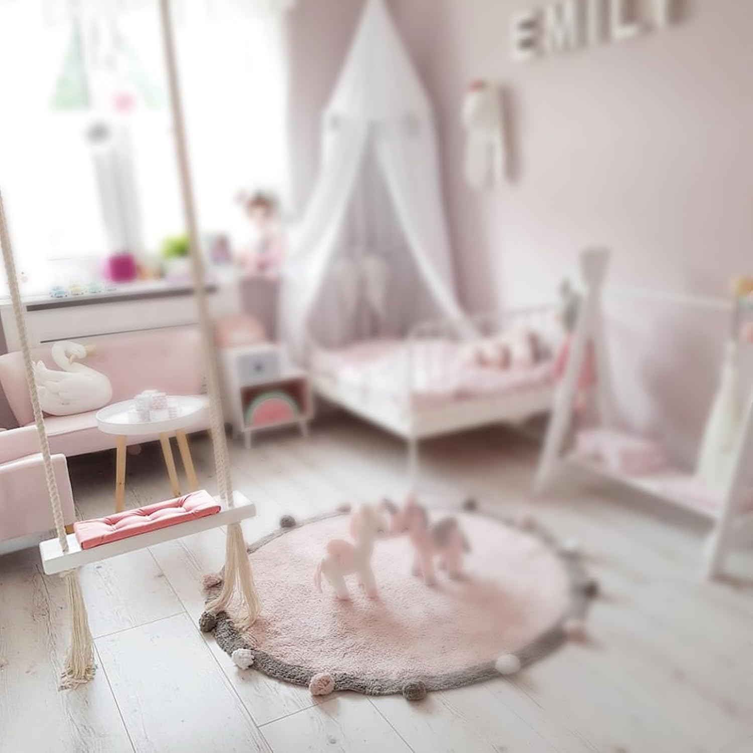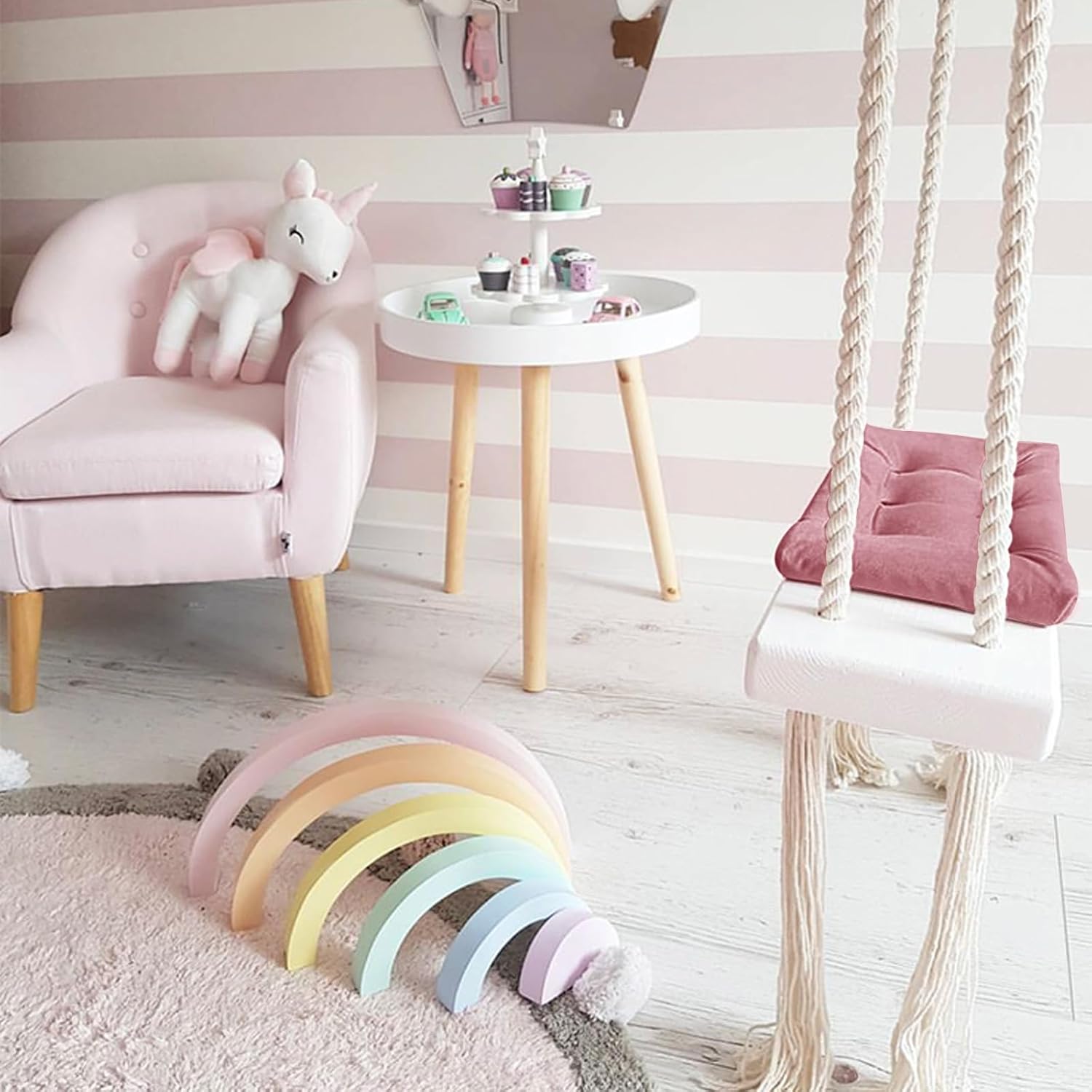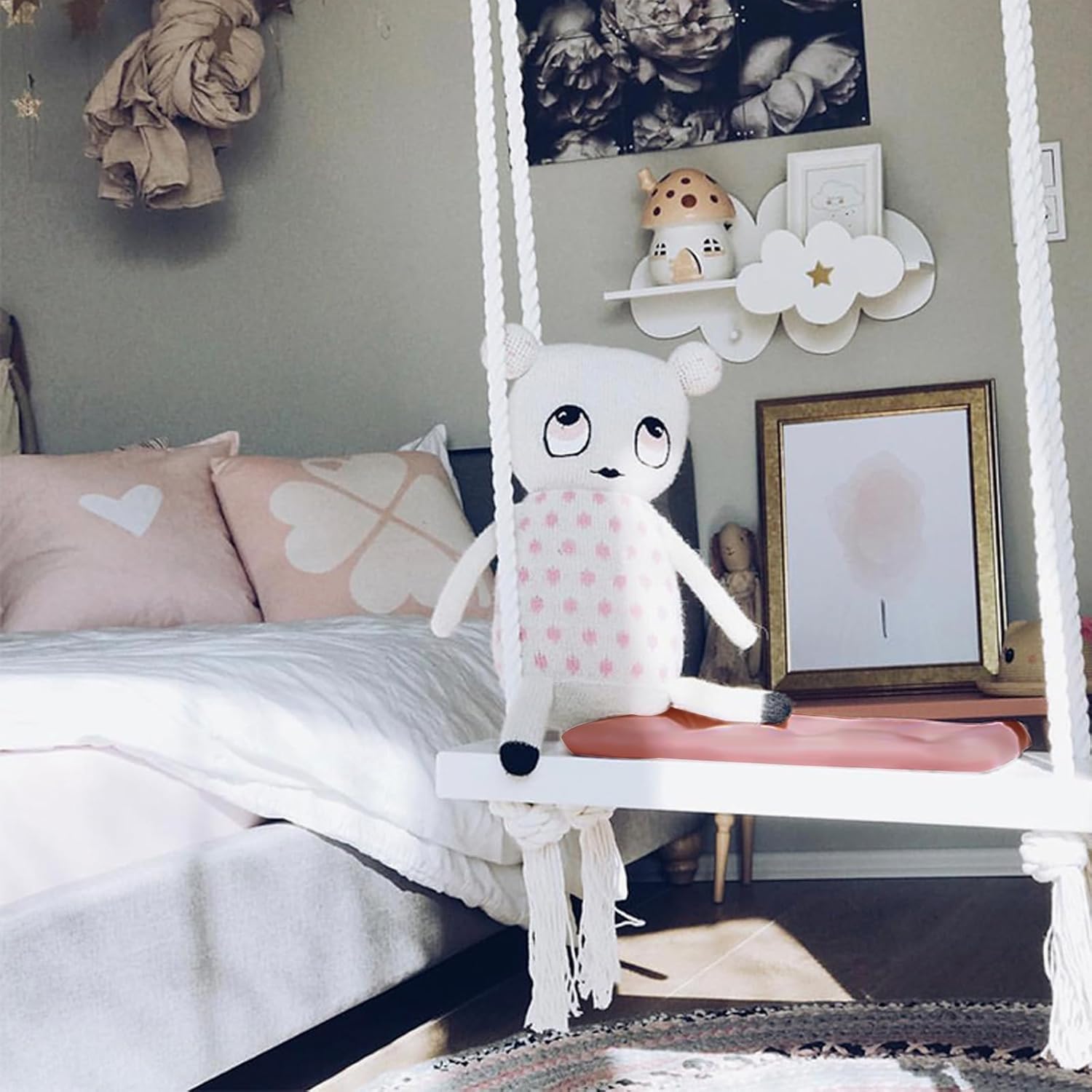 Materiali di alta qualità: seduta in legno massello, morbido cuscino in tessuto delicato sulla pelle e corde di canapa ispessite garantiscono stabilità, comfort e lunga durata. Comodo e sicuro: cuscini spessi imbottiti, corde stabili e superfici lisce offrono ai bambini un'esperienza di oscillazione sicura e confortevole, ideale per l'uso quotidiano. Bel design: cuscino rosa combinato con legno bianco e corde di canapa beige, l'aspetto fresco e luminoso rende l'altalena una decorazione elegante. Versatile: adatto per la cameretta dei bambini, giardino, parco giochi, studio fotografico o asilo. L'altalena è un vero e proprio colpo d'occhio sia all'interno che all'esterno. Facile installazione: con gancio in dotazione e corde lunghe 5 m, l'altalena può essere facilmente montata su robusti soffitti in cemento o cemento.