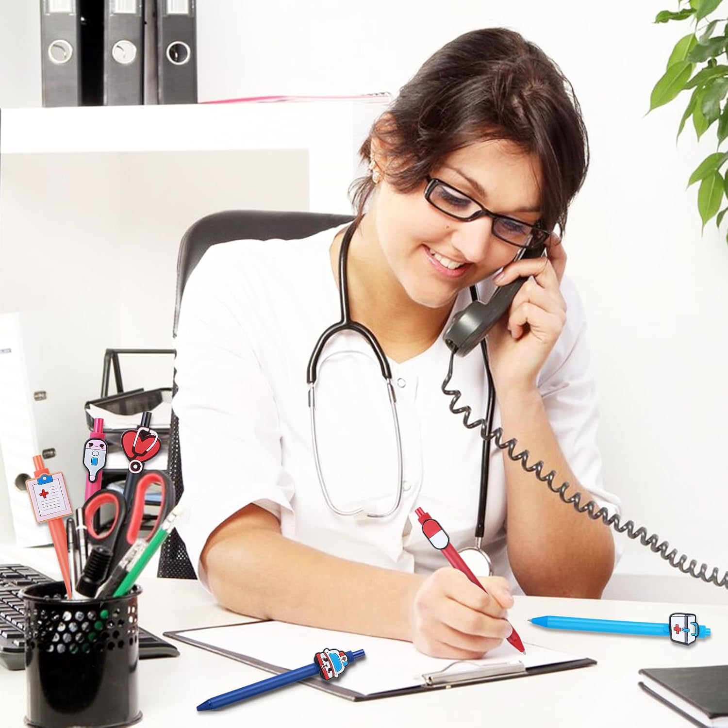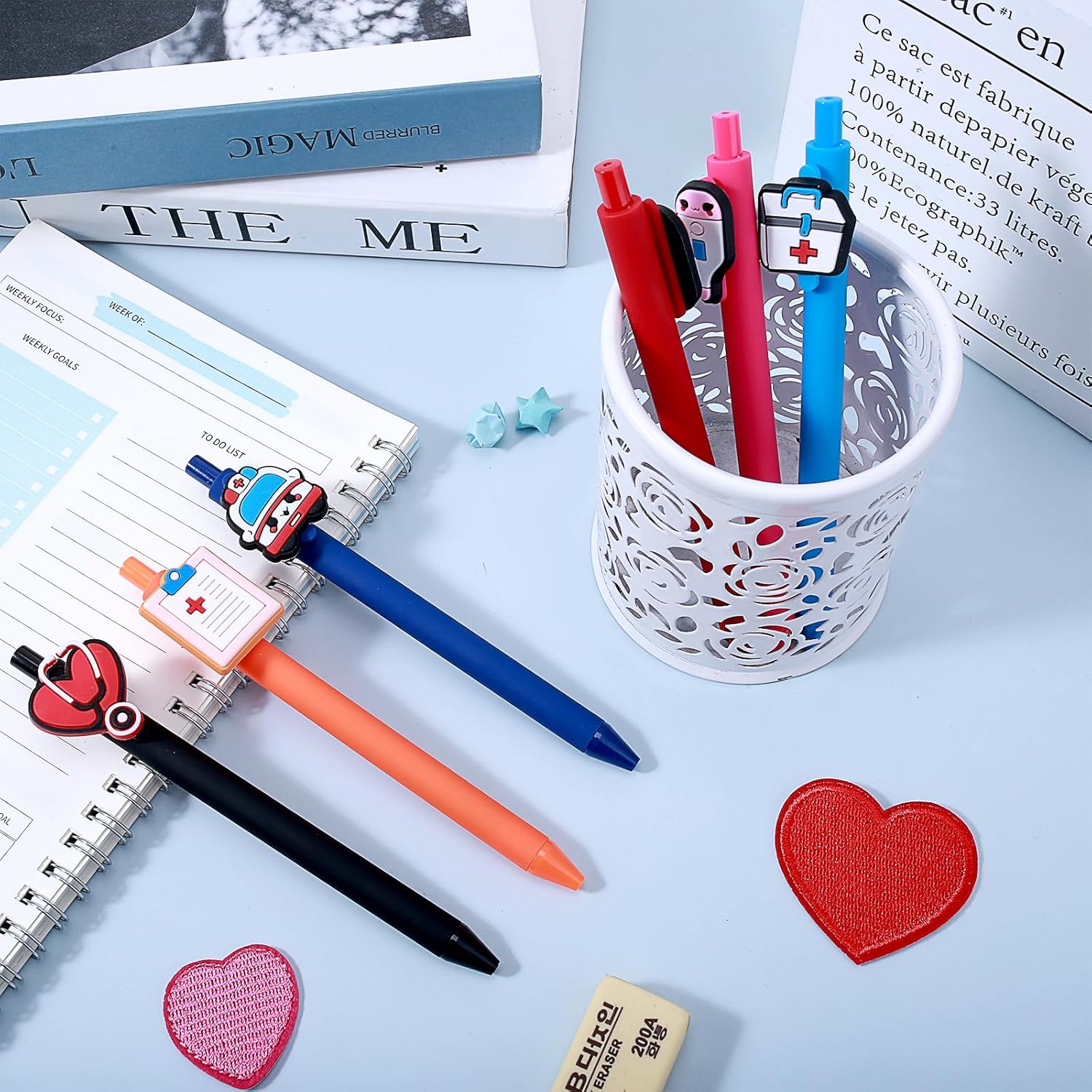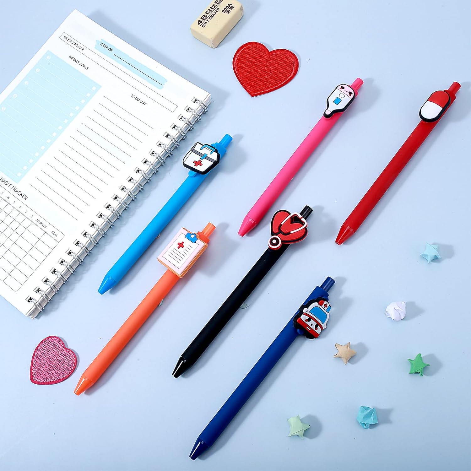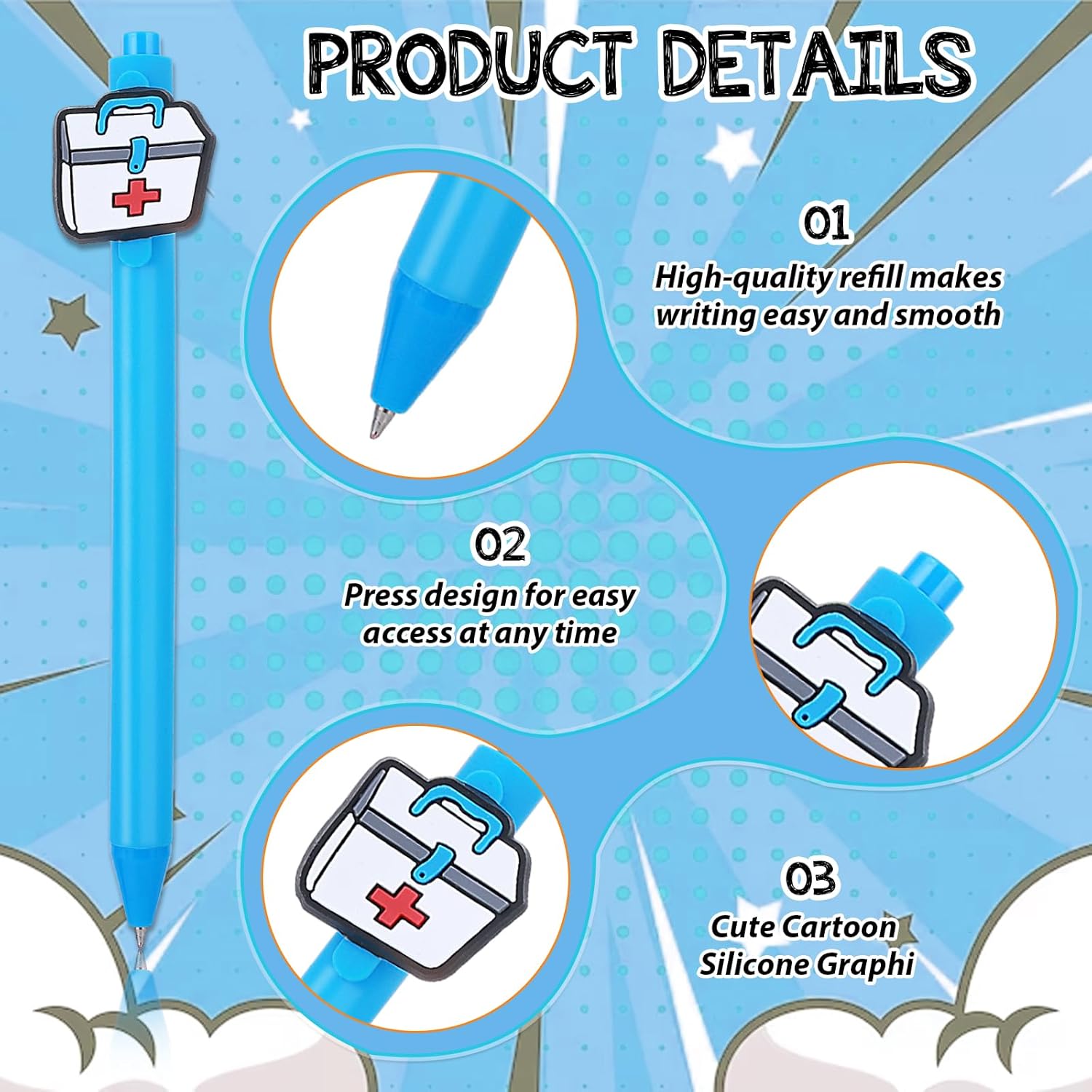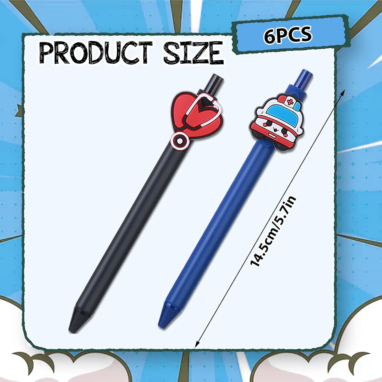 Incantevoli penne per infermiere: i nostri 6 simpatici accessori per infermiere sono riempiti in 6 diversi design, con pillole morbide, lattine per medicinali, termometri per orecchie, quaderni, ambulanze e stetoscopi premurosi. Queste penne sono eleganti e colorate e sono progettate per portare gioia al lavoro o a scuola. Quantità sufficiente per soddisfare le vostre esigenze quotidiane. L'inchiostro delle 6 penne è completamente nero! Scrittura fluida: le nostre penne a sfera sono penne lisce con punta media e scrivono chiaramente. Puoi usarli per tutti i tuoi lavori di scrittura, non passano attraverso la carta, nessuna sbavatura, nessuna perdita o perdita. Durevole e affidabile durante la scrittura, la punta della palla è liscia, in modo da poterla utilizzare a lungo. Design pratico: gli accessori per ufficio medico retrattile sono appositamente progettati per l'uso quotidiano. Possono essere facilmente fissati in tasche per camicie, quaderni o portablocco. Non c'è bisogno di preoccuparsi di perdere il cappuccio perché è possibile annotare i vostri appunti in modo efficiente. Regalo ideale: questi regali per infermieri sono un bel regalo per chiunque lavori nel settore sanitario, sia per studenti che per infermieri e medici, queste penne aggiungono un tocco di divertimento e personalità alla scrittura quotidiana di appunti, compilando moduli, ecc. . Le nostre penne uniche ti aiutano a esprimere il tuo apprezzamento e il rispetto per il duro lavoro degli altri. Comodo da usare: il manico garantisce una sensazione di presa super morbida e confortevole, rendendo ogni penna a sfera facile da impugnare. Aspetto alla moda e carino, in linea con la migliore tenuta della penna del corpo umano, la mano di scrittura è eccellente. I nostri regali per penne a cartone animato sono leggeri e hanno una presa liscia che li rende ideali per l'uso quotidiano.