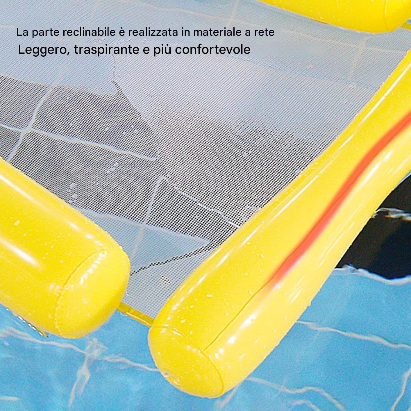Stabilità e Relax: Tessitura antiscivolo assicura presa sicura, mentre la regolazione personalizzata e il supporto dorsale offrono comfort ottimizzato per galleggiamento rilassante in acqua Corpo Galleggiante Resistente: Sperimenta il rilassamento ideale con l'amaca acquatica dotata di design galleggiante bilanciato, corpo galleggiante resistente e stabile galleggiabilità per distribuzione uniforme del peso e comfort di supporto Robustezza : Tecniche avanzate di saldatura ad alta frequenza e materiali resistenti garantiscono tenuta stagna, fornendo opzione sicura per galleggiamento in piscina o acque calme Facile da riporre: Design portatile con struttura gonfiabile ermetica, ideale per viaggi. Si ripiega in modo compatto per un riposino in piscina senza Utilizzo Diffuso:Progettato per spiaggia e piscina, combina funzionalità da per prendere il sole con design accattivante per migliorare l'esperienza di relax
