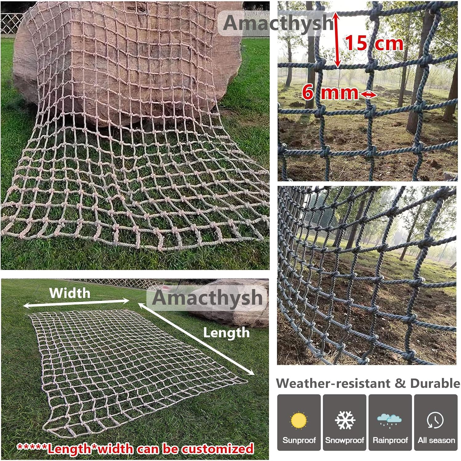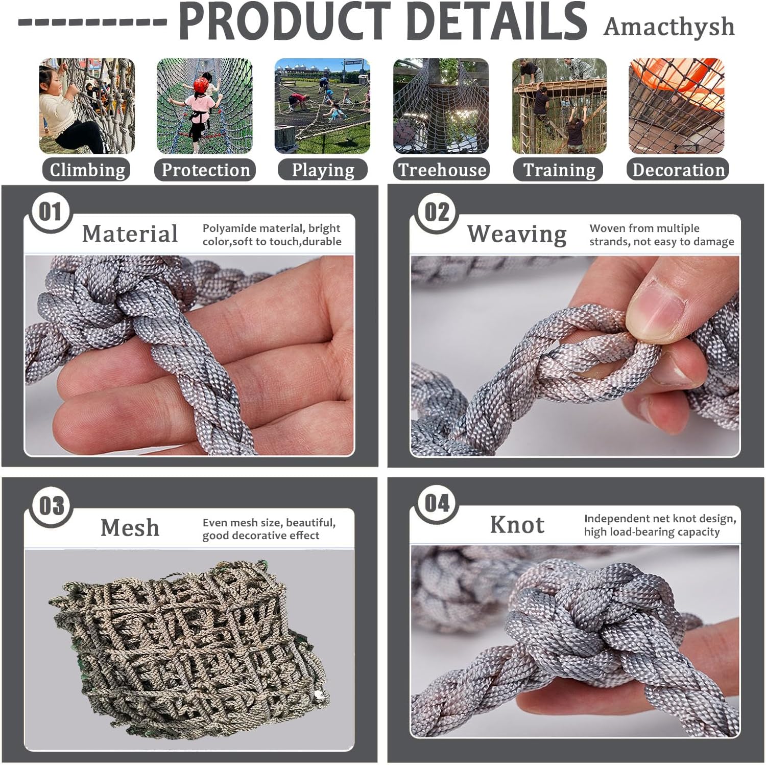 Rete di corda multiuso: utilizzata principalmente per l'arrampicata dei bambini, come altalene, casette da gioco all'aperto, set da gioco, attrezzature da gioco, palestre nella giungla, case sugli alberi, ponti di corda e parchi giochi in giardino. Inoltre, può anche essere utilizzata come amaca o rete di sicurezza per balconi, ringhiere e corrimano delle scale Resistente a tutte le condizioni atmosferiche: i nodi intrecciati a mano sono realizzati in materiale poliammidico resistente e morbido per garantire una distribuzione uniforme dello stress e una capacità di carico di oltre 800 libbre. L'elevata resistenza alla trazione e la buona resistenza alle intemperie consentono un utilizzo a lungo termine anche all'aperto Installazione in 5 minuti: la rete da carico per arrampicata è facile da installare e può essere rapidamente configurata con hardware e strumenti di base. Ad esempio, utilizzare corde o ganci per fissare la rete da arrampicata all'attrezzatura. Puoi gestirlo anche se non hai competenze fai da te Portatile e leggero: la rete da arrampicata è leggera e facile da spostare, il che la rende perfetta per le attività all'aperto e può essere arrotolata in una borsa portaoggetti per il trasporto o lo stoccaggio Dimensioni personalizzate: la lunghezza e la larghezza sono disponibili da 3,3 a 33 piedi e la lunghezza*larghezza, il diametro della maglia e il diametro della corda possono essere personalizzati per adattarsi perfettamente a diverse esigenze di spazio