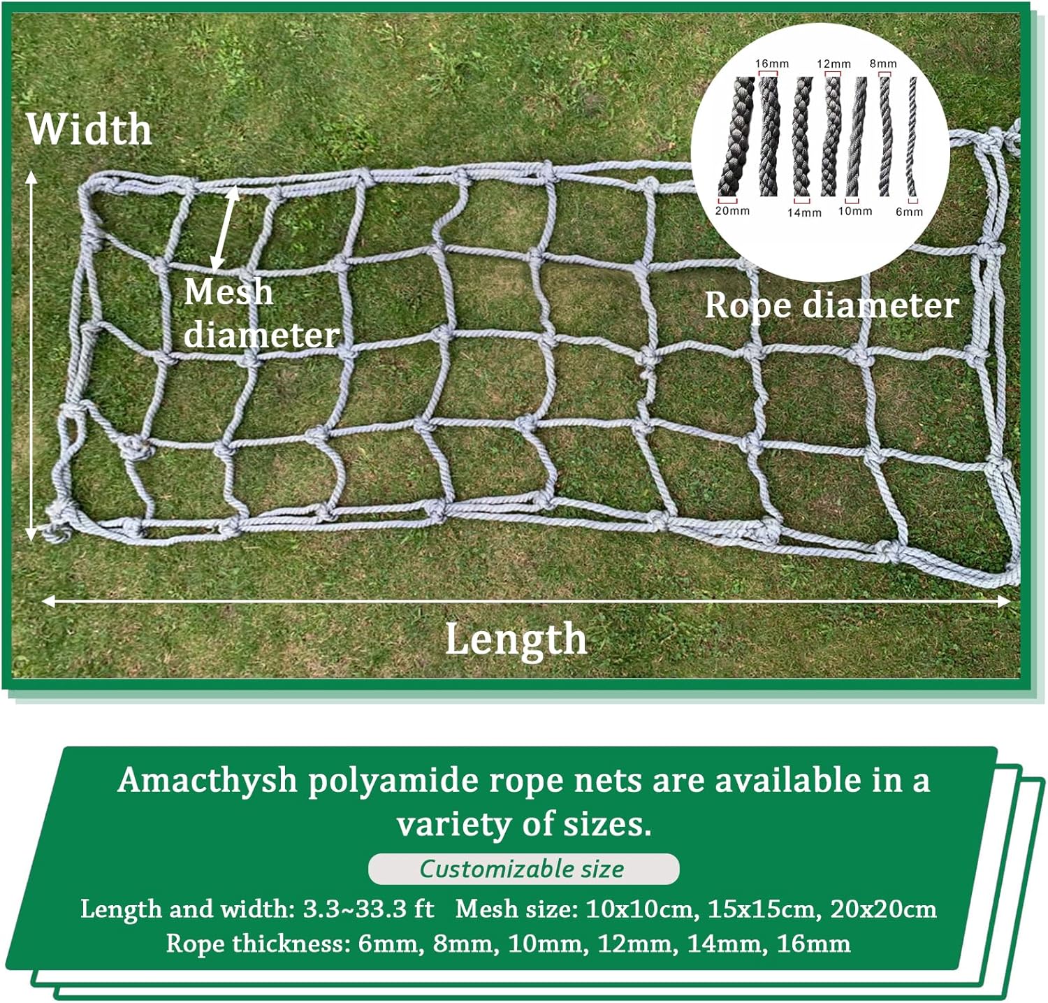 Rete da arrampicata intrecciata a mano: la rete di sicurezza per bambini è resistente anche se utilizzata all'aperto, intrecciata robusta, nodo robusto, intreccio multi-filo, rende la corda più resistente, ha una forte resistenza agli urti, può resistere alle peggiori condizioni Sicurezza dei materiali: la rete del parco giochi è realizzata in fibra di poliammide ad alta resistenza, con piccola capacità di estensione elastica, resistente alle intemperie, resistente all'usura, lunga durata, protezione solare, forte e durevole, forte capacità di carico e la capacità di carico può raggiungere i 300 kg Conservazione portatile: la corda della rete del telaio da arrampicata è moderatamente morbida, non sbiadisce facilmente, non teme vento e pioggia, ha una lunga durata, è più resistente, facile da installare e smontare. Quando non è in uso, può essere ripiegata per una facile conservazione Applicabile a: varie scene interne ed esterne, case sugli alberi, camion merci, scale, balconi, asili nido, parchi di divertimento, strutture pubbliche, isolamento per la protezione delle piante, edifici, reti da carico, reti da giardino, ecc., possono essere utilizzate per proteggere la sicurezza degli adulti e bambini Dimensioni personalizzate: spaziatura delle maglie: 15 cm; diametro della corda: 14 mm. La rete protettiva può essere personalizzata con qualsiasi spaziatura delle maglie, spessore della corda, lunghezza*larghezza e colore di cui hai bisogno