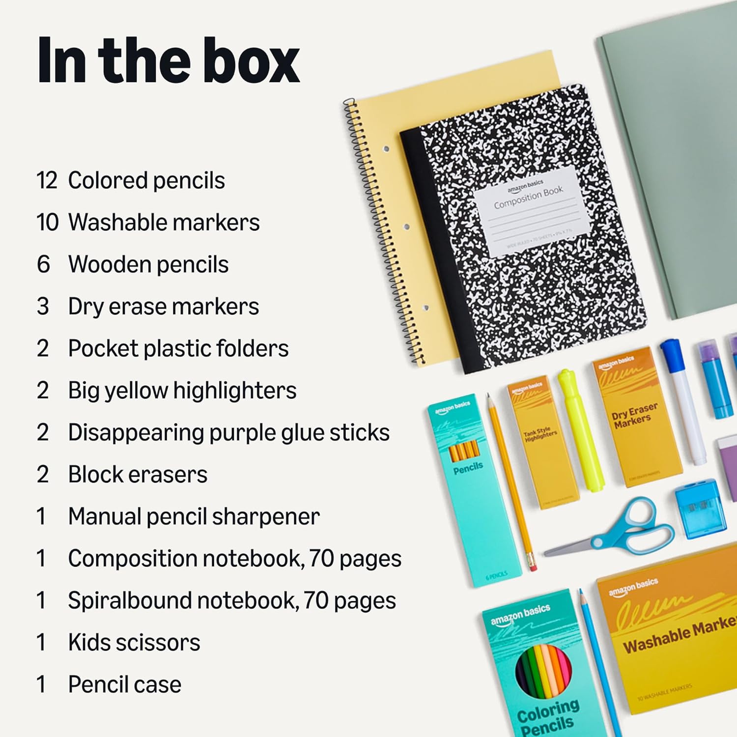 Il kit da 44 pezzi per il rientro a scuola e cancelleria per studenti è una scelta facile e completa per il materiale scolastico. Ideale per i genitori alla ricerca degli accessori essenziali per la classe; ottimo regalo per gli insegnanti con un budget limitato. Kit scolastico completo con utensili da scrittura tra cui 6 matite, 12 matite colorate, 10 pennarelli lavabili, 3 penne cancellabili e 2 evidenziatori. Gli articoli di cancelleria per studenti includono 2 cartelle con tasche, 1 quaderno a spirale e 1 quaderno per composizione. Gli altri accessori per la scuola comprendono 2 bastoncini di colla, un paio di forbici, un temperamatite e un astuccio.