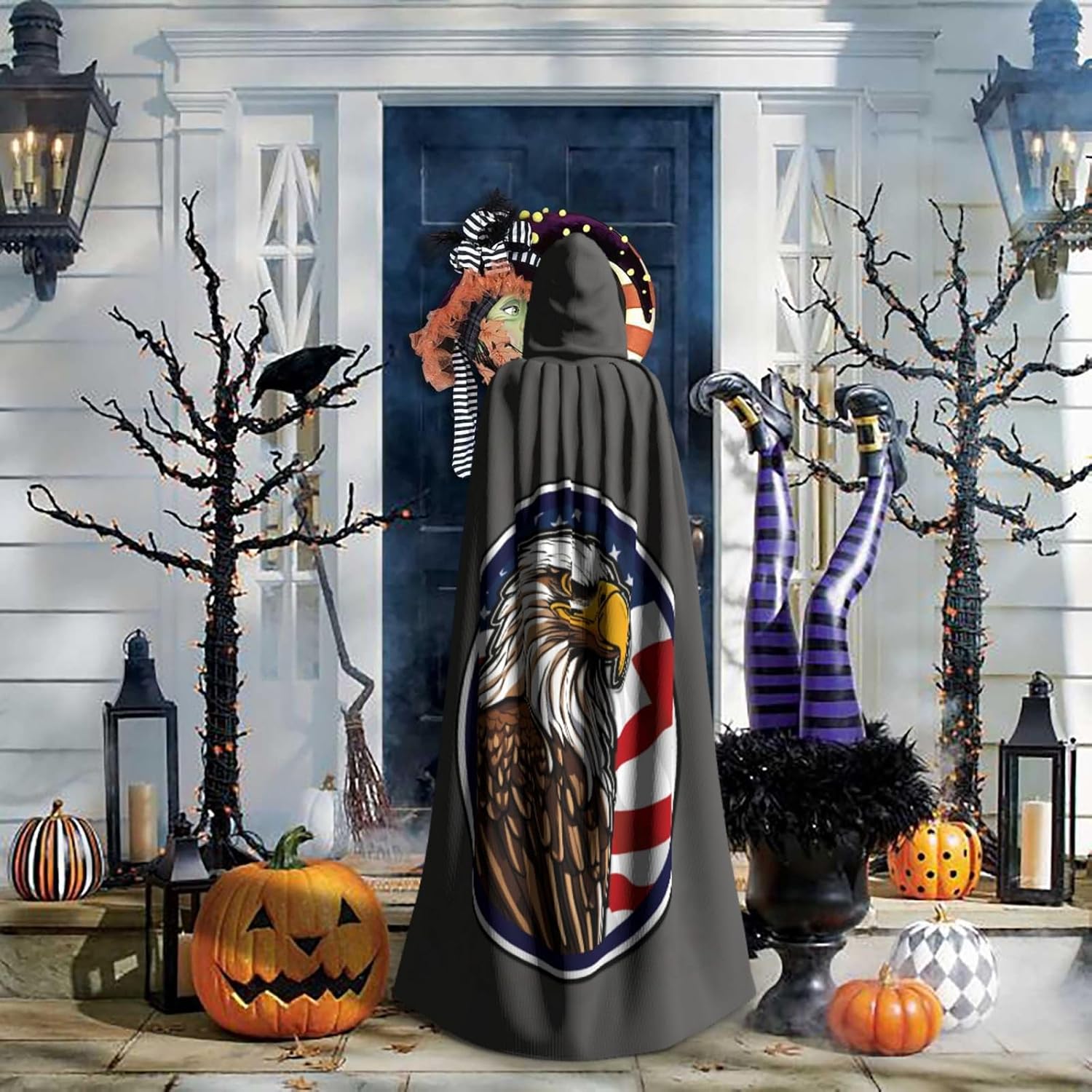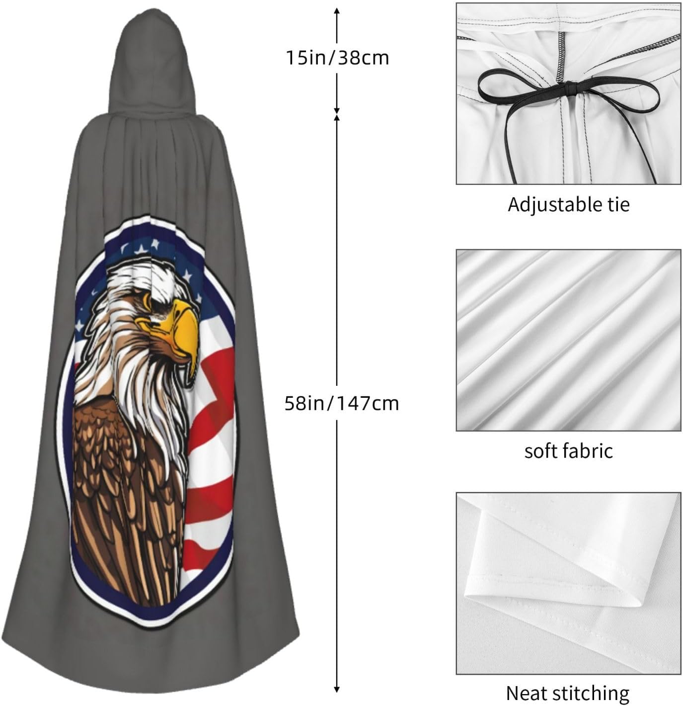 Realizzato in poliestere, questo mantello con stampa di aquila calva americana con cappuccio garantisce longevità e comfort. Le sue dimensioni ottimali assicurano una copertura completa per tutte le età, facendoti risaltare in qualsiasi evento. Che tu sia diretto per Halloween, un evento cosplay, un costume da palcoscenico, una festa in maschera, una festa a tema, un ballo o una convention di fumetti, questo mantello è una scelta ideale. Il suo design unico, completo di un grande cappuccio e cravatte collare. Inoltre, puoi dire addio ai metodi di pulizia complicati. Questo mantello con cappuccio con stampa American Bald Eagle è lavabile in lavatrice e a mano, offrendo una cura senza sforzo. Esci con stile e comfort con il nostro mantello con cappuccio, il tuo compagno per tutti gli eventi e le occasioni.