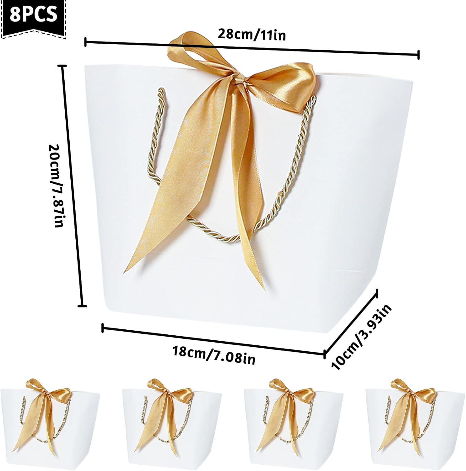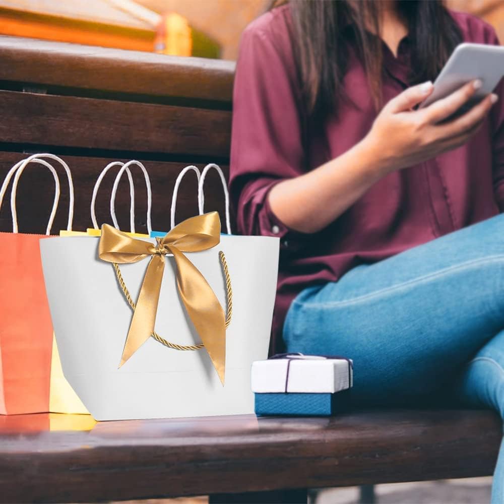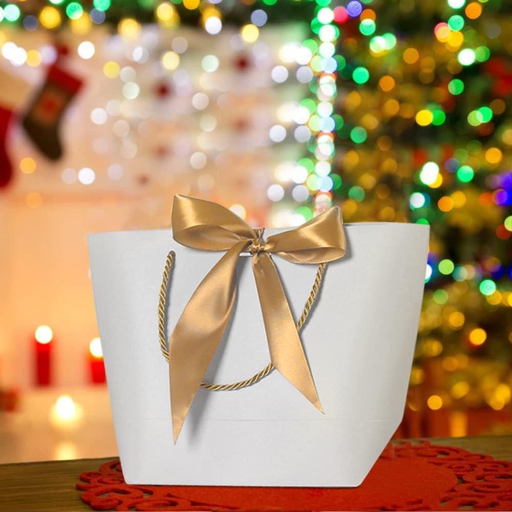 【8 sacchetti bianchi + 8 nastri dorati】Elegante sacchetto regalo, fiocco bianco. Ogni borsa è decorata con un bellissimo nastro. Una gamma di bellissimi colori e tasche lisce sembrano molto eleganti. Vengono utilizzati per realizzare sacchetti regalo e inviare benedizioni a parenti e amici durante il festival. 【Materiale di qualità】 La borsa regalo con manico è realizzata in cartone bianco di alta qualità. È liscio, di alta qualità, delicato, spesso e resistente e non facile da strappare. Può essere conservato a lungo. 【Design del nastro】 Puoi ottenere 8 nastri e 8 tasche. Il design della chiusura a nastro ti consente di legarli in bellissimi fiocchi, semplici, naturali, belli e pratici. 【Ampiamente usato】 I sacchetti di carta con nastri sono molto adatti per matrimoni, compleanni, feste, cene, feste di Pasqua, matrimoni, ecc. Sono bellissimi e possono essere usati come parte della decorazione della tavola. 【Confezione regalo perfetta】 Questi sacchetti regalo sono il modo migliore per fare regali amichevoli ad amici o familiari. Si applica anche alle borse della spesa, alle borse da festa, ai sacchetti di caramelle e alle borse da matrimonio.