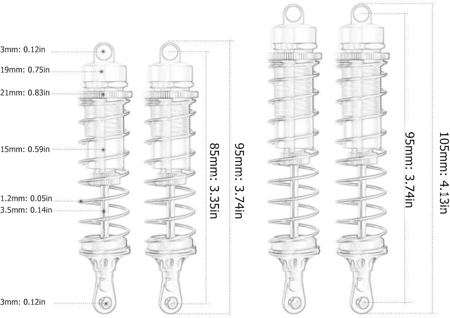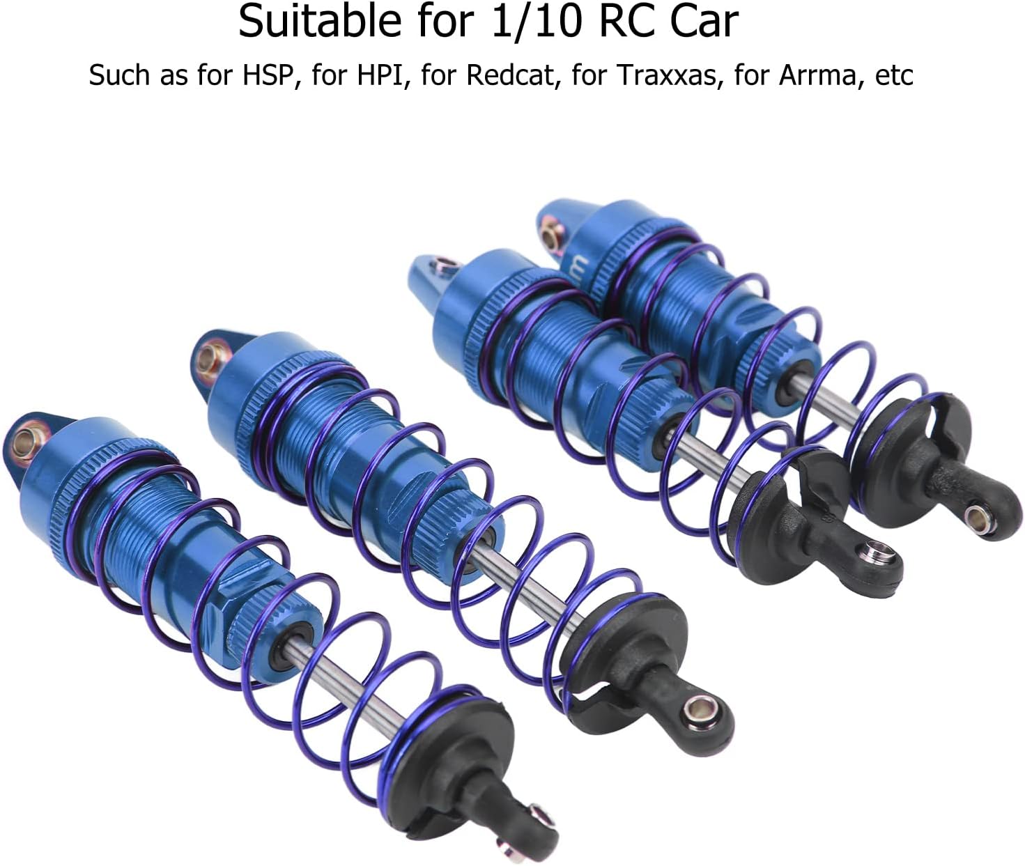 [Molla ad alta elasticità] Ammortizzatore a molla per auto RC con olio di smorzamento all'interno, l'elevata elasticità della molla garantisce l'effetto di smorzamento e migliora la stabilità 'auto RC. [Guida equilibrata] Gli ammortizzatori anteriori e posteriori RC sono ben realizzati per offrire un'esperienza di guida equilibrata e ridurre le vibrazioni dovute a condizioni stradali difficili. [Ampia compatibilità] Questo ammortizzatore a molla è adatto per auto RC 1/10, come HSP, HPI, Redcat, , Arrma, ecc., Facile da installare e rimuovere. [Regolabile] Ammortizzatori anteriori e posteriori RC lavorati a CNC con corpo filettato, pressione 'olio regolabile, rimovibile e possibilità di regolare il precarico. [Materiale Premium] L'ammortizzatore RC è realizzato in lega di alluminio premium e materiale plastico, che è resistente all'usura, previene la corrosione, l'elevata resistenza, la ruggine e la lunga durata.