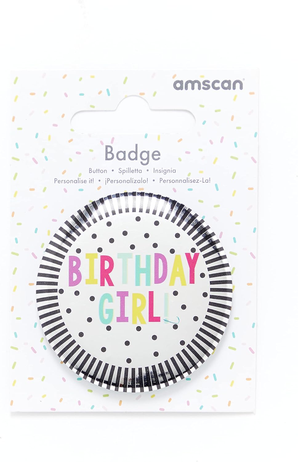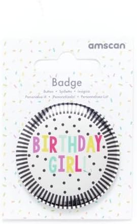 Un distintivo d'argento con un bordo a righe, motivo a pois neri e un messaggio 'Birthday Girl' Far scorrere indietro per attaccare ai vestiti o cartoncino Dimensioni: 6 cm Numero modello: 9912103