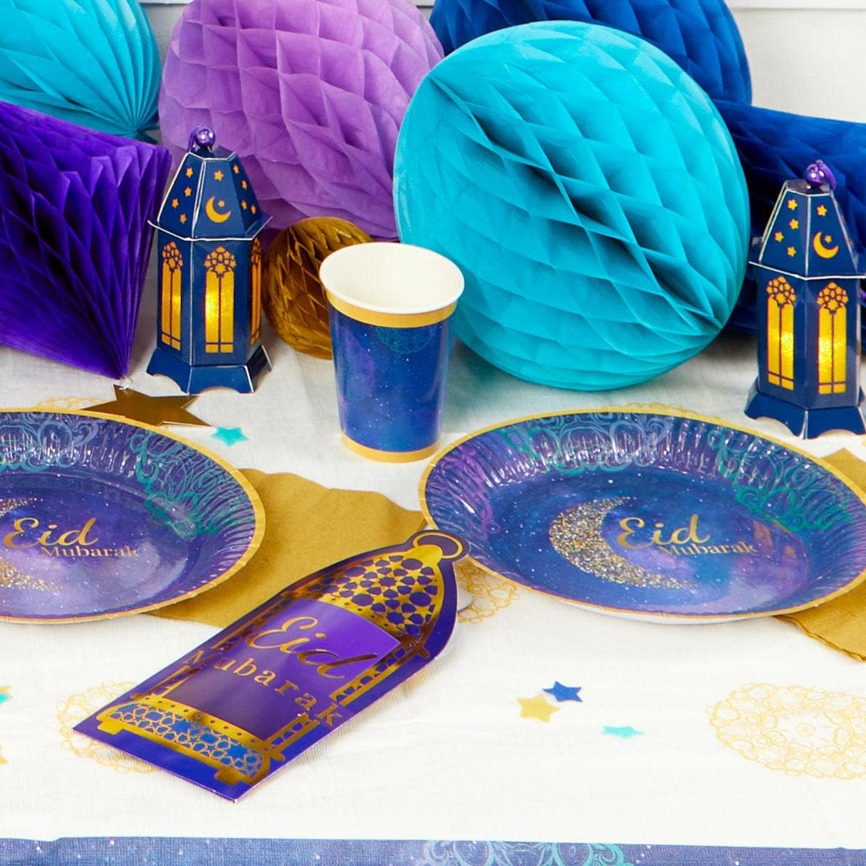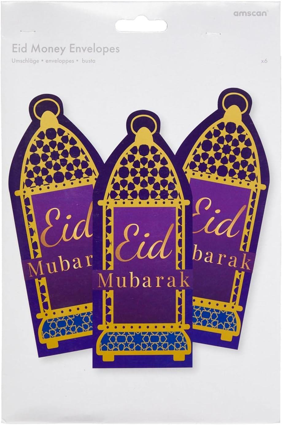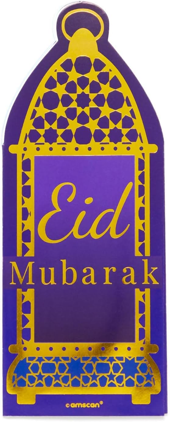 Festeggia Eid con stile con belle forniture per feste. Buste di denaro a forma di lanterna tradizionale con un messaggio "Eid Mubarak". Materiale: carta Confezione da 6