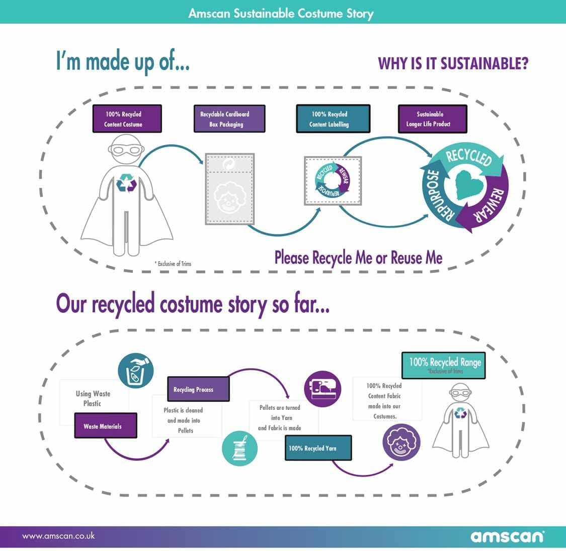 Questi fantastici costumi eco-sostenibili di Halloween sono stati concepiti per essere il più possibile rispettosi dell'ambiente, realizzati con 100% materiali riciclati e lavabili in lavatrice per essere riutilizzati quante volte vuoi. I colori sono applicati sui costumi senza l'aggiunta di glitter o ulteriori processi e sono stati rimossi tutti gli elementi in plastica dalla confezione in modo da renderla interamente riciclabile. La carta inserita all'interno può essere riutilizzata dai vostri bambini per creare una graziosa borsa colorabile per Dolcetto o Scherzetto! Naturalmente, l'intera linea soddisfa i requisiti della direttiva EU sulla sicurezza dei giocattoli.