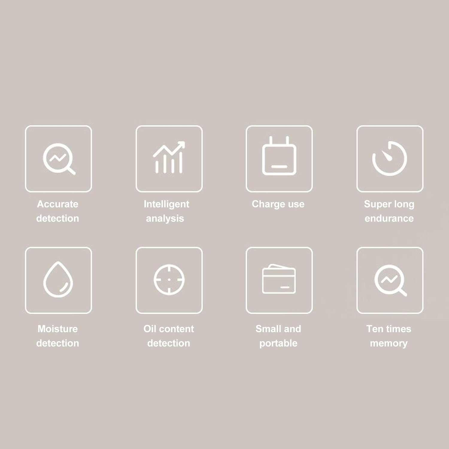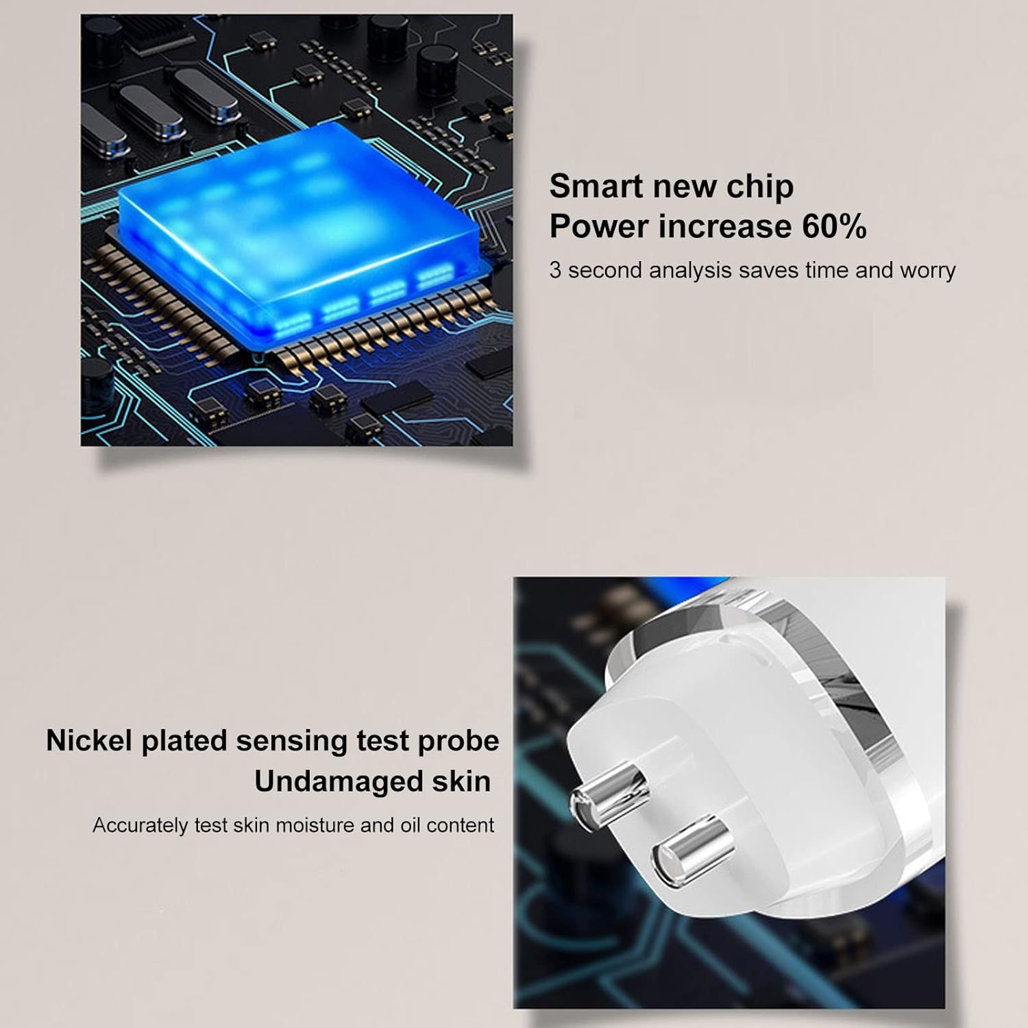 Analisi intelligente: utilizza un sensore intelligente in grado di rilevare gli standard di umidità e olio della pelle e analizzarne le condizioni in soli 3 secondi. Placcato in nichel: questo prodotto con sonda è realizzato in materiale nichelato, non invasivo e delicato sulla pelle, garantendo risultati accurati senza danneggiare la pelle. Indicatore luminoso a 3 colori: mostra chiaramente le condizioni della tua pelle. Il verde rappresenta un sano equilibrio tra umidità e olio, mentre il rosso rappresenta la secchezza. Il giallo indica la saturazione con umidità e olio. Scena adatta: puoi facilmente regolare la routine di cura della pelle misurando gli standard di umidità e olio della pelle. È uno strumento essenziale per chiunque voglia mantenere la propria pelle sana e luminosa. Chip intelligente: con un aumento delle prestazioni fino al 60%, consente di risparmiare tempo fornendo allo stesso tempo una misurazione accurata dell'umidità della pelle e degli standard di olio.