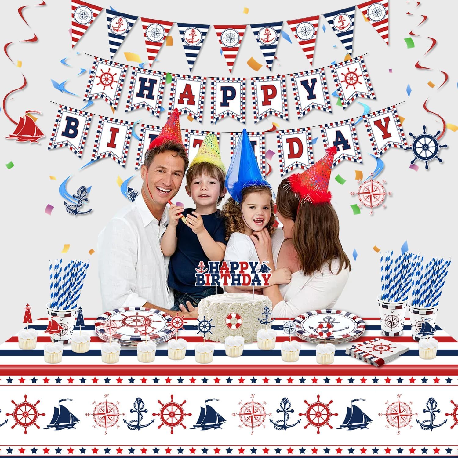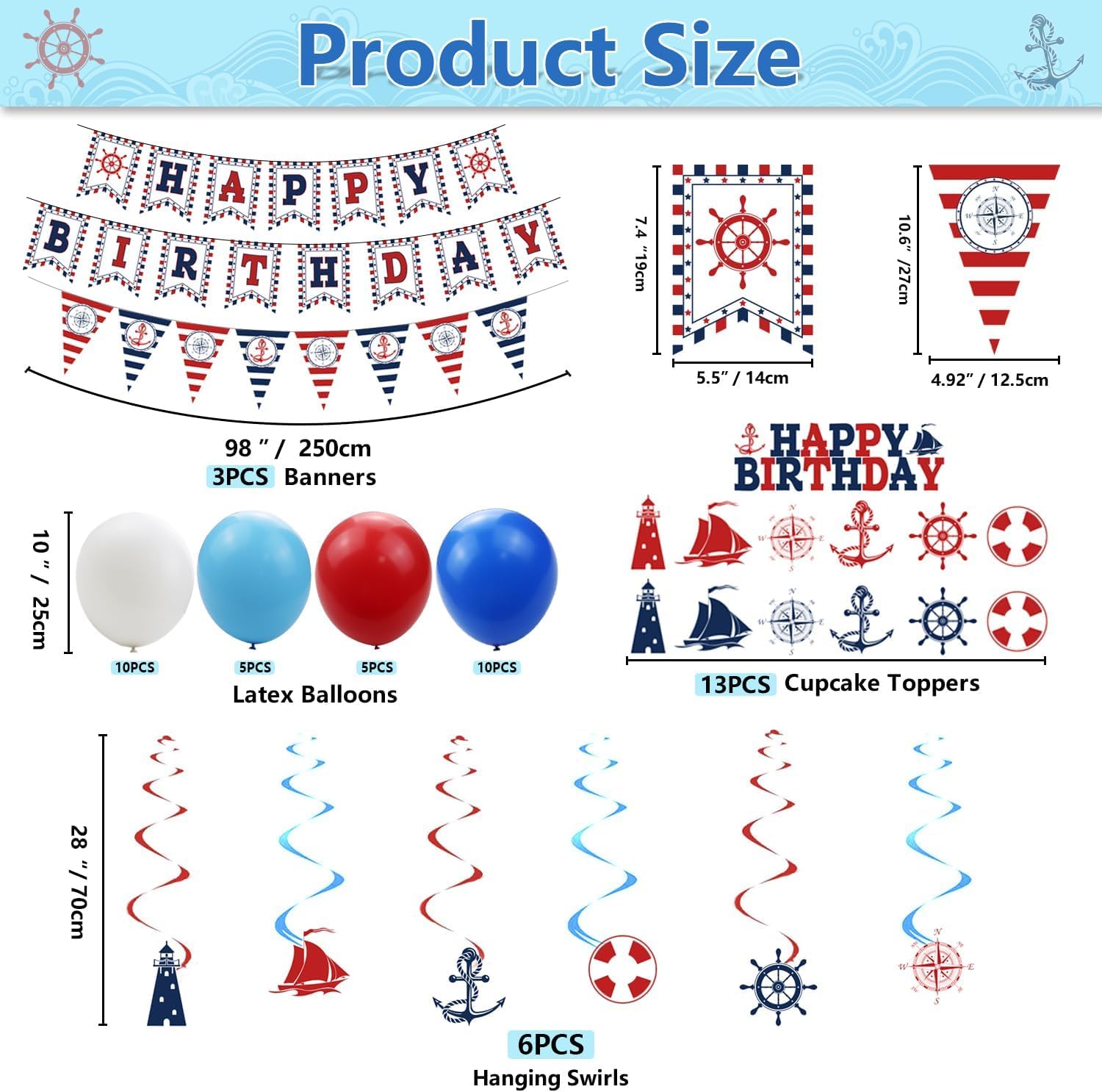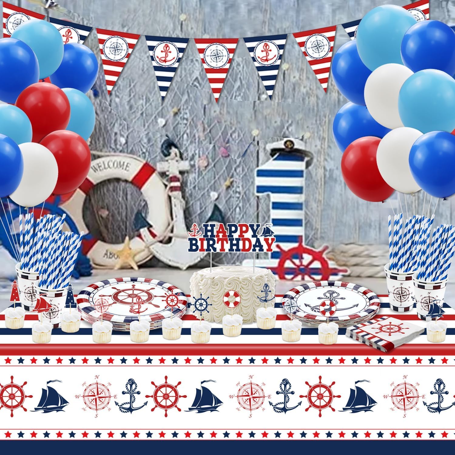 La confezione include: 20 piatti piani di carta, 23 cm; 20 piatti da dessert di carta, 18 cm, 20 tovaglioli per feste, 20 bicchieri di carta. 30 palloncini in lattice (blu, bianco, blu, bianco, rosso), 13 decorazioni per torte, 6 elementi nautici da appendere. 1 tovaglia nautica (130 x 220 cm), 1 striscione con elementi nautici (12,5 x 27 cm, lunghezza 2,5 m), 1 striscione di buon compleanno (14 x 19 cm, lunghezza 2,5 m). Questa confezione include tutte le decorazioni di cui hai bisogno per la festa di compleanno a tema nautico del tuo piccolo. Design a tema nautico: questi kit di decorazione per feste di compleanno nautici sono progettati in classici colori nautici, blu navy, rosso e bianco, l'ancora, il timone è contrassegnato sulla tovaglia usa e getta e sul centro dei piatti di carta, che sarà una grande aggiunta alla tua festa a tema nautico. Occasioni applicabili: il set di piatti di carta, bicchieri di carta e tovaglioli è perfetto per feste di compleanno nautiche, baby shower nautici, feste a tema oceanico, feste a tema marinaio, ahoy è un ragazzo baby shower, festa a tema ancora o qualsiasi altro evento a tema nautico per bambini e adulti. Alta qualità: piatti, tazze, decorazioni per torte e tovaglioli sono realizzati in carta spessa, leggera e sicura. Le tovaglie nautiche sono realizzate in plastica, impermeabile, durevole e resistente alle macchie, taglia unica adatta alla maggior parte dei tavoli e potrebbe proteggere bene il tavolo. Facile da usare: le forniture per feste nautiche sono usa e getta di carta, basta gettare via i piatti di carta dopo la festa. E gli striscioni sono stati pre-infilati, non hanno bisogno di montaggio fai da te, appesi alla parete o alla finestra, e i vortici e i palloncini appesi sono facili da montare. Risparmierai tempo ed energia per goderti la festa nautica!