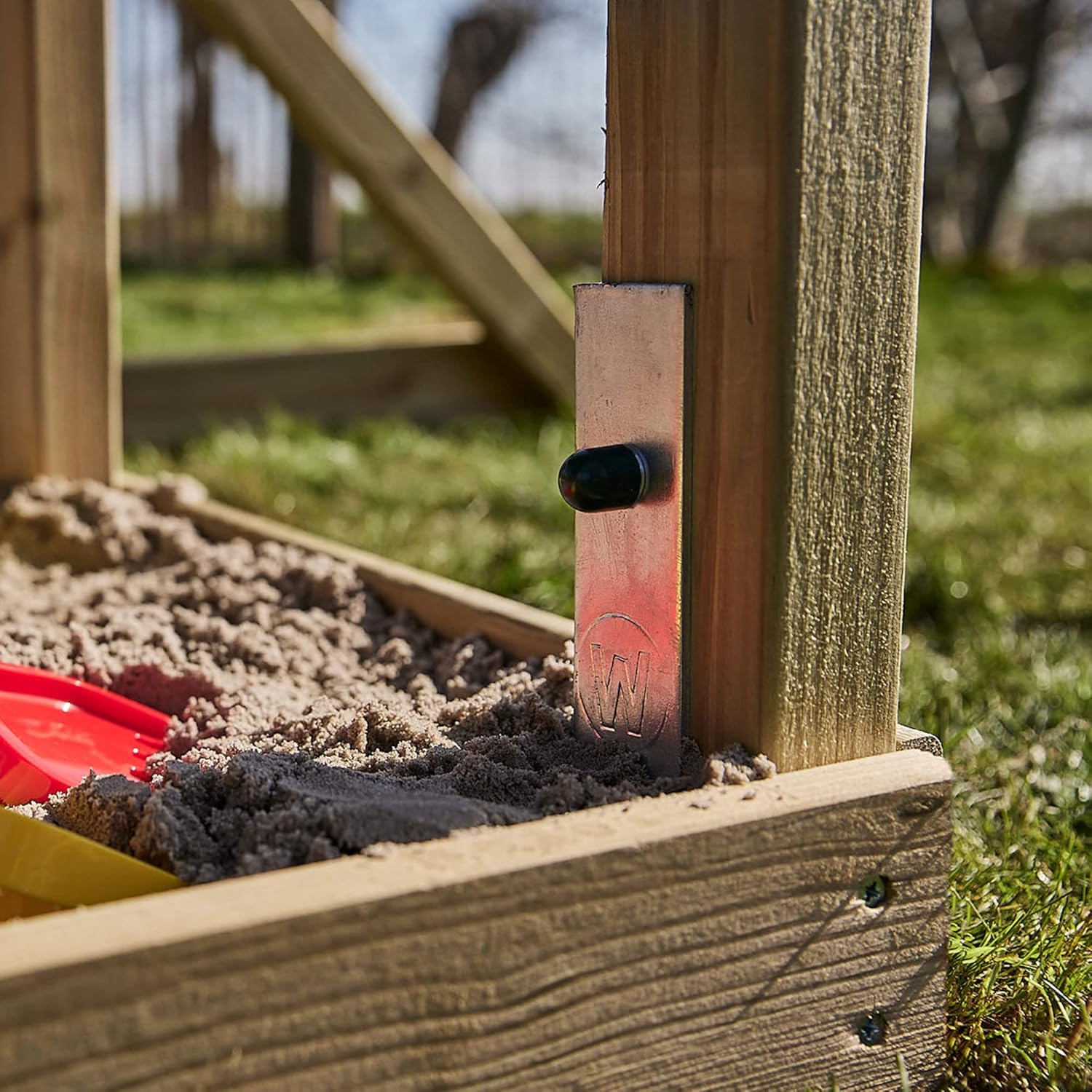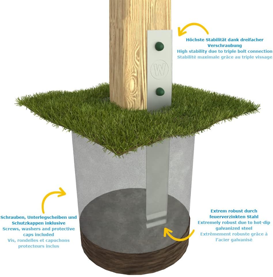 Estremamente resistente alle intemperie: i nostri ancoraggi angolari di alta qualità in acciaio zincato a caldo sono estremamente resistenti alle intemperie e hanno le dimensioni 50x4,5x4,5 cm, uno spessore di 3 mm e un foro di Ø10 mm. Pratico set completo: il set di ancoraggio a terra contiene anche il numero adeguato di viti, rondelle e tappi di copertura, quindi nulla ostacola l'installazione della tua torre di gioco. La sicurezza viene prima di tutto: questo set di ancoraggi da cementare è universale ed è adatto a pali di diverso spessore, come 7x4,5 cm, 9x4,5 cm, 7x7 cm e 9x9 cm Facile da installare: gli ancoraggi angolari sono ideali per tutte le torri gioco e altalene Wickey. Gli ancoraggi angolari devono essere fissati all'interno dei montanti di supporto e garantiscono un'elevata stabilità. Offriamo una garanzia di 10 anni sulla nostra vasta gamma di attrezzature da gioco in legno di alta qualità come altalene, torri da gioco e palafitte se acquisti contemporaneamente i nostri ancoraggi angolari Wickey SolidLock.