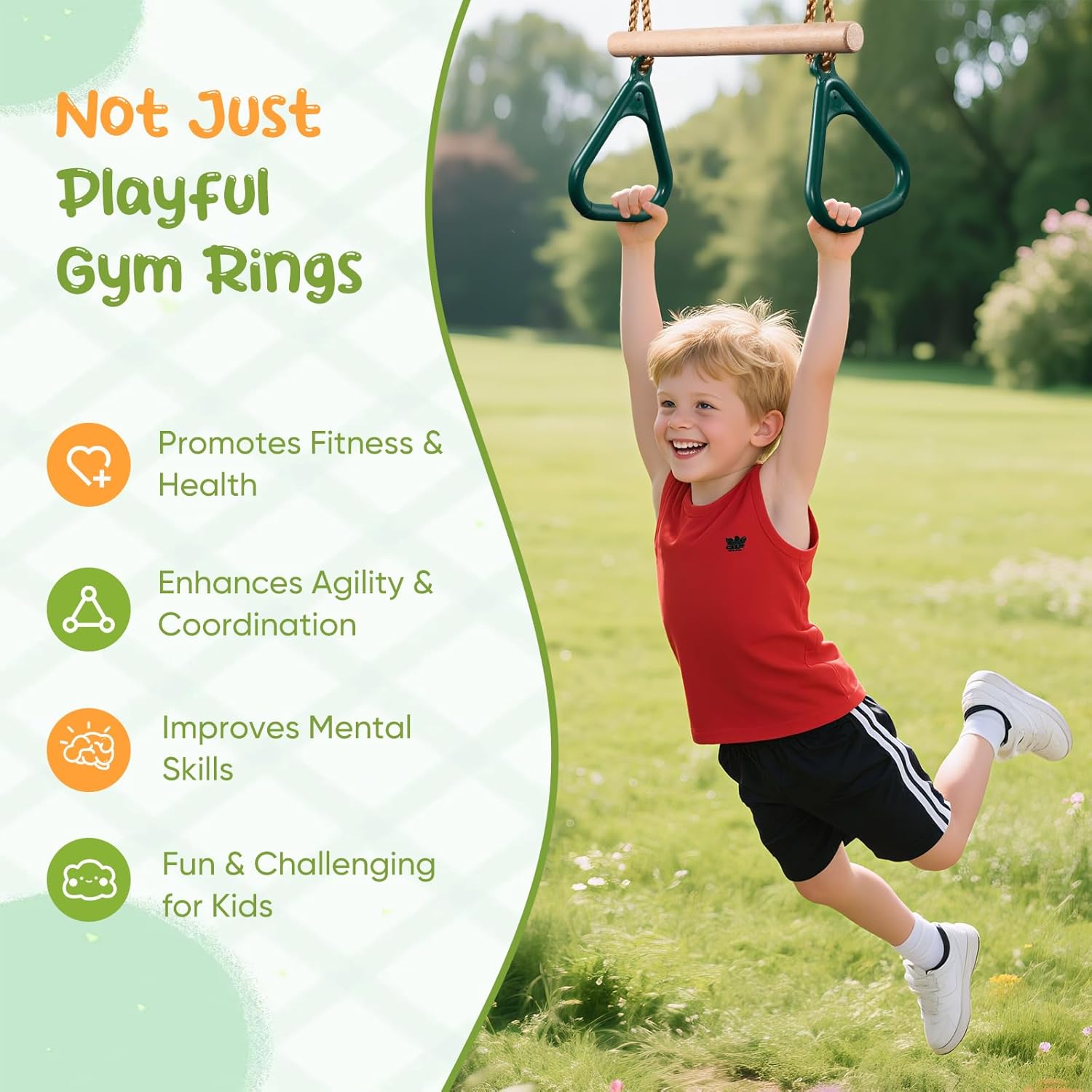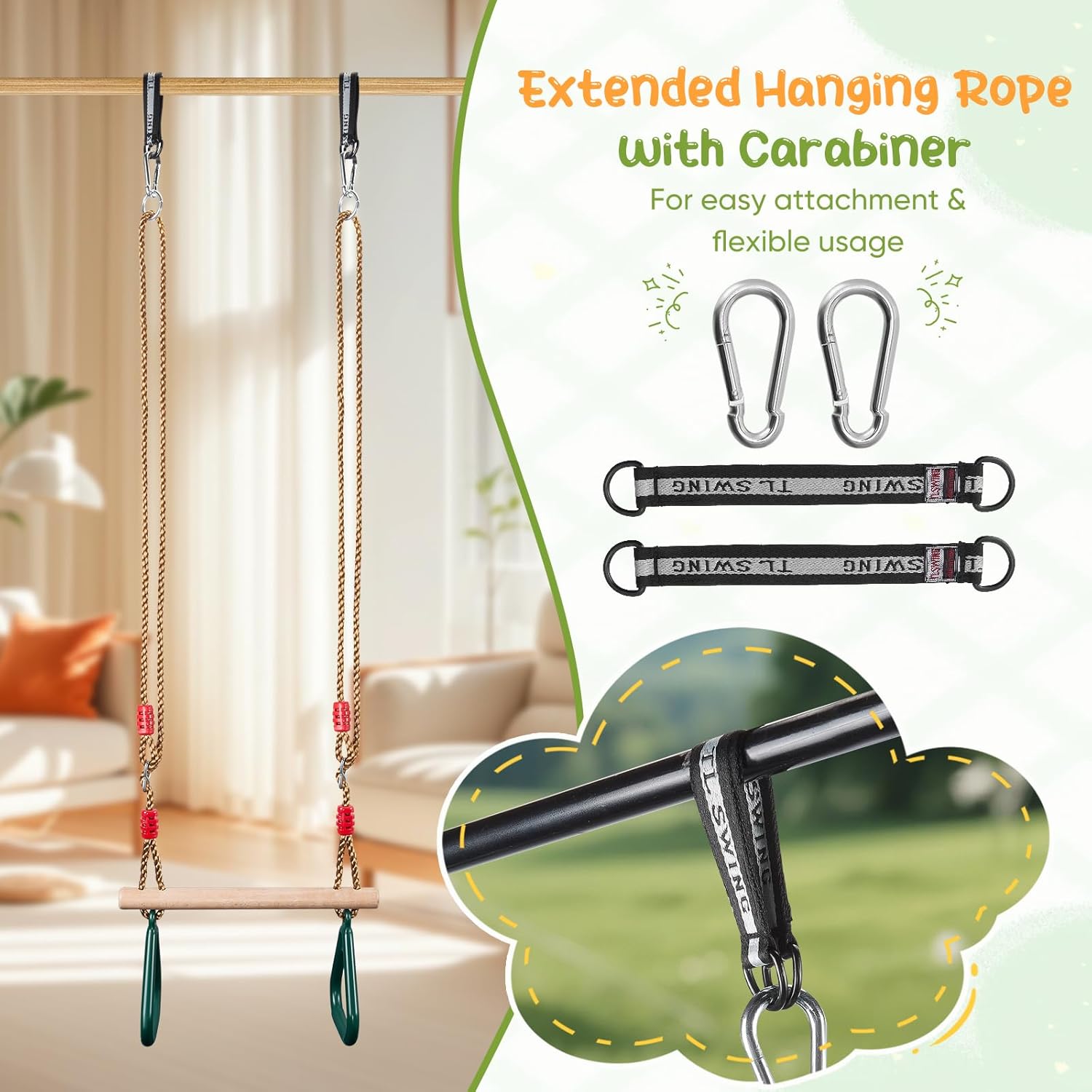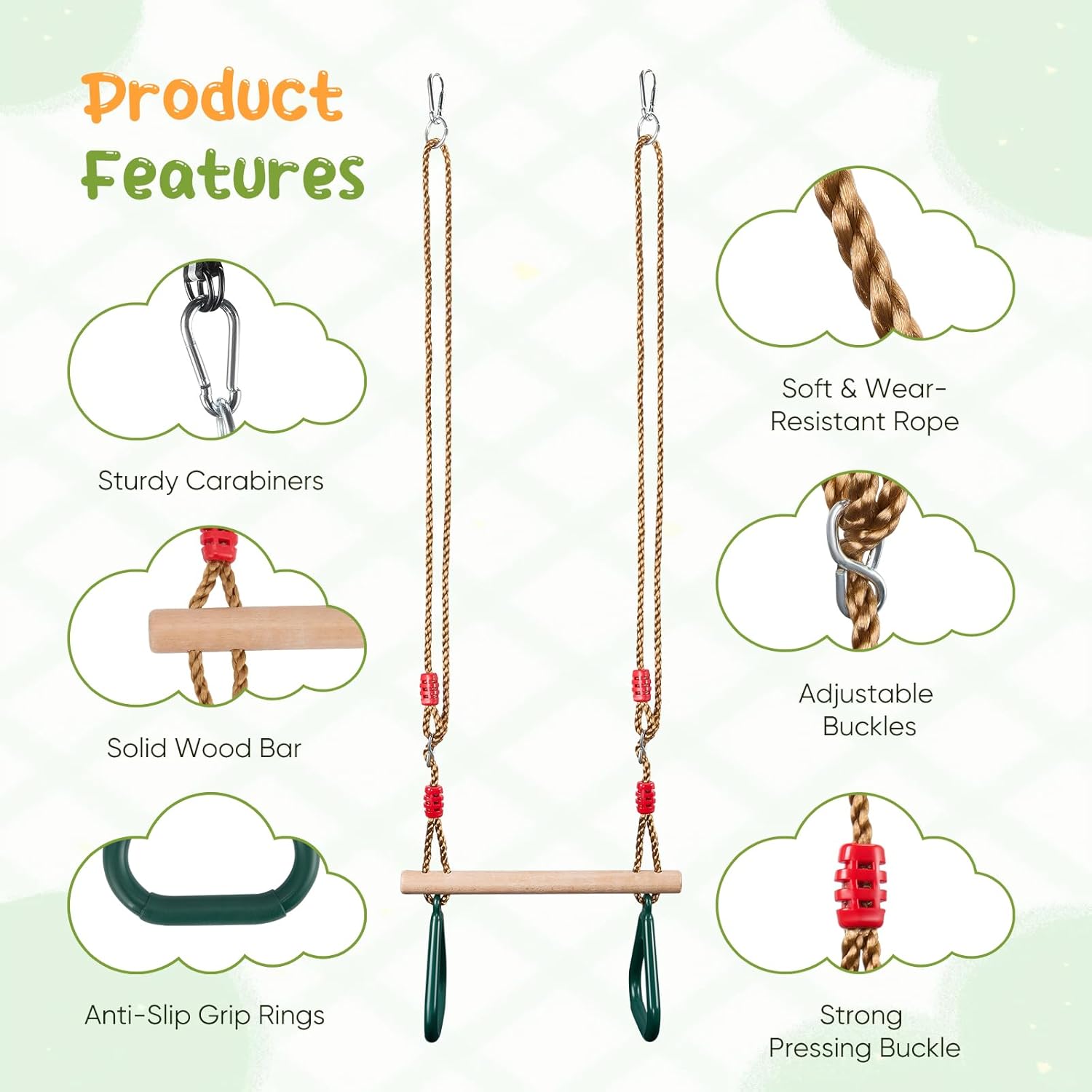 Adatto ai bambini e sicuro: il manico dell'altalena è ergonomico e leggero, con una superficie antiscivolo 3D per una presa ottimale. Tutti gli angoli sono accuratamente arrotondati per ridurre al minimo il rischio di lesioni, anche durante il gioco intenso. Lunghezza regolabile: che venga utilizzata come altalena per bambini piccoli o per bambini in crescita, la nostra altalena ad anello cresce con il tuo bambino! La lunghezza della corda è regolabile in modo flessibile, fino a 1,45 metri. La corda dell'altalena è comoda da impugnare e fissata con una robusta clip. Altalena da esterno: chi non ha bisogno di un parco giochi al giorno d'oggi? La nostra altalena per bambini è l'accessorio ideale per le torrette da gioco da giardino. La nostra altalena da esterno per bambini funziona perfettamente anche come altalena da interno, ad esempio appesa al telaio di una porta o come altalena nella cameretta dei bambini. Pronto all'uso: la corda dell'altalena è dotata di robusti fori di fissaggio, che consentono di fissare rapidamente l'altalena a qualsiasi telaio o altro supporto adatto e iniziare a usarla! Facile da pulire e resistente: il manico dell'altalena (compresa la corda e l'anello) è resistente alle intemperie e facile da pulire.