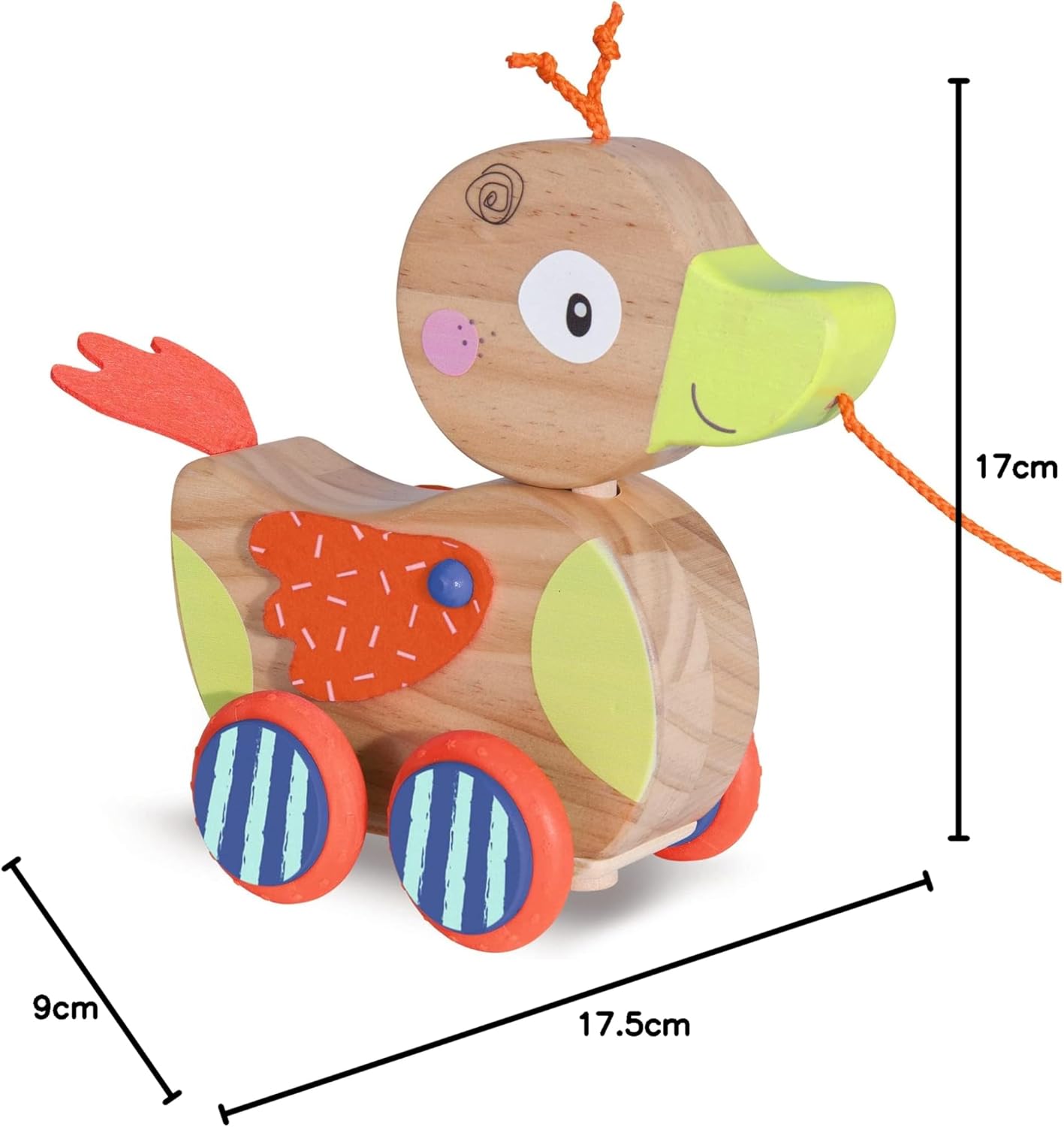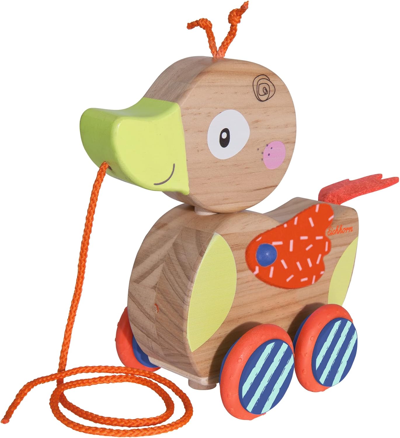 Promuove la mobilità: l'anatra motiva i bambini a partire da un anno a fare più esercizio. Fa dei rumori: quando viene tirata, la testa dell'anatra oscilla ed emette dei ciarlatini. Silenzioso: grazie ai battistrada in gomma, le ruote girano silenziosamente e non lasciano tracce, ideali per l'uso in interni. Lavorazione di alta qualità: l'anatra da traino è realizzata in legno sostenibile certificato FSC al 100% e combina legno di pino e betulla per una qualità robusta. Eichhorn – Giocattoli in legno con tradizione – Produciamo giocattoli in legno di qualità da oltre 75 anni. Preziosi dal punto di vista educativo, i nostri prodotti promuovono le capacità motorie e la creatività fin dalla prima infanzia attraverso una combinazione di sensazione, impilamento, incollaggio, spinta e avvitamento.