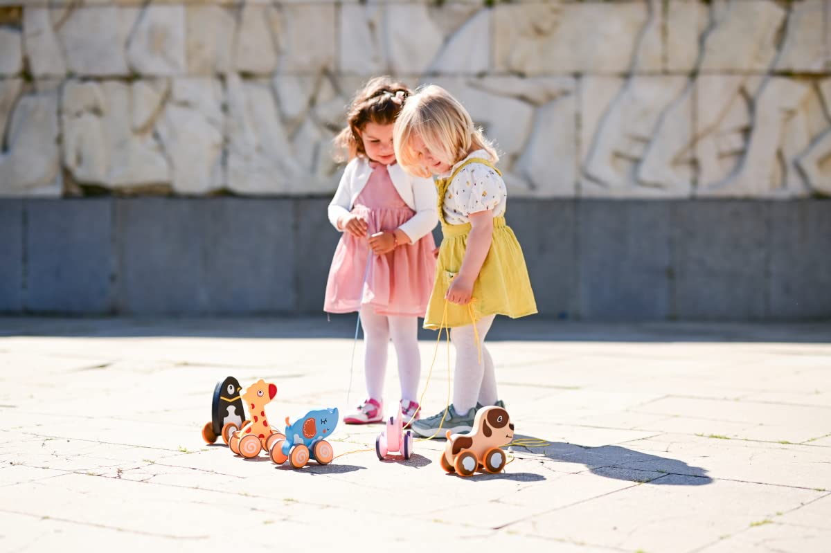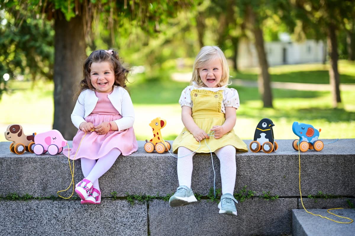 Giocattolo da trascinare con un divertente design di animali, molto divertente per i bambini dai 9 mesi in su quando muovono i primi passi con 4 ruote, colori vivaci, cordino per tirare, superficie liscia senza bordi per giocare all'interno e all'esterno