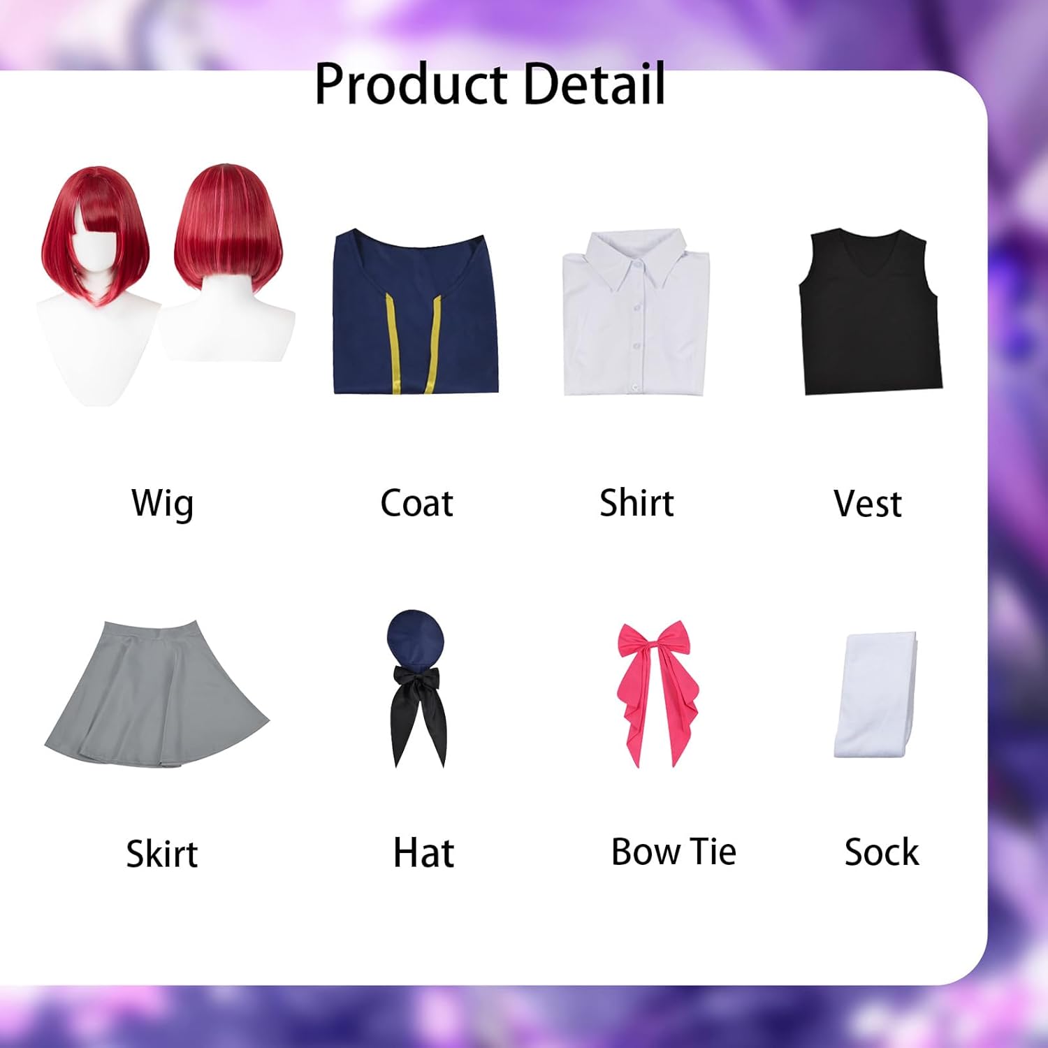 Nome prodotto: Set completo di costumi cosplay anime Materiale: Poliestere Tabella taglie --XS-- Altezza: 146-152 cm, Busto: 77-80 cm, Vita: 59-62 cm, Fianchi: 79-82 cm --S-- Altezza: 152-158 cm, Busto: 81-84 cm, Vita: 63-66 cm, Fianchi: 83-86 cm --M-- Altezza: 158-166 cm, Busto: 85-88 cm, Vita: 67-70 cm, Fianchi: 87-90 cm --L-- Altezza: 166-172 cm, Busto: 89-92 cm, Vita: 71-74 cm, Fianchi: 91-94 cm --XL-- Altezza: 172-178 cm, Busto: 93-96 cm, Vita: 75-78 cm, Fianchi: 95-98 cm --2XL-- Altezza: 178-184 cm, Busto: 97-100 cm, Vita: 79-81 cm, Fianchi: 99-105 cm --3XL-- Altezza: 184-190 cm, Busto: 101-104 cm, Vita: 82-85 cm, Fianchi: 105-110 cm The shop also offers costumes of other characters, such as: Marin Kitagawa, Rizu-Kyun, Marin Kitagawa JK, Kitagawa Marin Maid, Kitagawa Marin, Gojo Wakana, Marin Kitagawa Kimono, Glinda, Elphaha, Kasane Teto, Hoshino Ai New Skin, Hoshino Ai, Arima Kana Hoshino Rubii, Arima Kana, Hoshino Aquamarin, Kurokawa Akane, Himekawa Taiki, Arima Kana.