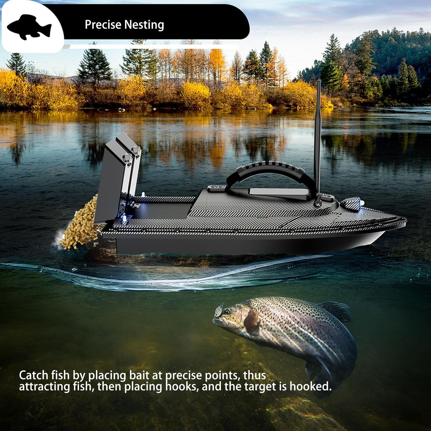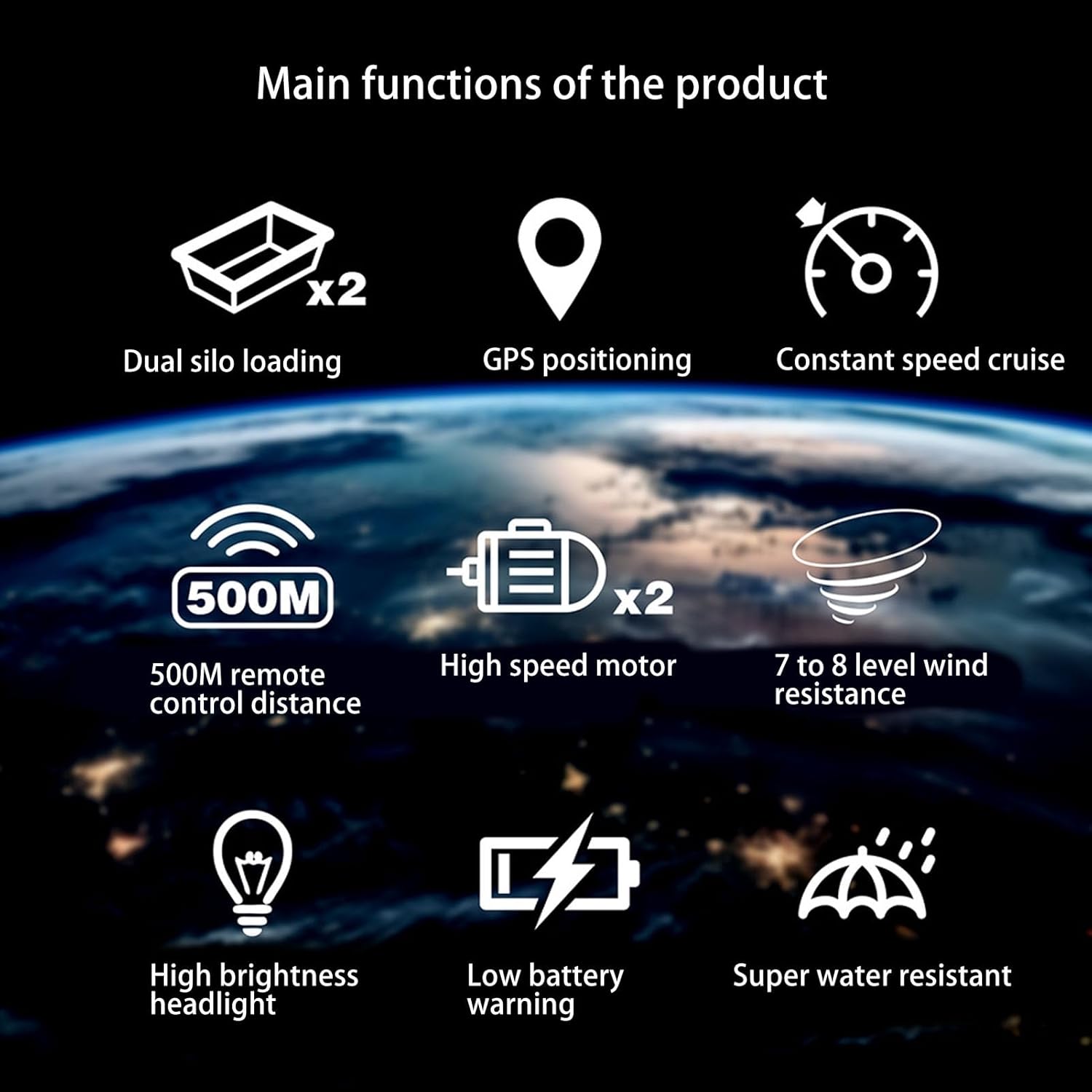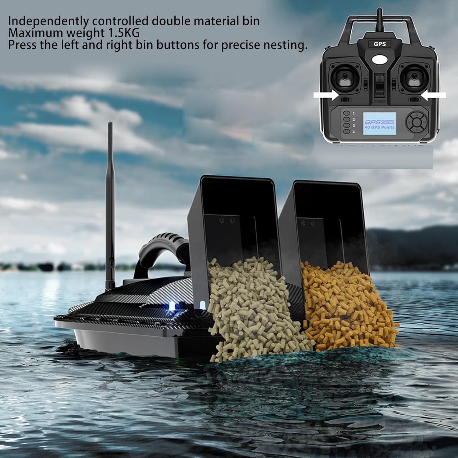 Doppi motori con copertura protettiva: progettati con doppi motori e coperture protettive per prevenire efficacemente le interferenze delle piante acquatiche e dei detriti sulle eliche. Il vano batteria situato al centro dello scafo offre grande equilibrio e stabilità per prestazioni ottimali. Distanza del telecomando fino a 500 metri con trasmissione stabile del segnale. Robusto materiale ABS: il corpo principale della barca è costruito utilizzando materiale tecnico ABS con stampaggio a iniezione una tantum, fornendo un'eccezionale resistenza agli urti e all'usura. Può resistere a forti venti e onde, garantendo l'impermeabilità per evitare problemi di perdite ed è in grado di funzionare normalmente con di forza da 7 a 8. Pilota automatico a velocità costante: goditi l'uso a mani libere con la funzione di pilota automatico a velocità costante che guida la barca in linea retta verso il punto di pesca designato. Corregge automaticamente l'imbardata e regola la velocità del motore con un giroscopio integrato per garantire una navigazione diritta sotto onde e carico. Tramogge a doppia esca: il design a doppia tramoggia per esca consente la costruzione precisa di nidificazioni in vasti ambienti di pesca. Ogni tramoggia può essere utilizzata separatamente, con una capacità di carico di circa 1,5 kg. Luce notturna di governo: le luci di navigazione su entrambi i lati della barca indicano le istruzioni di governo dal telecomando con i corrispondenti messaggi di luci rosse. Ciò consente agli operatori di identificare la direzione dell'imbarcazione in base alle luci, mentre il faro luminoso aiuta a riconoscere la direzione di navigazione dell'imbarcazione durante l'utilizzo a lunga distanza.
