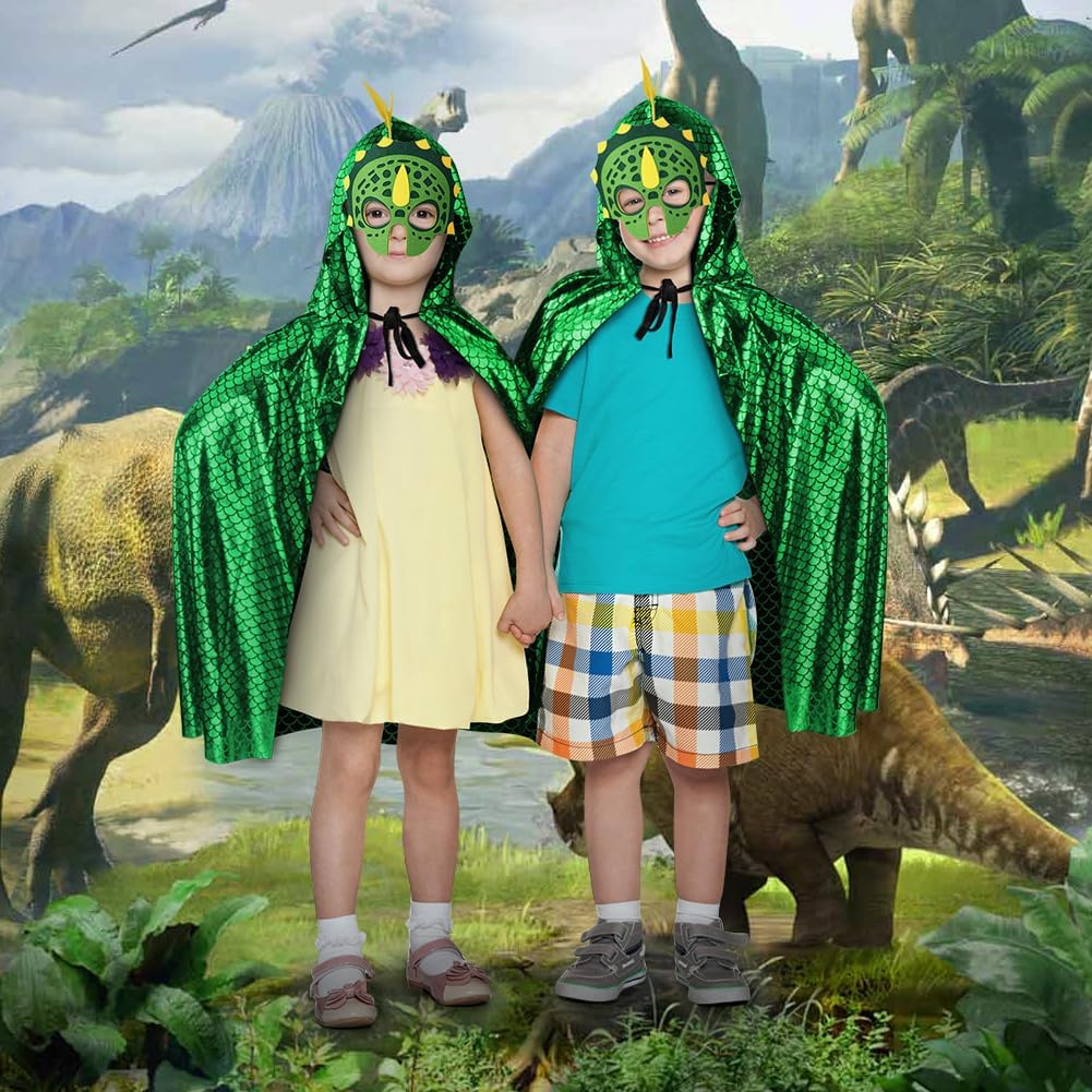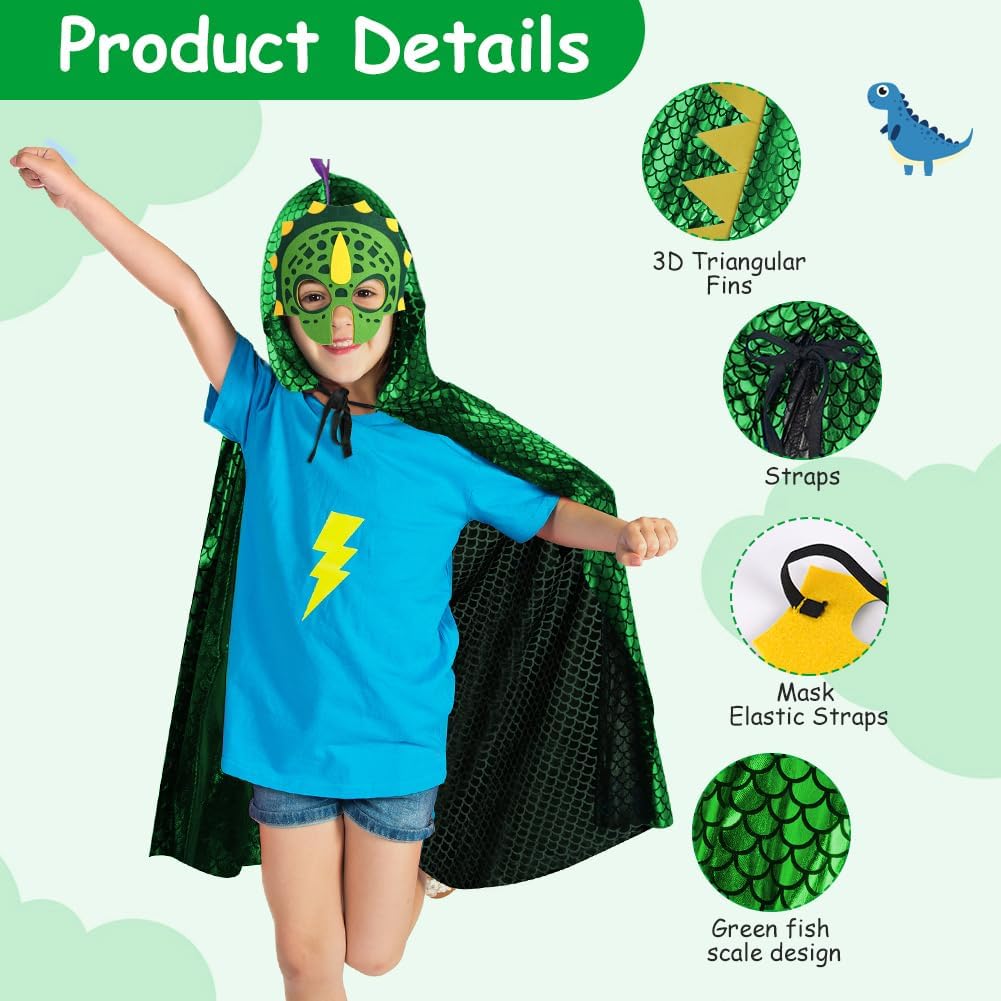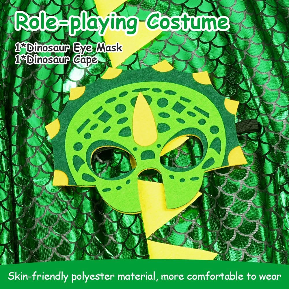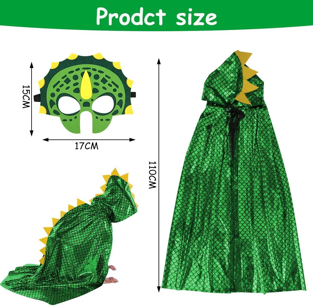 SET MANTELLO DA DINOSAURO PER BAMBINI: Riceverai 1 pezzo di mantello da dinosauro di colore verde cartone animato, 1 pezzo di maschera da dinosauro, perfetto per le esigenze di vestizione del tuo bambino, rendendo il costume del bambino più carino, i bambini possono mescolarsi e abbinarsi, perfetto per vestirsi per i più piccoli. Giochi.