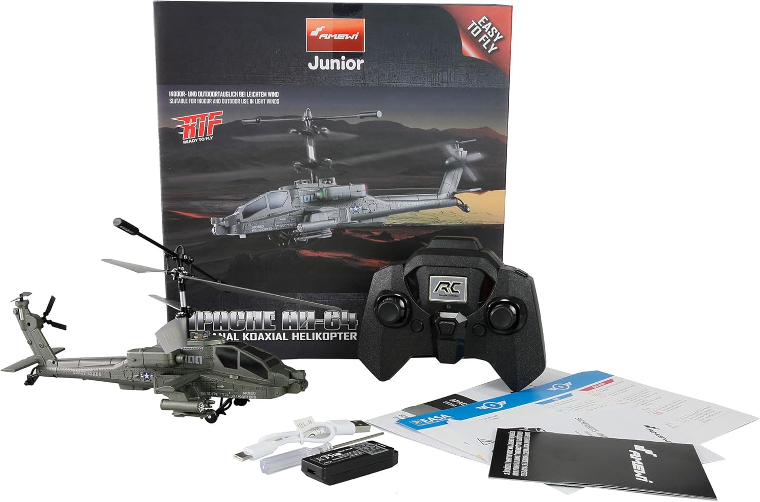 Particolarmente adatto ai principianti: grazie al sistema di rotore coassiale è garantito un comportamento di volo molto stabile, così i principianti possono giocare tranquillamente al loro nuovo hobby Avvio automatico, sollevamento automatico e atterraggio automatico premendo un pulsante: le funzioni di supporto facilitano il controllo quando necessario e aumentano la sicurezza Illuminazione a LED: eccellente visibilità, anche in condizioni di scarsa illuminazione e commutabile tramite telecomando Sistema a prova di interferenze da 2,4 GHz, scafo in plastica leggero e robusto, tempo di volo fino a 12 minuti Adatto per esterni in caso di vento leggero, facile sostituzione della batteria