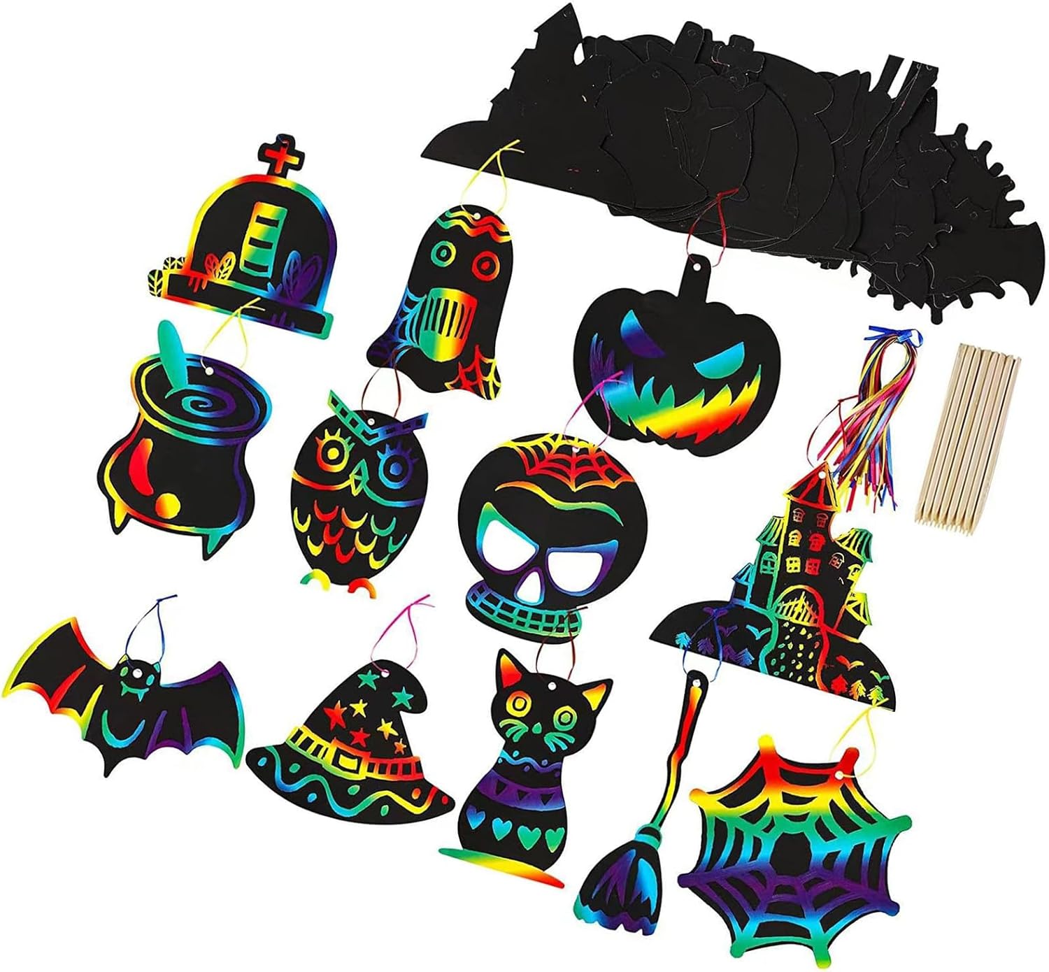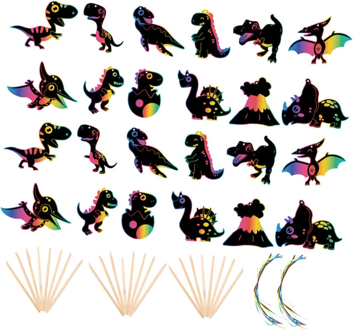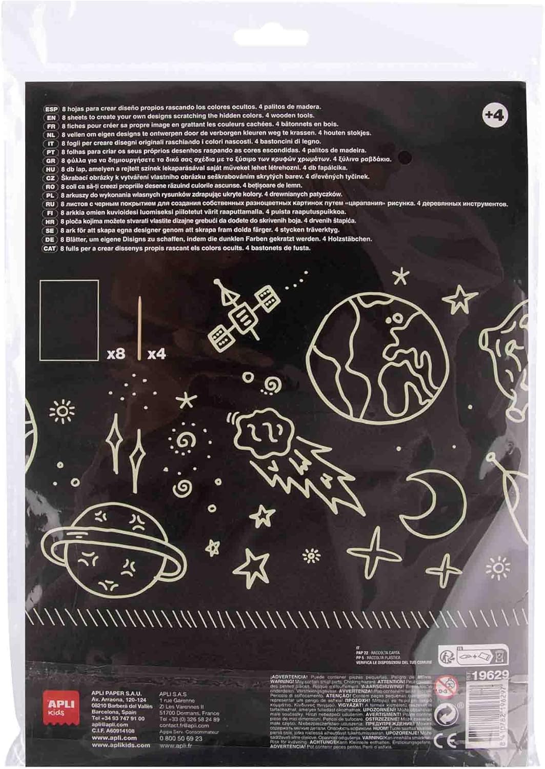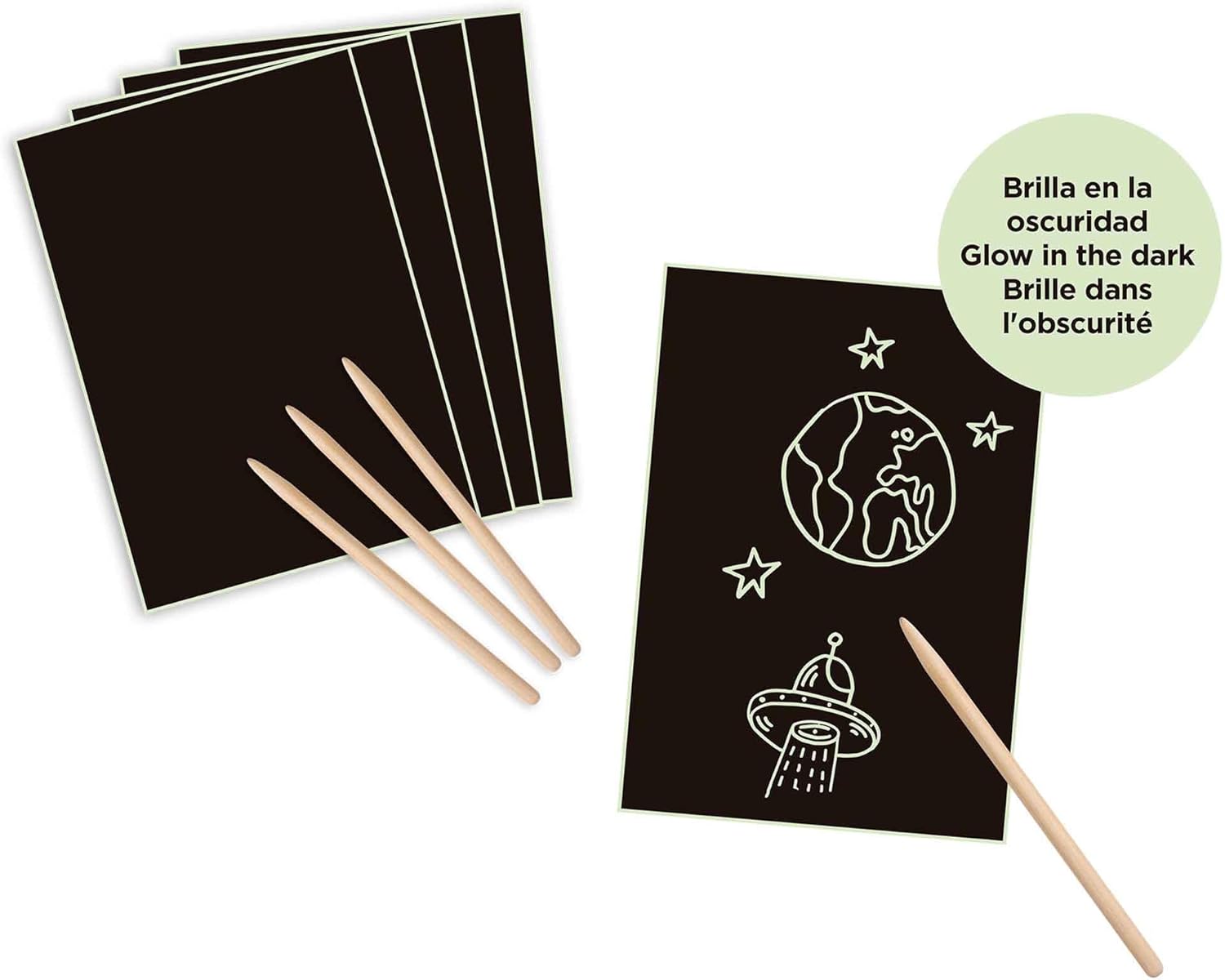 Magic Scratch GLOW IN THE DARK: Graffette luminescenti in formato A4 (210 x 297 mm). Attività divertente da svolgere da solo o in gruppo. Contenuto della confezione: ogni sacchetto contiene 8 biglietti da grattare in formato A4 (210 x 297 mm), accompagnati da 4 bastoncini di legno per raschiare e rivelare i disegni nascosti. Man mano che i bambini raschiano la superficie, appaiono i modelli. Una volta che la carta è stata raschiata e il disegno rivelato, i bambini possono spegnere le luci e contemplare i disegni che brillano al buio. Importante: per "ricaricare" l'effetto fosforescente, posizionare il foglio sotto una fonte di luce per almeno mezz'ora. Quindi spegni le luci per far funzionare la magia! Perfetto per stimolare l'immaginazione dei bambini nelle loro creazioni. Comodo da usare ovunque, soprattutto in viaggio Età: ideale per bambini dai 4 anni in su.