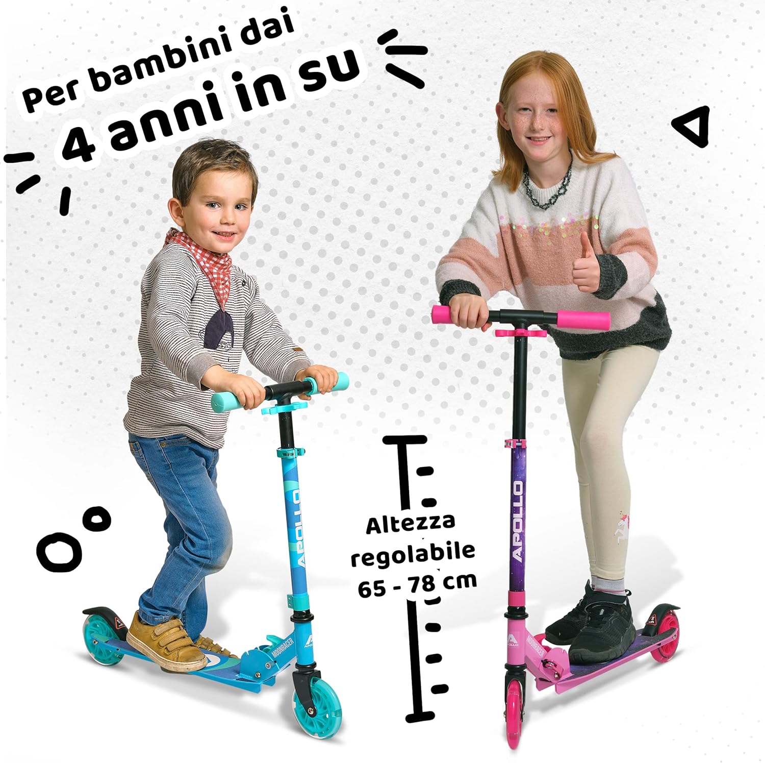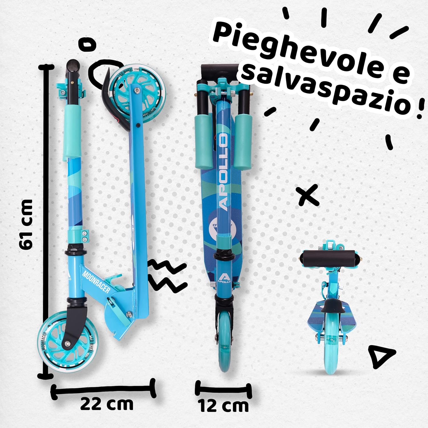 DIVERTIMENTO LUMINOSO - Il monopattino ruote grandi Apollo è pieghevole e regolabile in altezza, ed è dotato di ammortizzatori e cuscinetti a sfera Abec 7. Le ruote luminose a LED da 125 mm rendono il nostro monopattino per bambini una vera e propria attrazione per gli occhi! GUIDA SICURA - Il monopattino bambino 2 ruote è adatto ai bambini dai 4 anni in su e offre il massimo comfort di guida. Tuttavia, nulla toglie che sia super divertente anche per i bambini più grandi, dai 7 anni in su. Ampiamente versatile, questo monopattino è adatto ai bambini di tutte le età! ALTA QUALITÀ - Ultraleggero (2,1 kg) e stabile, sarà amato da tutti i bambini. Le silenziose ruote LED garantiscono il massimo comfort e le impugnature in silicone offrono una presa sicura. Progettato con le migliori caratteristiche di guida, questo monopattino con ruote a LED è in grado di regalare sorrisi a bambini e bambine. RUOTE A LED ALLA MODA - Grazie al design colorato e alle ruote a LED, il monopattino 4 anni entusiasmerà tutti i bambini. Le ruote a LED si illuminano con il movimento e non sono necessarie batterie per il loro funzionamento. SISTEMA A 3 CLICK - Grazie al pratico meccanismo con sgancio rapido, il manubrio si piega in pochi secondi e il monopattino pieghevole può essere riposto occupando uno spazio minimo. Inoltre, l'altezza del manubrio è regolabile da 65 a 78 cm, quindi il monopattino è adatto ai bambini dai 4 anni in su, o più piccoli!