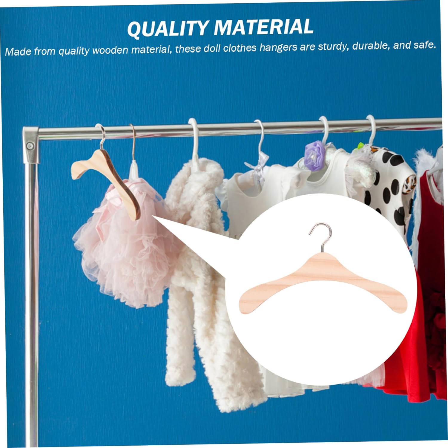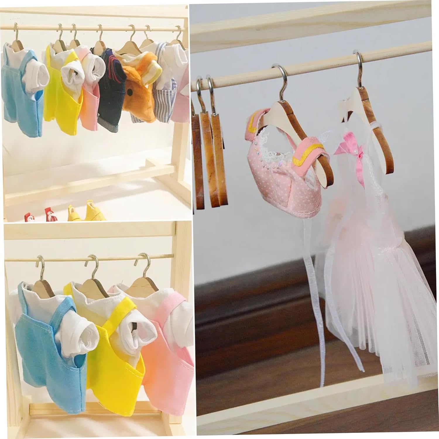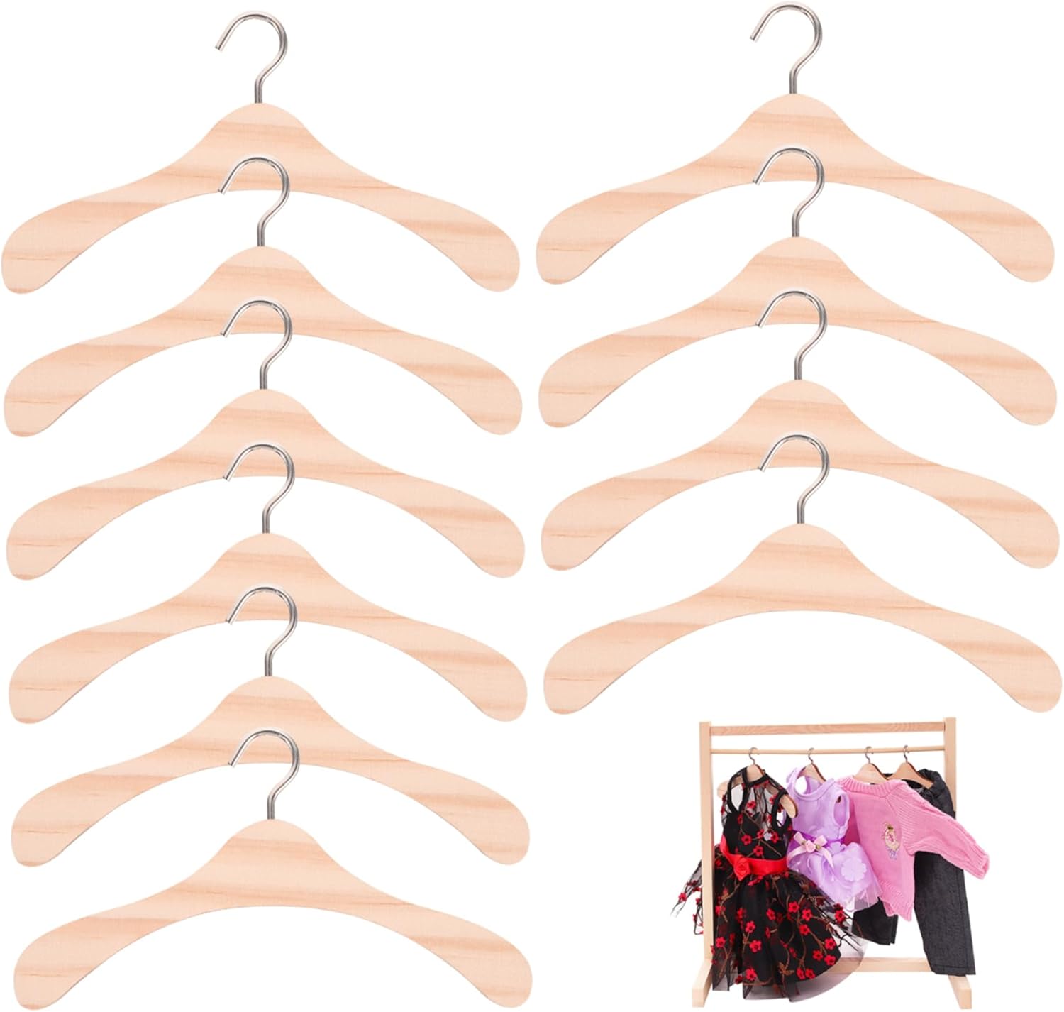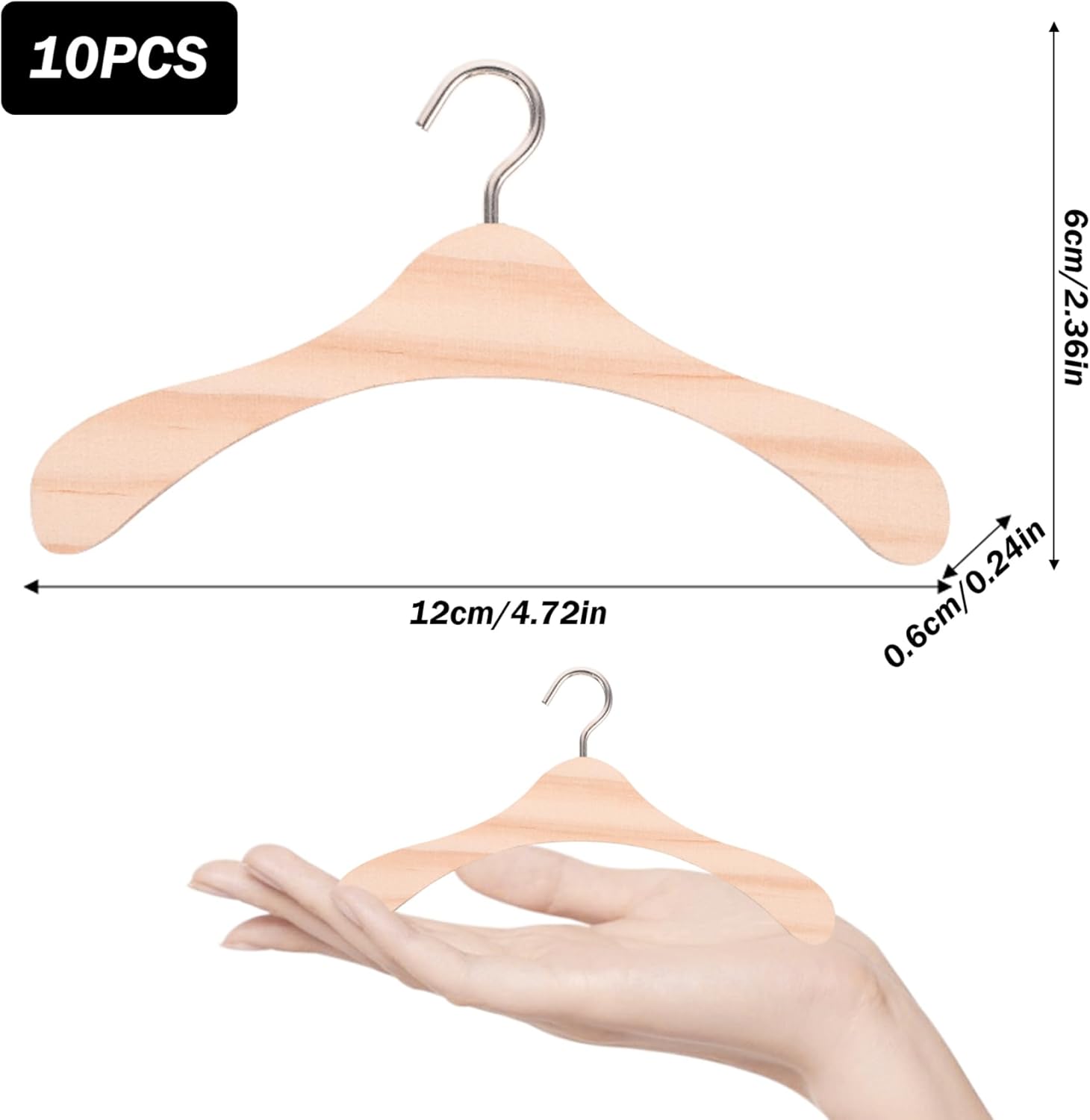Set da 10: ogni confezione contiene 10 grucce per vestiti per bambole, fornendo ampio spazio per il guardaroba della tua bambola..È perfetto per chi ama vestire le proprie bambole e vuole mantenere i propri vestiti organizzati. Materiale di qualità: realizzate con materiale di legno di qualità, queste grucce per vestiti per bambole sono robuste, resistenti e sicure..Non sono tossici e non danneggiano i vestiti della tua bambola, consentendoti di giocare senza preoccupazioni. Realizzazione realistica e raffinata: queste grucce per vestiti per bambole sono squisitamente realizzate per imitare le grucce vere, con un design semplice e realistico..La superficie è liscia e priva di sbavature, garantendo che i vestiti della tua bambola non vengano danneggiati. Facile da appendere: la parte superiore di ciascuna gruccia è dotata di un piccolo gancio che consente di appenderla facilmente in un armadio, in un ripostiglio o in altri spazi di stoccaggio..Ciò garantisce che i vestiti della tua bambola siano ben conservati e facilmente accessibili. Dimensioni adeguate: con dimensioni di circa 12x6x0,6 cm/4,72x2,36x0,24 pollici, queste grucce per vestiti per bambole sono adatte per vari vestiti per bambole di medie dimensioni..Sono pratici e versatili, il che li rende un accessorio indispensabile per gli appassionati di bambole o case delle bambole.