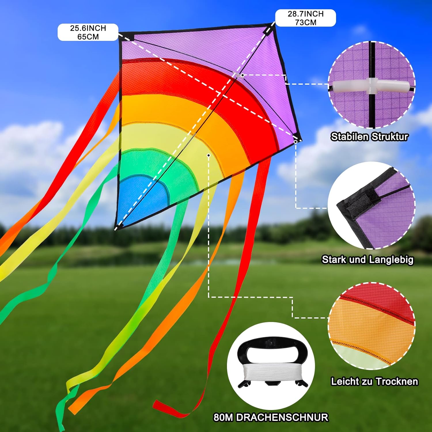 Aquilone colorato - L'aquilone arcobaleno LEBEXY misura 73 x 65 cm con 8 code colorate abbinate lunghe 105 cm, con linea dell'aquilone da 80 m. Set aquilone LEBEXY facile da montare, perfetto per i principianti. Il design colorato rende l'aquilone chiaramente visibile dall'alto del cielo. L'affascinante momento in cui l'aquilone si alza in aria rimane indimenticabile per i bambini Robusto e durevole - Realizzato in alta qualità, Resiste a molteplici impatti e all'acqua, facile da asciugare, l'aquilone per bambini può volare ancora e ancora Facile da usare e volare - Grazie alla struttura stabile e al telaio leggero, l'aquilone per bambini LEBEXY può facilmente salire in cielo. Sono incluse istruzioni dettagliate per garantire che l'aquilone sia facile da montare. Ordina oggi e pianifica il tuo primo viaggio per il prossimo fine settimana. Regalo speciale per i bambini: l'aquilone da spiaggia LEBEXY può aiutarti a trascorrere del tempo piacevole con i tuoi bambini. Se riesci a far volare l'aquilone con i tuoi bambini sulla spiaggia, i tuoi bambini saranno molto felici ed emozionati. Questo bellissimo aquilone può essere un ponte verso un rapporto più stretto con tuo figlio. Ricordi inestimabili - Nella bella estate, far volare gli aquiloni con i bambini è un'esperienza divertente e indimenticabile. Colori colorati e motivi carini possono stimolare l'immaginazione dei bambini e migliorare le loro capacità di coordinazione, far provare ai bambini un grande senso di realizzazione, innamorarsi delle attività all'aperto e stare lontano dallo schermo del computer o del telefono cellulare