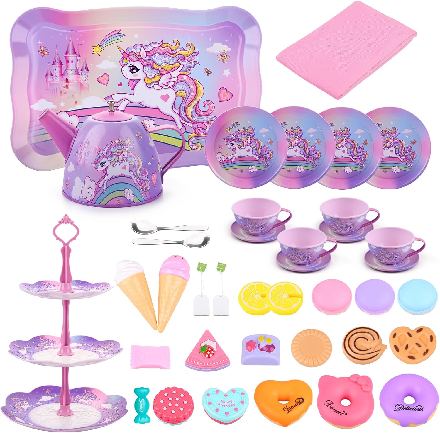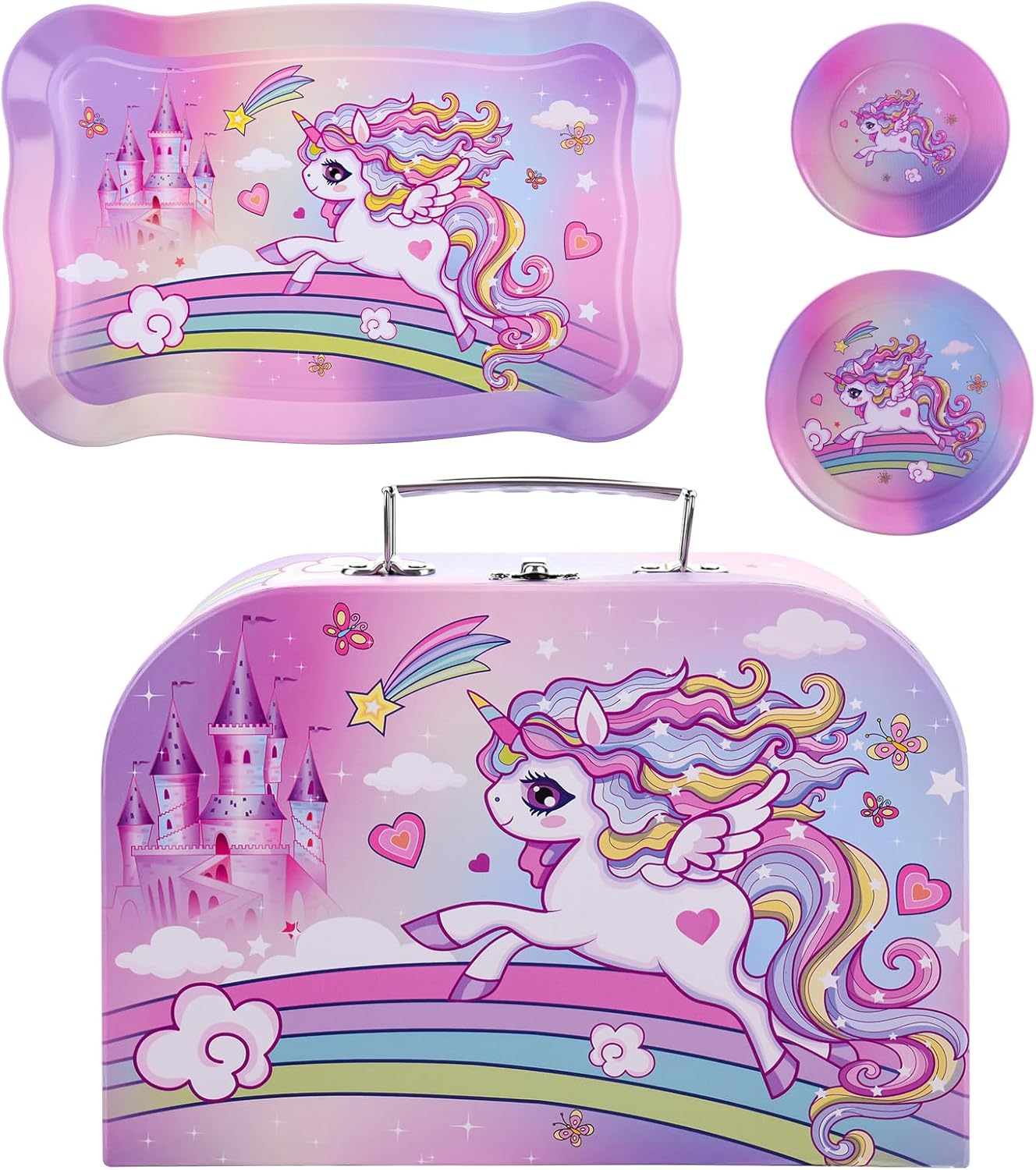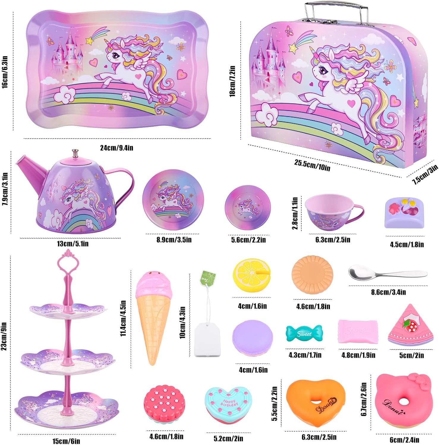 【41 Pezzi Servizio Da Tè Unicorno Per Bambini】 Include 1 teiera di latta, 1 tovaglia, 4 tazze da tè di latta, 4 sottobicchieri di latta, 4 piatti di latta, 2 cucchiai, 1 supporto per cupcake a 3 livelli, 1 tovaglia, 1 vassoio da portata in peltro, 2 bustine di tè , 2 fette di limone, 17 giocattoli da dessert, 1 valigia unicorno. 【Servizio Da Tè Finto Sicuro】 Realizzato con materiali di latta di alta qualità, non tossici e resistenti al calore, questo set da tè è sicuro per i bambini. I bordi lisci delle coppe proteggono durante il gioco. 【Giocattoli Da Tè Portatili】 Viene fornito con un'adorabile custodia rosa, leggera e facile da trasportare, questo servizio da tè può essere portato ovunque vada tuo figlio. È perfetto per i viaggi, i picnic o per visitare gli amici. 【Perfetto Per Tea Party Immaginari】 Questo set da tè unicorno è perfetto per tea party immaginari con amici o familiari. La teiera con coperchio rimovibile può contenere e versare acqua, tè o succo per un'esperienza di gioco più realistica. 【Un Regalo Perfetto Per La Tua Piccola Principessa】 Fai un regalo alla tua bambina che stimolerà la sua immaginazione e creatività. Questo set da tè con unicorno è un ottimo regalo per compleanni, Natale o qualsiasi altra occasione speciale.