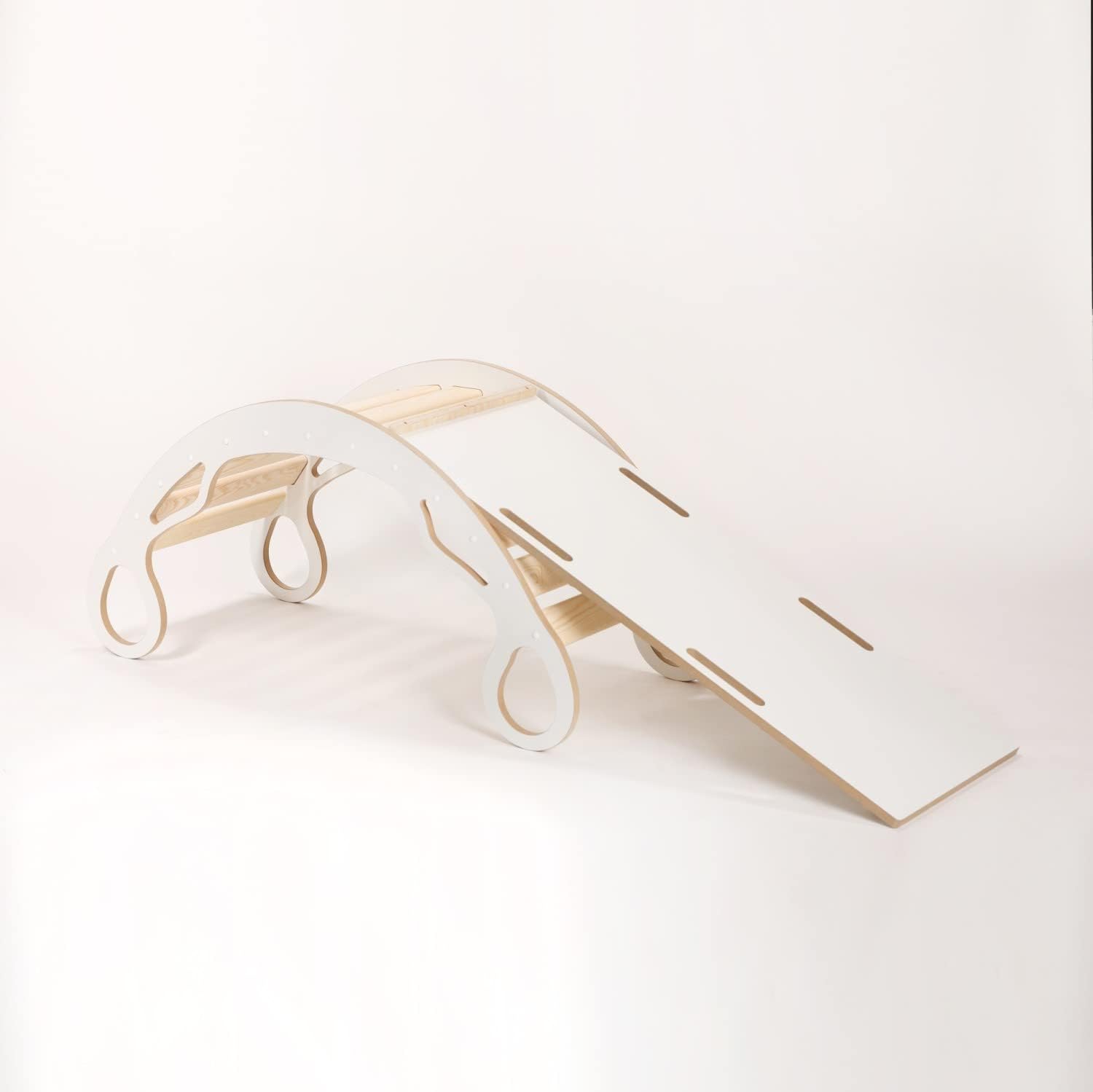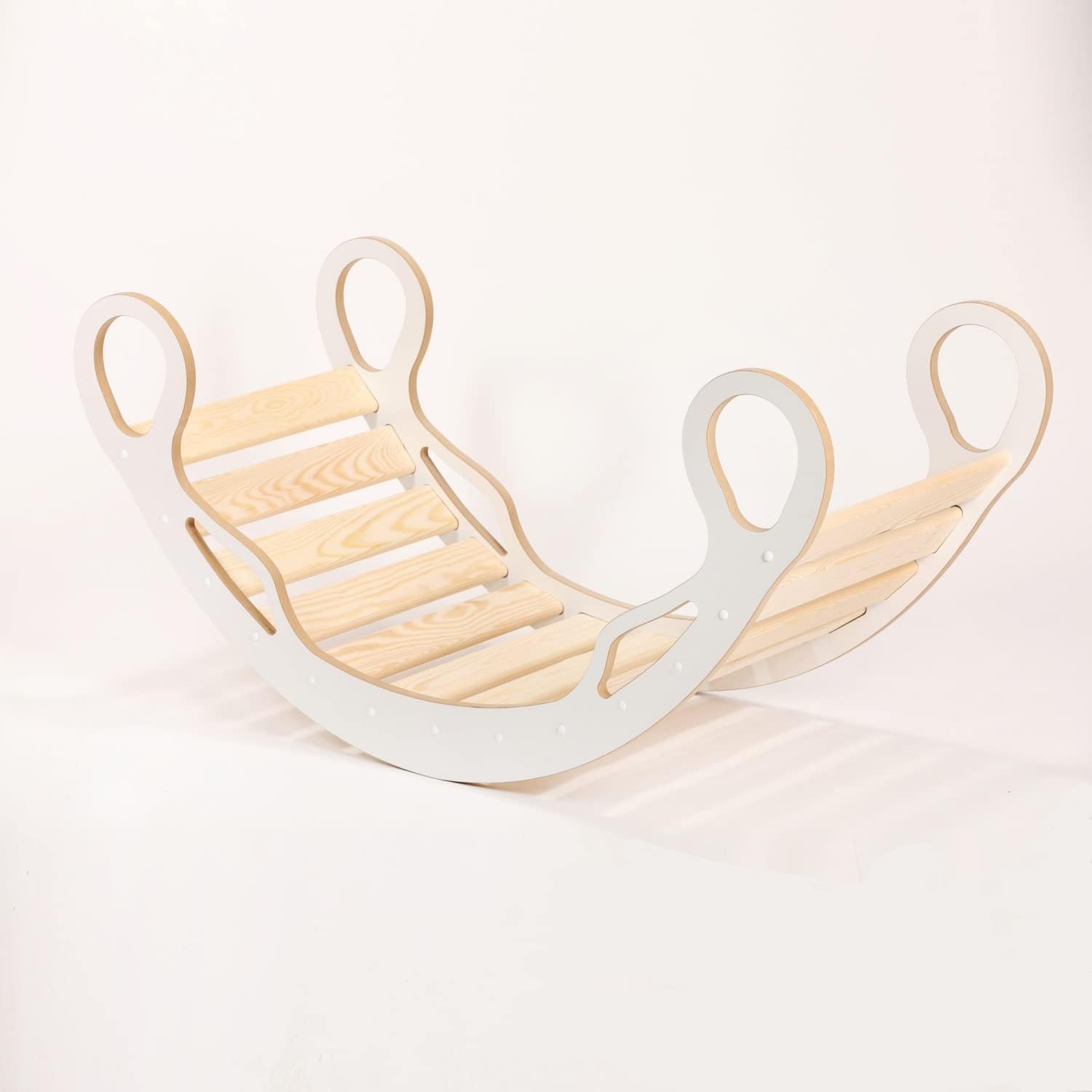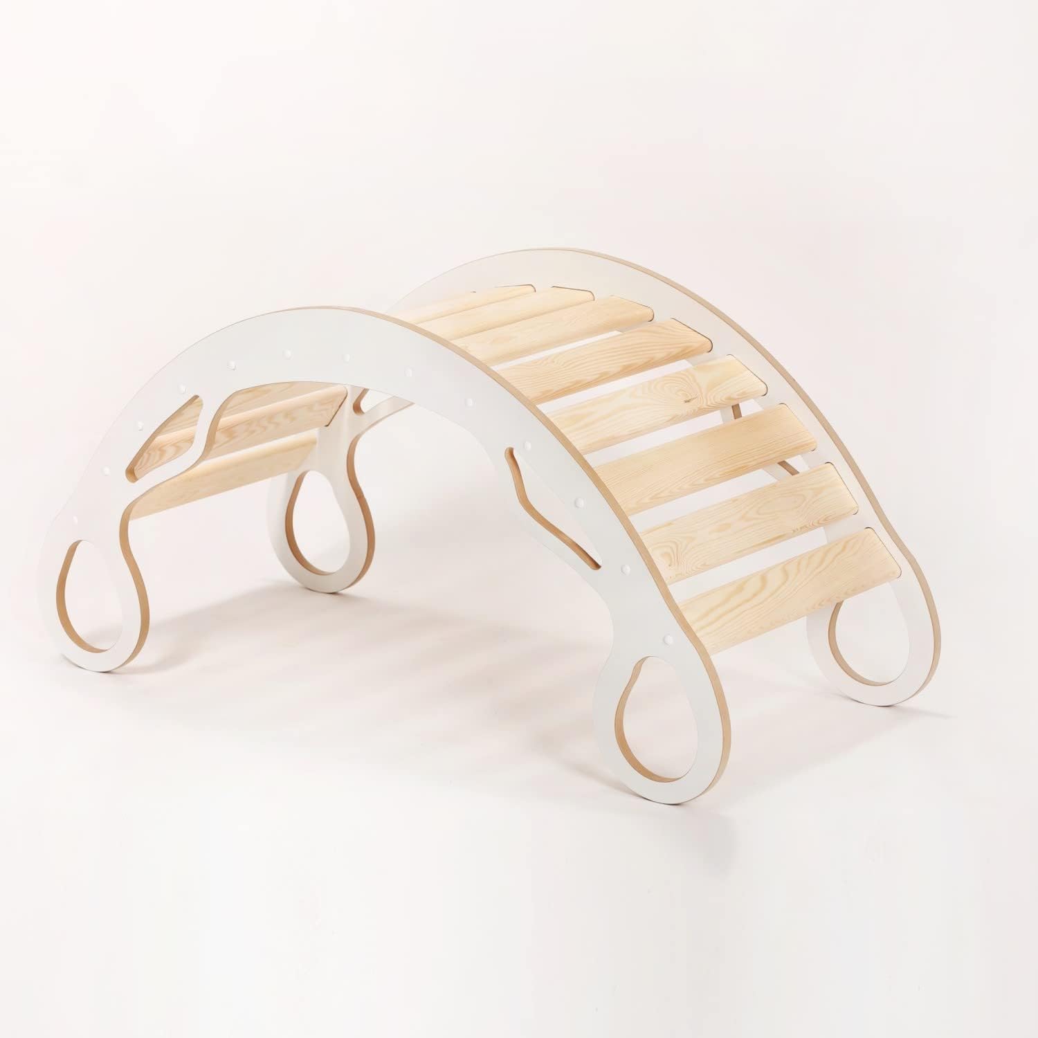 Le parti laterali dell'arco da arrampicata sono realizzate con pannelli MDF molto robusti (18 mm) e le assi trasversali sono in pino massiccio. I nostri archi da arrampicata sono molto stabili e sicuri per i bambini. I bordi arrotondati dell'arco di gioco consentono uno scorrimento senza infortuni. L'arco da arrampicata può sostenere un peso corporeo fino a 100 kg. L'arco da arrampicata è adatto a bambini di diverse età: per i neonati come sdraietta per addormentarsi, per i più piccoli per arrampicarsi e dondolarsi. 2 in 1: il tabellone da gioco è a doppia faccia: un lato è un tabellone e l'altro è un letto da arrampicata. L'arco da arrampicata non è solo un giocattolo divertente, ma favorisce anche lo sviluppo fisico dei bambini. Migliora la coordinazione, l'equilibrio, la forza e la flessibilità del tuo bambino.