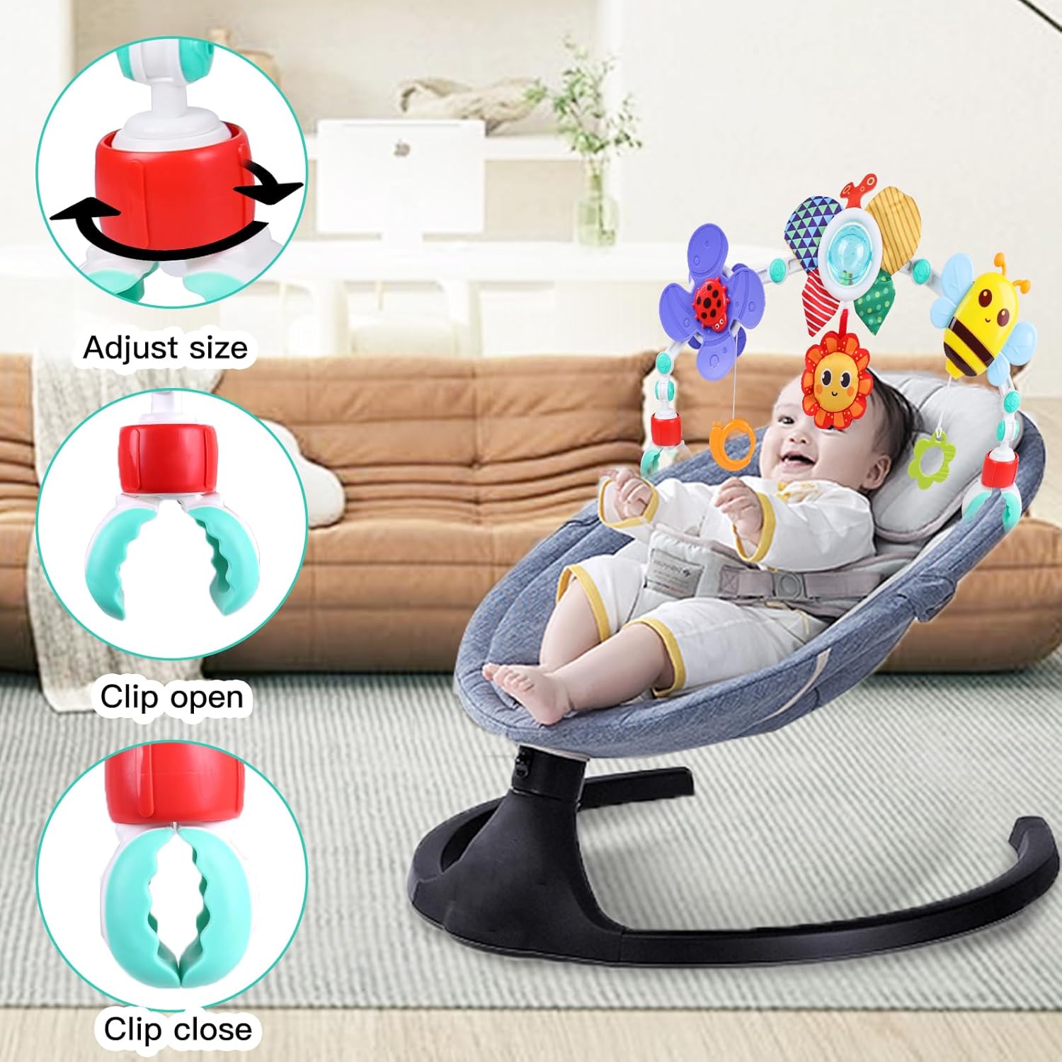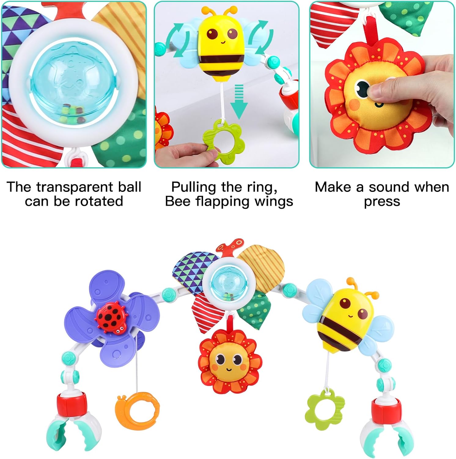 Gioco d'arco per passeggino attraente: Il tema del nostro giocattolo d'arco per passeggino adotta simpatici animali come scarafaggi, farfalle, api, un anello a forma di lumaca e un sole. I piccoli animali sono colorati e hanno forme cartoon, attirando l'attenzione dei bambini e stimolando il desiderio di giocare con loro. I bambini possono esercitare le loro abilità cognitive e la percezione dei colori mentre giocano, imparando e crescendo. Gioco con anello a strappo: I nostri giocattoli per passeggino per bambini includono due tipi di giochi con anello a strappo: il mulino a vento a forma di scarafaggio e la piccola ape. Tirando delicatamente l'anello a forma di lumaca, il mulino a vento a forma di scarafaggio ruoterà lentamente, e tirando l'anello verde sotto la piccola ape, la piccola ape sbatterà le ali. Sarà un buon gioco per i bambini e aiuterà a esercitare la loro abilità motorie. Gioco musicale: Il giocattolo per passeggino per neonati è dotato di farfalla e sole che emettono suoni. La farfalla ha una palla trasparente al centro che può essere girata e produce un suono di sonaglio; le ali della farfalla sono fatte di carta frusciante. Il piccolo sole ha un dispositivo bb incorporato che emette un suono quando viene pizzicato delicatamente. Materiale sicuro e design conveniente: Realizzato con materiali di alta qualità sicuri e senza BPA. Superficie liscia senza sbavature. Il corpo del supporto ha giunti mobili che lo rendono facile da aprire e chiudere. La lunghezza massima di estensione di 75 cm è adatta alla maggior parte dei passeggini, delle culle, delle sedie per bambini e dei seggiolini auto. Inoltre, i genitori possono portarlo via ripiegandolo facilmente in una piccola borsa. Prodotto ideale per i bambini: È un perfetto giocattolo per l'educazione precoce del bambino in diverse situazioni come feste di compleanno e viaggi, dove i bambini imparano diversi tipi di conoscenze giocando. L'articolo, con una scatola raffinata, è un regalo ideale per compleanni, baby shower e future mamme.