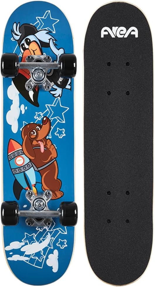 Skateboard per bambini da 3 a 5 anni completamente assemblato e pronto per l'uso. Skateboard per bambini da 24 pollici adattato alle dimensioni del corpo per 3-5 anni. I nostri skateboard per bambini da 24 pollici sono lunghi 61 cm e larghi 15,2 cm. È installato un asse in alluminio da 3,5 pollici con attacco 82a che garantisce un ottimo comportamento di sterzata. Le ruote da skateboard per bambini misurano 50 x 36 mm e hanno una durezza di 92 A. Per imparare a guidare skateboard, questi rulli sono perfetti. Lo skateboard favorisce l'equilibrio e il movimento dei bambini perché è divertente. È importante anche divertirsi in sicurezza indossare un equipaggiamento protettivo adeguato. I nostri skateboard AreA per bambini da 24 pollici sono disponibili in diversi design: Rocket Dog, Funny Monkeys.