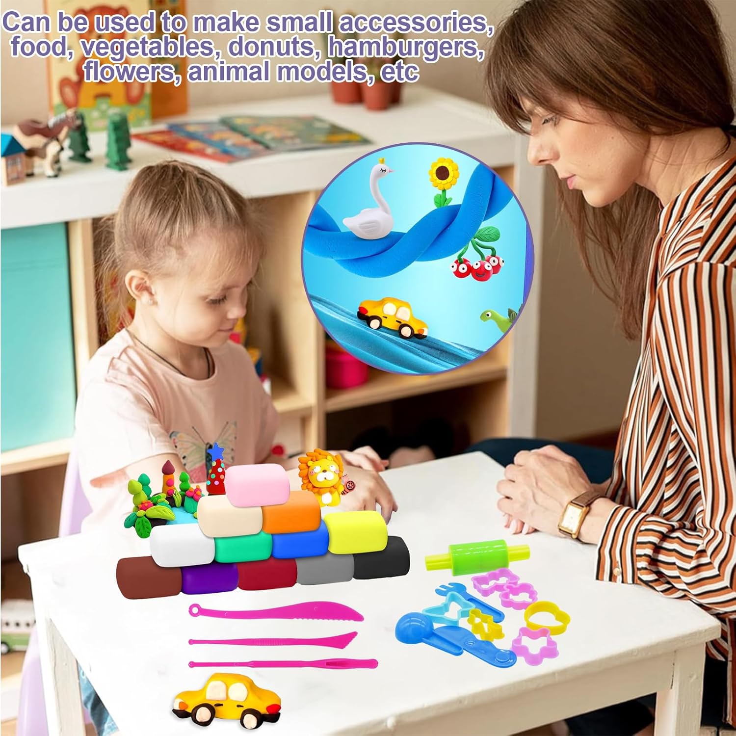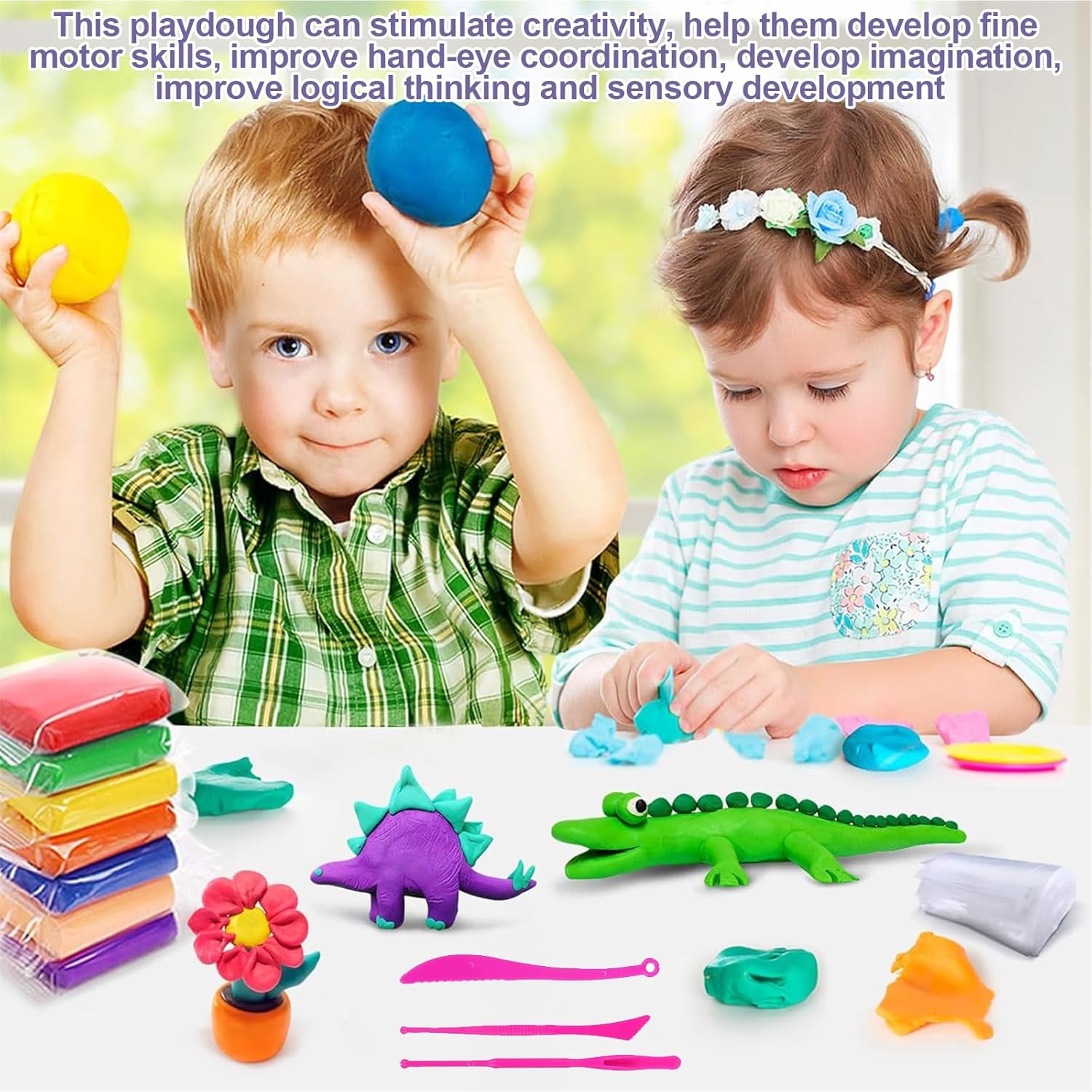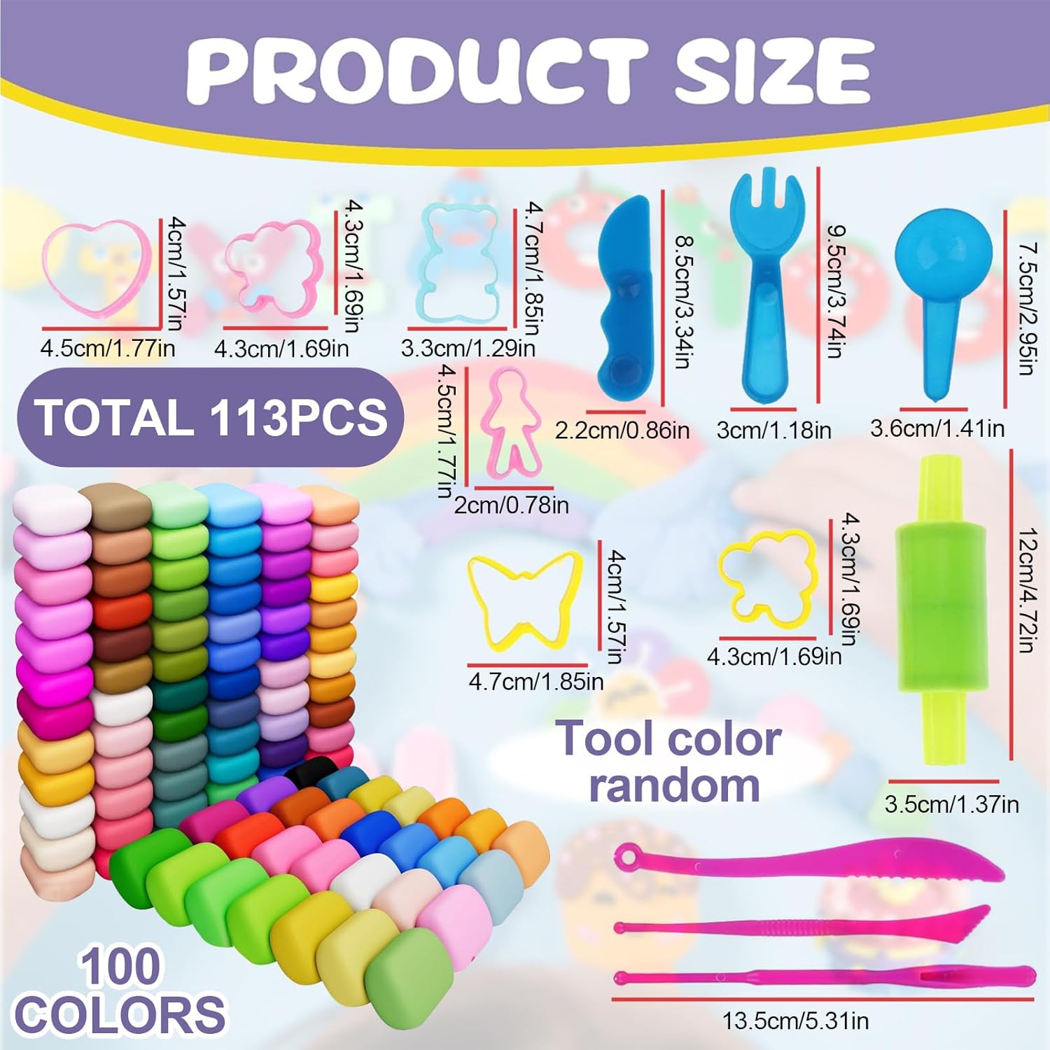 Set completo di argilla modellabile: Questo kit di argilla da modellare bambini include 100 blocchetti di argilla leggera in colori assortiti e 13 strumenti per modellare facilmente forme e creazioni fantasiose. La consistenza morbida e leggera dell’argilla la rende perfetta per mani piccole e consente di mescolare colori per ottenere tonalità personalizzate. Materiale sicuro e atossico: L’argilla da modellare è realizzata con ingredienti sicuri, privi di sostanze tossiche e odori sgradevoli, rispettando l’ambiente e la salute dei più piccoli. Il contatto con l’argilla risulta delicato e piacevole, senza lasciare residui appiccicosi sulle mani. Dopo l’utilizzo, è sufficiente riporre i pezzi nella busta trasparente con zip per evitare che si induriscano. Questo rende il prodotto perfetto per l’uso quotidiano e per i laboratori creativi nelle scuo Sviluppo delle capacità cognitive e motorie: Grazie alla sua versatilità, questa argilla modellabile permette ai bambini di migliorare la coordinazione occhio-mano e le capacità motorie fini mentre realizzano animali, frutti, fiori e tante altre forme colorate: L’attività manuale favorisce anche l’immaginazione e il pensiero logico, aiutando i più piccoli a esprimere la propria creatività lontano dagli schermi digitali: Un’esperienza educativa completa che accompagna la crescita e la scoper Facile da modellare e asciugare: L’argilla si può piegare, stendere, modellare e unire con grande facilità senza bisogno di forno o strumenti speciali per l’asciugatura. Una volta completate le creazioni, basterà lasciarle all’aria per ottenere modelli solidi e resistenti. La consistenza elastica e la gamma di colori vivaci incoraggiano i bambini a sperimentare nuove idee con semplicità e soddisfazione. Perfetta per tante occasioni e regali: Questo set di argilla modellabile bambini è adatto a principianti, adulti e piccoli artisti che vogliono realizzare accessori, miniature di cibo, decorazioni e oggetti creativi per la casa o per la scuola. Ottimo come regalo di compleanno, dono di Natale, sorpresa di Pasqua o premio speciale per incoraggiare l’apprendimento e il gioco condiviso. L’argilla multicolore garantisce ore di attività manuale piacevole e costruttiva.