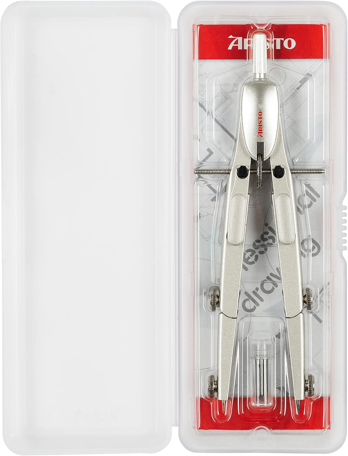 Il compasso di precisione Aristo Studio è un compagno affidabile e indispensabile per studenti, studenti e tecnici nel campo della geometria e del disegno tecnico nella vita quotidiana Premendo le due maniglie di bloccaggio, il compasso può essere regolato rapidamente. Ruotando la ruota centrale del compasso, è possibile effettuare la regolazione fine Entrambe le gambe hanno un giunto e sono pieghevoli. Il meccanismo brevettato impedisce che le gambe si pieghino lateralmente durante il disegno. Il diametro massimo Diametro del cerchio: 340 mm Il compasso laccato argento è realizzato in zinco pressofuso e la testa in plastica. Può contenere inserti, come aste di prolunga o adattatori per perni, con un diametro fino a 4 mm Contenuto della confezione: compasso ARISTO Studio AR55630, scatola da 2 pezzi Mine per compasso e 1 Ago di ricambio, custodia in plastica