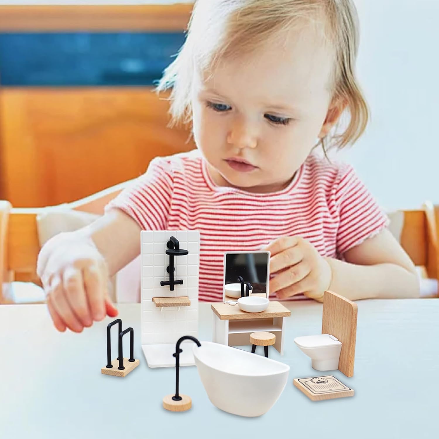 Design Sicuro per Bambini: Struttura in legno e PP con bordi arrotondati, bilancia robustezza e delicatezza sulle mani durante l'interazione ludica prolungata Design Salva-Spazio: Prodotto in miniatura realizzato per integrarsi perfettamente con le case delle bambole più diffuse. La costruzione compatta garantisce un ingombro ridottissimo a riposo, semplificando lo stoccaggio e l'ordinata conservazione in pochissimo spazio. Creatività Layout Dinamico: Stimola l'immaginazione con opzioni di disposizione flessibile per il bagno in miniatura, progettate per sviluppare il pensiero spaziale attraverso molteplici combinazioni di gioco utilizzabili separatamente o insieme Ambientazione Realistica Fedele: Grazie al design particolareggiato e alla configurazione bagno in miniatura realistica, favorisce esperienze di gioco di ruolo immersive offrendo scenario di gioco 1:12 splendidamente riprodotto Regalo Ideale: Set Bagno per Casa delle Bambole aggiunge allegria a qualsiasi stanza dei giochi. Ottimo regalo per la Festa dei Bambini, Natale o compleanni. Adatto a tutti i bambini, stimola il gioco immaginativo e la creatività con dettagli realistici.