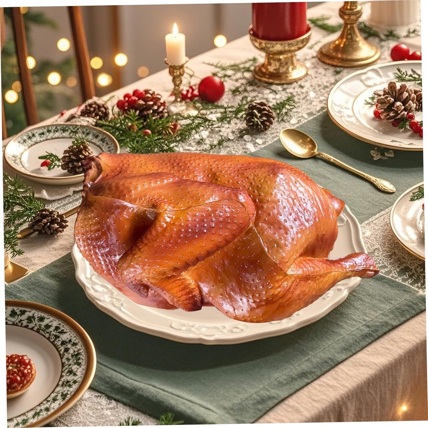 Riutilizzabile: realizzata con materiali robusti, questa decorazione di tacchino artificiale è costruita per durare durante più stagioni festive, fornendo valore a lungo termine e fascino festivo costante. Uso festivo in più occasioni: perfettamente adatto per il Ringraziamento, il Natale e le celebrazioni stagionali, questo ornamento abbina a vari stili e temi di arredamento, migliorando il calore e la gioia di ogni incontro festivo. Pulito e senza disordine: a differenza del vero pollame cotto, questo pollo non richiede preparazione, pulizia o refrigerazione, rendendolo un'alternativa decorativa igienica e conveniente per gli ospiti impegnati. Appeal visivo realistico: realizzato con attenzione ai dettagli, questo ornamento per arrosto di pollo imita l'aspetto del vero pollame arrosto, rendendolo perfetto per valorizzare le decorazioni del Ringraziamento e di Natale con un fascino realistico. Decorazione da tavola versatile: ideale sia per ambienti interni che esterni, funge da centrotavola o pezzo per decorazioni per la tavola delle vacanze, feste ed esposizioni in cucina, elevando l'atmosfera senza sforzo.