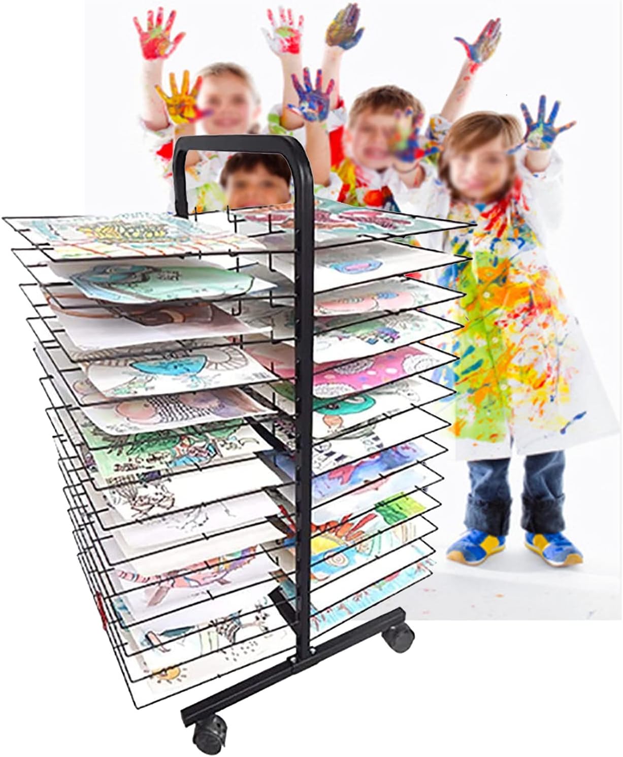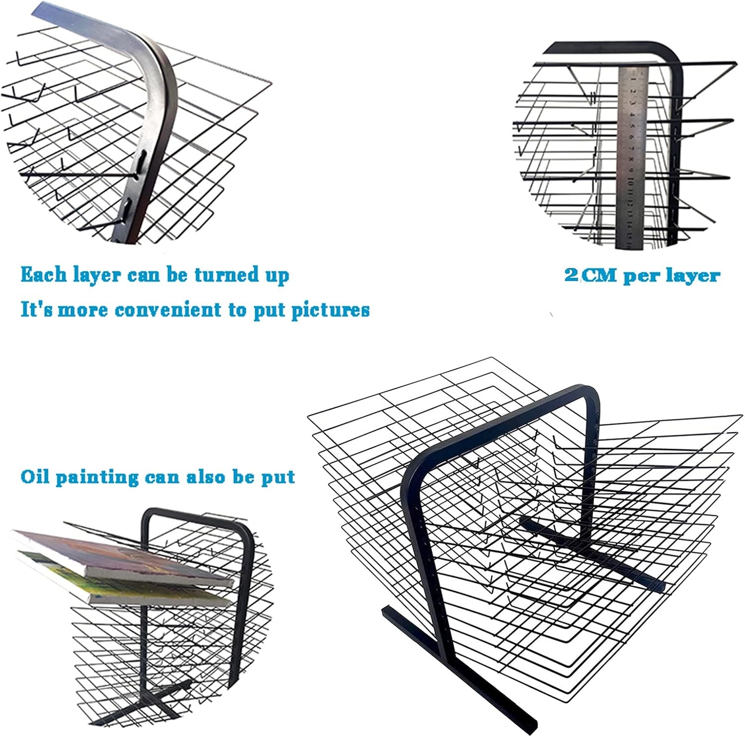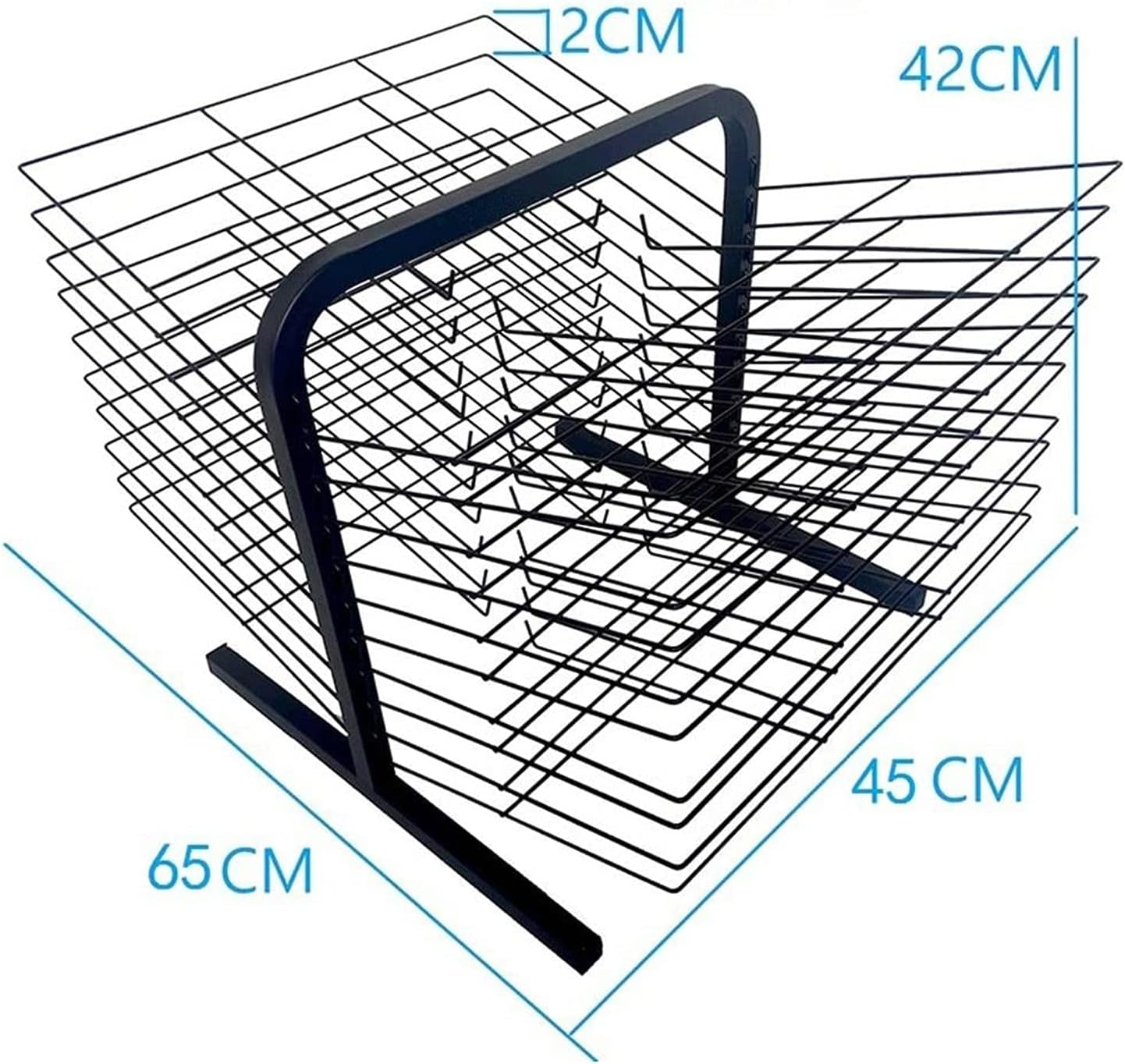 Realizzato in robusto filo metallico verniciato a polvere, questo scaffale artistico può supportare fino a 34 kg ed è costruito per durare. 2. Funzione versatile: perfetto per piccoli fogli, poster standard e carta per acquerelli, questo scaffale offre ampio spazio per asciugare progetti artistici o esposizioni in classe. 3. Design salvaspazio: con 20 ripiani e spaziatura regolabile, questo contenitore artistico è ideale per aule, centri d'arte o studi pur essendo compatto e facile da spostare. 4. Facile da montare: include tutti gli strumenti necessari e le istruzioni per un montaggio facile e veloce. Facile da pulire con un panno umido per la manutenzione. 5. Adatto a tutte le età: in piedi con un'altezza di 42/78 cm, questo organizer artistico è della dimensione perfetta sia per bambini che per adulti.