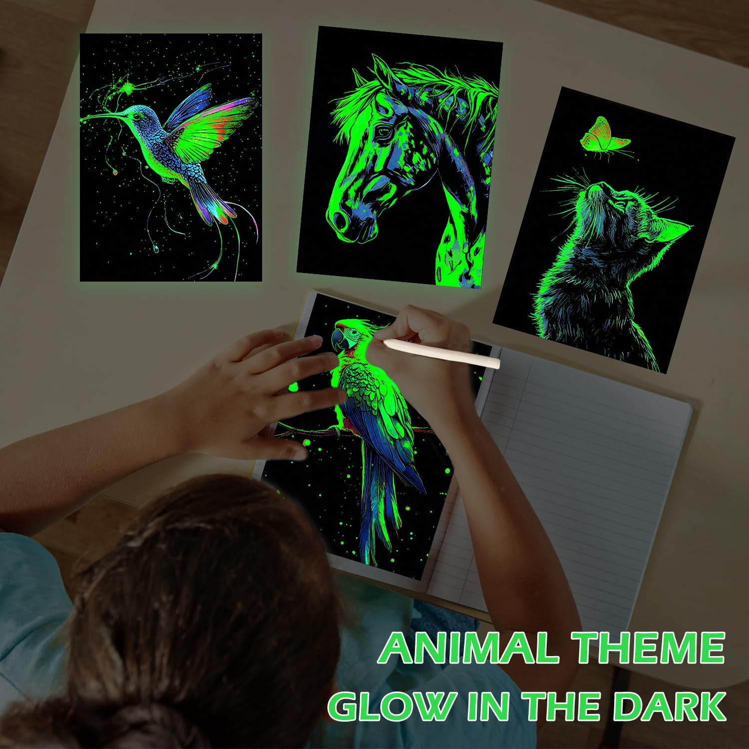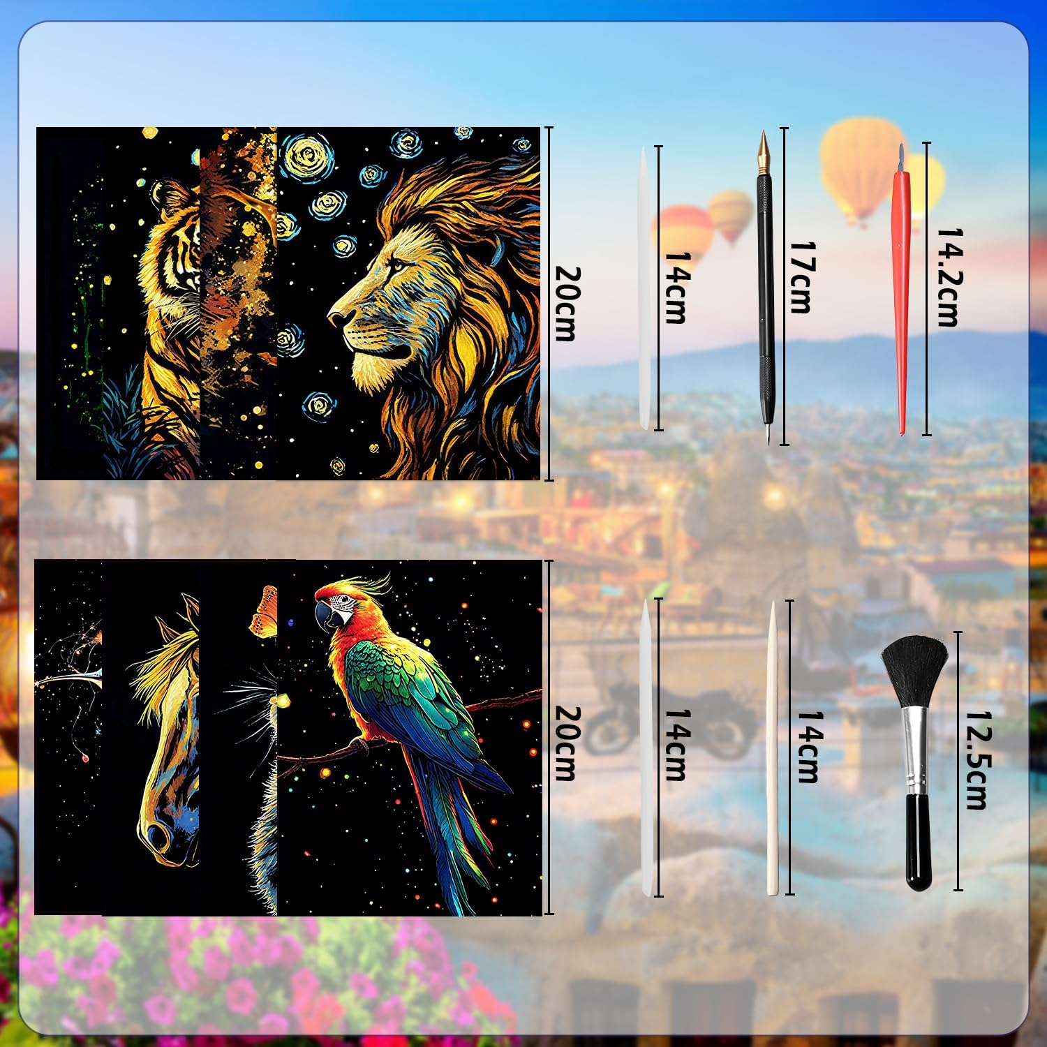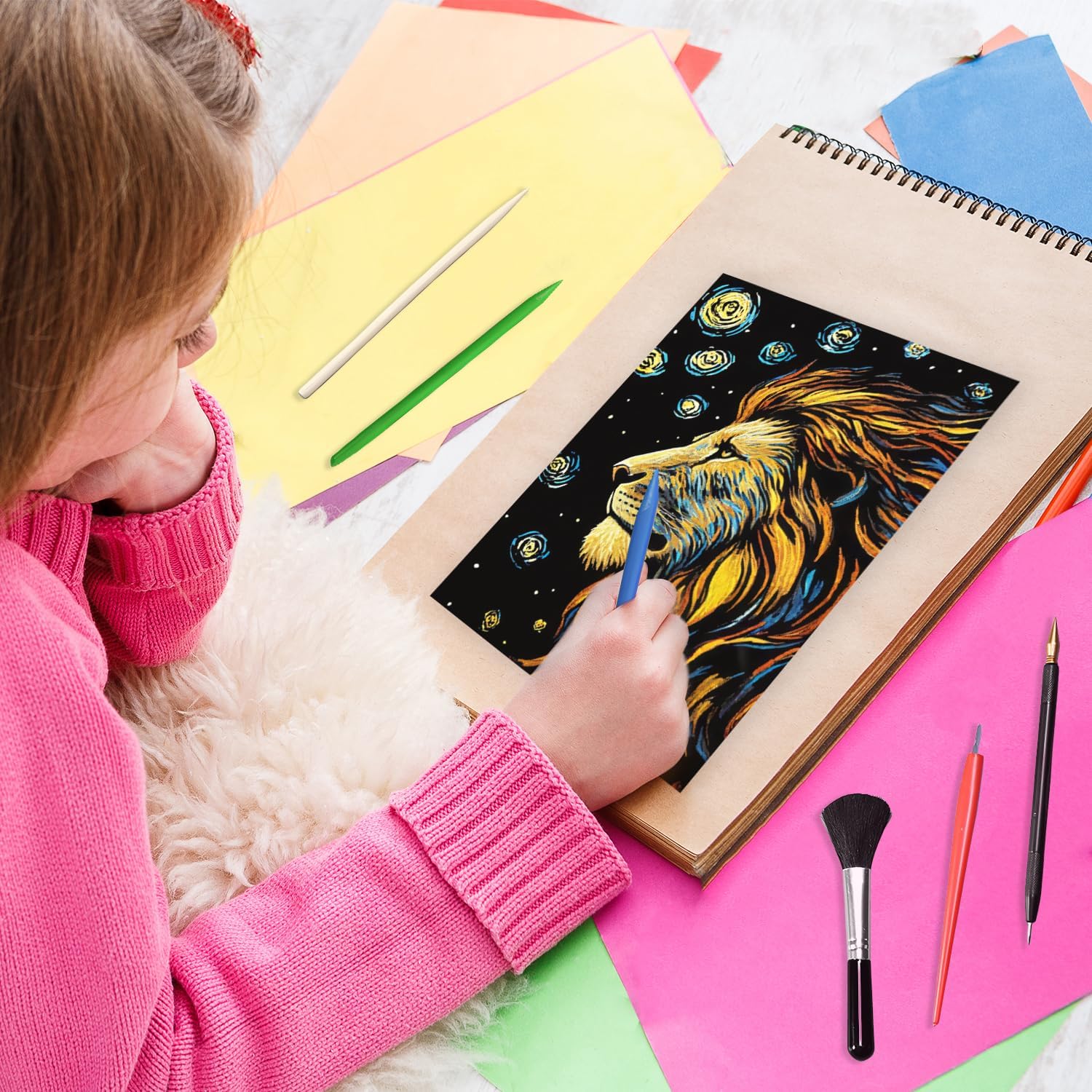 [Kit completo per disegno a graffio per tutte le età]: Riceverai 8 disegni a tema animale formato A5, 5 penne per graffio e un pennello per la pulizia. Ideale per bambini e adulti che desiderano un passatempo creativo o un primo kit artistico. [Materiali di alta qualità]: Realizzato in cartone ecologico e atossico con un elegante rivestimento nero. Sicuro per i bambini e gli adulti, produce colori straordinari – perfetto per principianti o esperti appassionati di arte su lamina. [Arte luminosa al buio]: La nostra arte a graffio brilla al buio: basta graffiare la superficie per scoprire motivi colorati sulla carta arcobaleno. Perfetto per stimolare la creatività dei bambini e per principianti che esplorano l'arte su graffio per adulti. [Stimola creatività e relax]: Un'attività con duplice scopo: ispirare l'immaginazione con l'arte a graffio arcobaleno per bambini e offrire relax terapeutico agli adulti. Utilizza il set da solo o combinato per un'esperienza artistica calmante. [Un regalo unico per ogni occasione]: Le fogli a graffio arcobaleno sono un dono stimolante per i bambini e un ricordo artistico per gli amanti dell'arte. Perfetto per compleanni, hobby creativi o chi cerca un'esperienza artistica divertente.