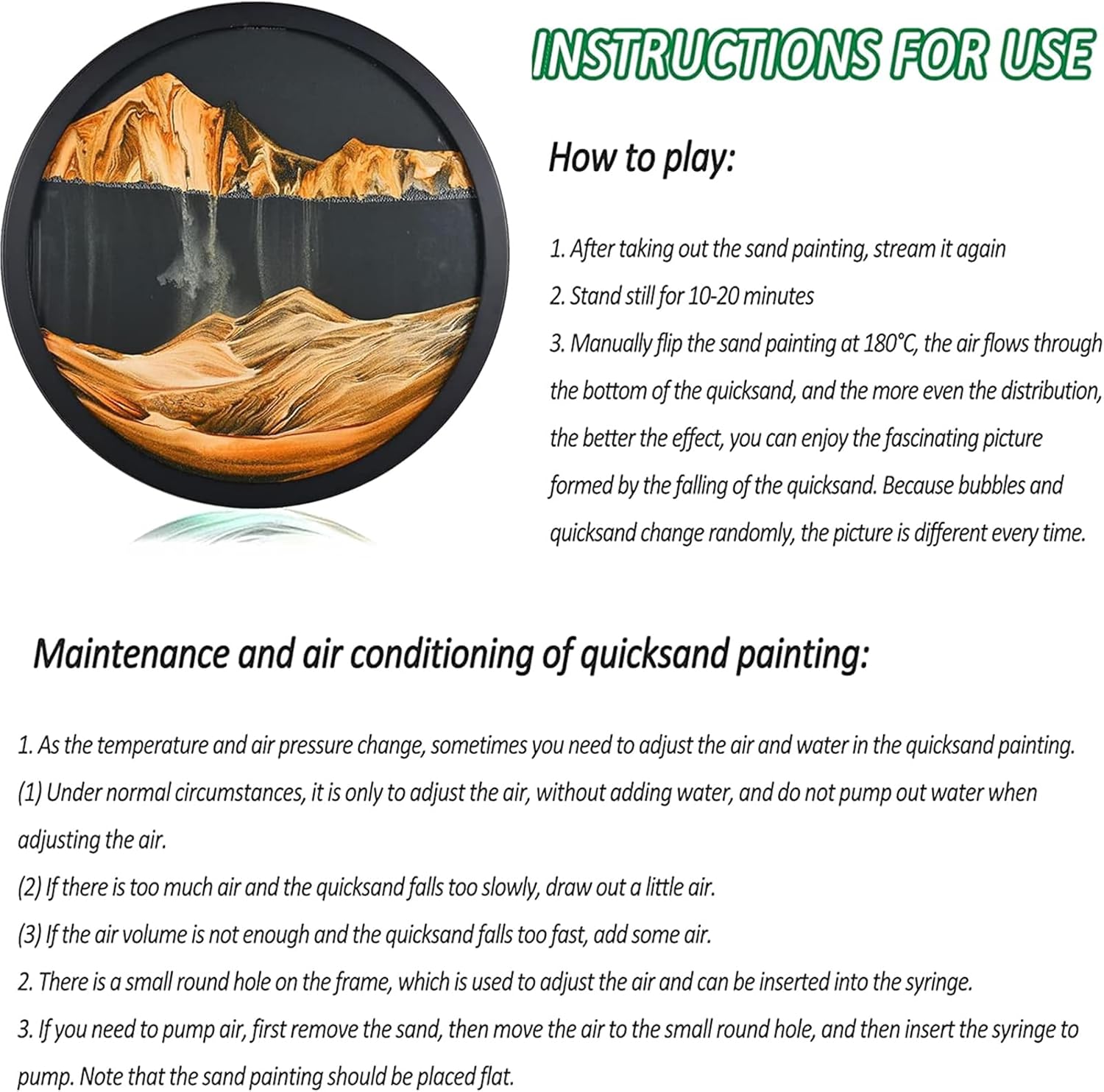 Idee versatili per la decorazione della casa: questa moderna arte da parete presenta uno splendido design del paesaggio naturale 3D che completa perfettamente una varietà di estetica domestica. È perfetto per creare un'atmosfera accogliente in qualsiasi spazio, tra cui salotti, camere da letto, cucine, bagni, sale da pranzo, uffici, hotel, ristoranti o qualsiasi altra occasione. Design rotante a 360°: mentre la pittura sulla sabbia ruota, i grani iniziano a spostarsi e formano paesaggi affascinanti come deserti, oceani e montagne. Le sue immagini rilassanti evocano la serenità delle cascate e della sabbia alla deriva, rendendolo un perfetto antistress che aiuta a coltivare la pazienza e offre sorprese inaspettate. Materiali di alta qualità: realizzato in vetro di alta qualità e una struttura in legno massello, questo pezzo è dotato di vetro senza piombo ad alta trasparenza per una visione cristallina. Il vivace effetto 3D creato dalla sabbia migliora il suo fascino visivo complessivo, rendendolo un'aggiunta accattivante al tuo arredamento. Squisito design artistico: questo dipinto dinamico sulla sabbia è un'opera d'arte accattivante. Ruota il vetro e goditi la trasformazione della sabbia in nuvole e paesaggi, oceani e montagne, con linee e motivi intricati che aggiungono un tocco di eleganza al tuo spazio. Soddisfazione garantita - Offriamo una garanzia di 1 anno insieme a un servizio clienti amichevole 24 ore su 24. Se riscontri problemi con il prodotto, ti preghiamo di contattarci per una sostituzione o un rimborso completo.