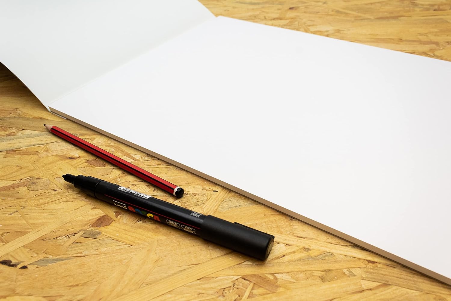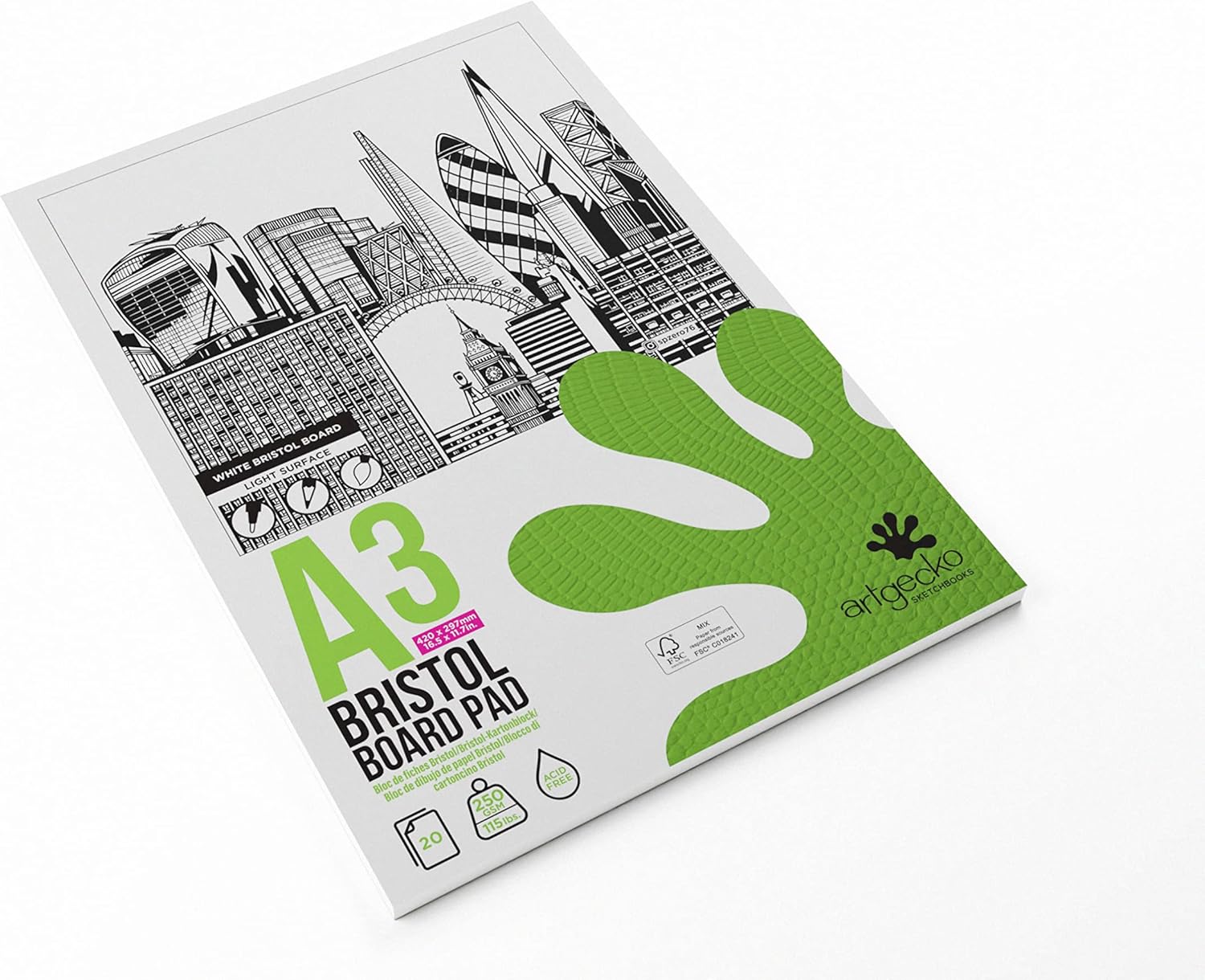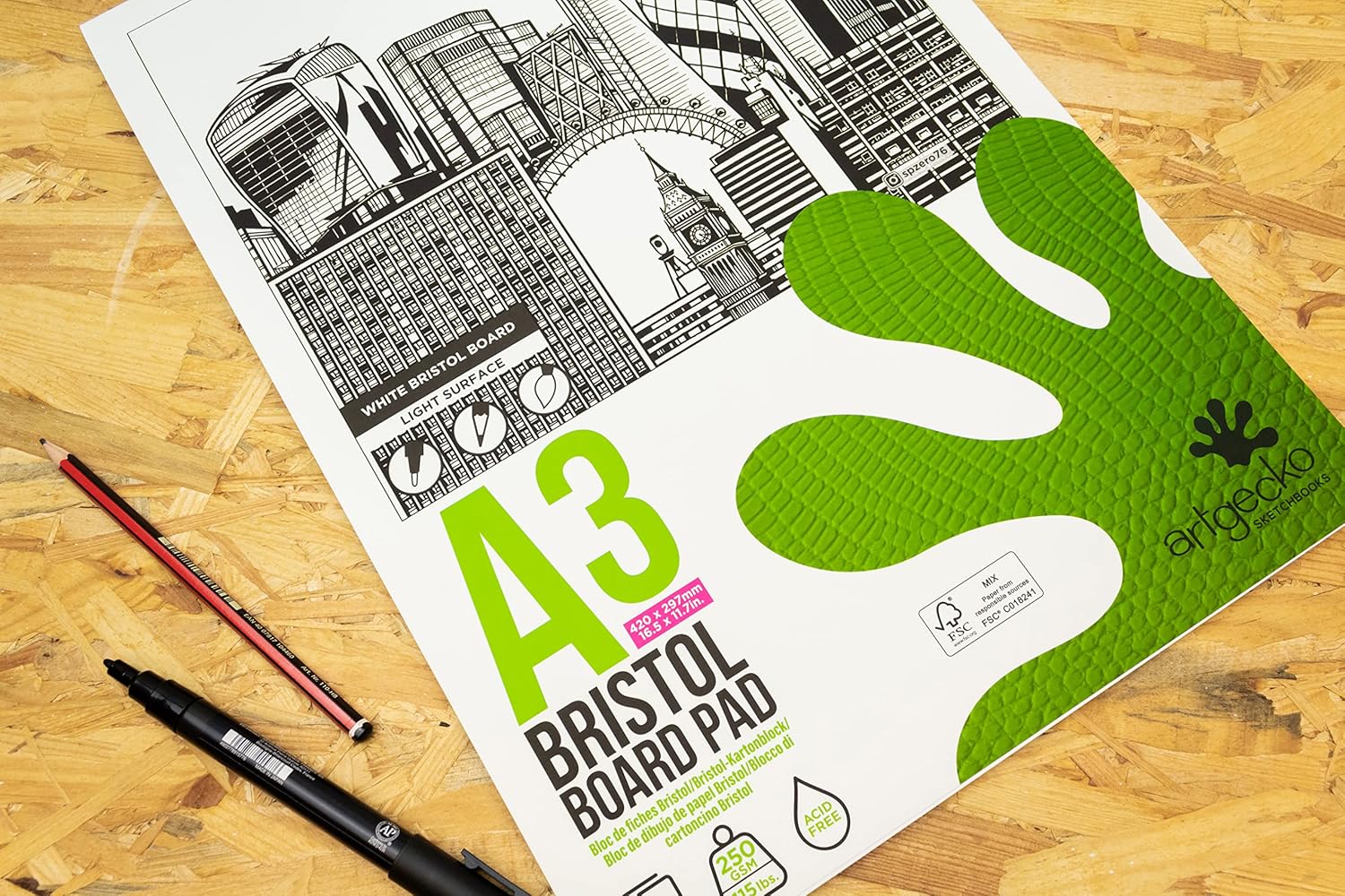Blocco da disegno formato A3 contenente 20 fogli da 250 g/m², cartoncino Bristol bianco di alta qualità con una superficie chiara Creato pensando alla stratificazione, in modo da poter applicare più strati di vernice senza arricciare la carta. La copertina laminata morbida al tatto non è solo flessibile e facile da pulire, ma può essere ripiegata in modo che non interferisca con il lavoro. La rilegatura con colla rende facile rimuovere le pagine una volta terminate con esse e il blocco rimarrà piatto mentre lavori. Tutta la carta Artgecko proviene da foreste sostenibili in modo da poter scarabocchiare al sicuro sapendo che ogni ultima pagina è rispettosa del clima.