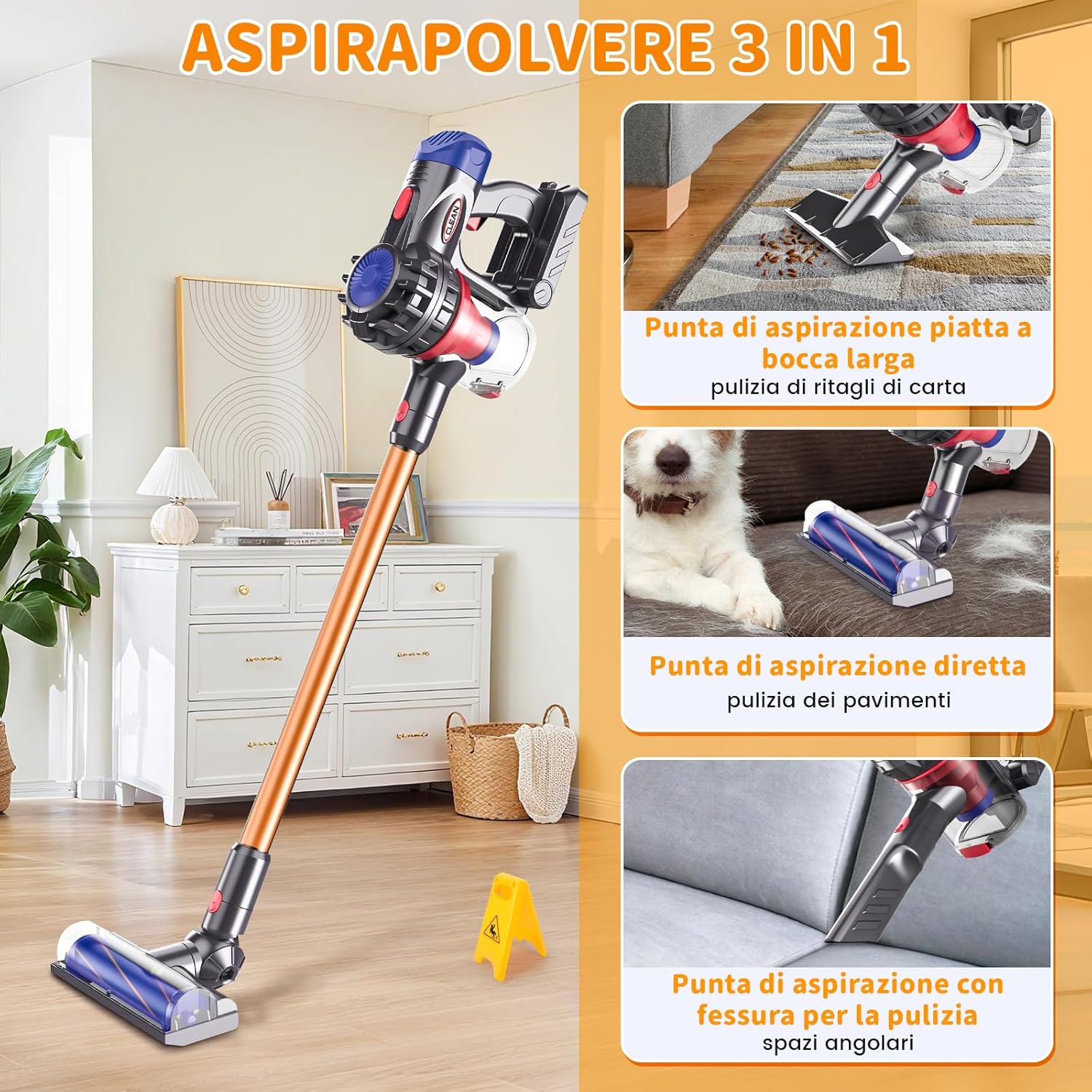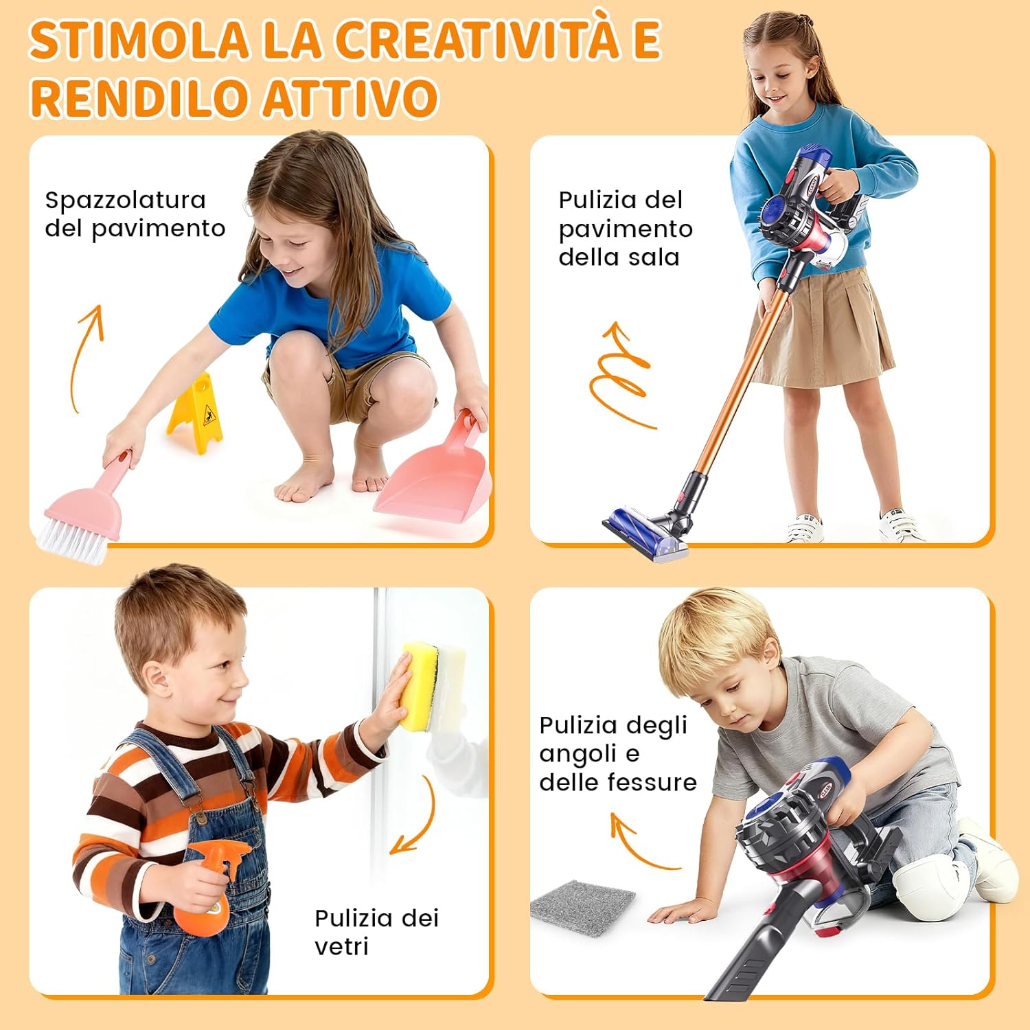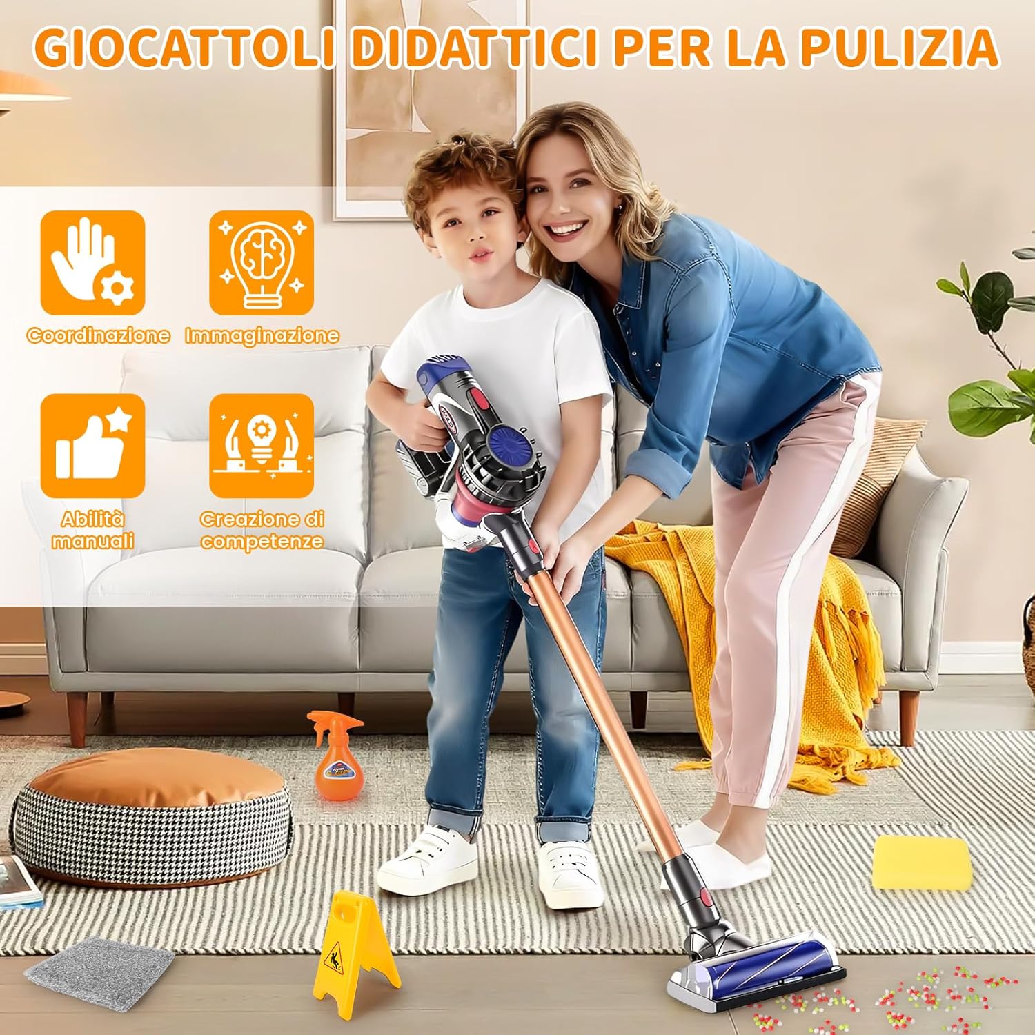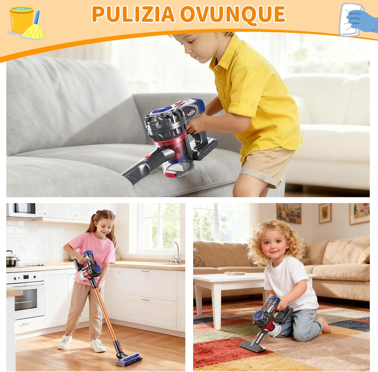 Aspirazione reale, per accendere l'entusiasmo nell'imitazione: Il nostro aspirapolvere giocattolo per bambini ha una aspirazione reale che raccoglie facilmente carta e palline colorate. I bambini si immergono nel ruolo dei genitori che puliscono, accendendo subito il desiderio di imitare. Si dedicano alle pulizie come mamma e papà, godendo di un entusiasmante gioco di ruolo e sviluppando un atteggiamento positivo verso le faccende domestiche fin da piccoli. Aspirapolvere giocattolo bambini funzionante 3-in-1, per esplorare diversi scenari: L'aspirapolvere giocattolo è dotato di 3 bocchette intercambiabili! Il bambino può cambiarle in base al compito (pavimento, fessure). La aspirazione delicata ma efficace rimuove in sicurezza polvere e carta. Cambiare le bocchette da soli è divertente e allena la risoluzione di problemi e la coordinazione occhio-mano come un piccolo ingegnere! Set Pulizia Bambini Giocattolo: Più di un semplice aspirapolvere giocattolo bambini funzionante, Il set include aspirapolvere bambini, panno lavabile, spazzola multi uso (paletta/pettine), coni segnaletici, ecc. Il bambino sperimenta l'intero processo di pulizia: aspirare, spazzare, strofinare. Ciò coltiva abilità domestiche, senso dell'ordine e responsabilità, secondo il metodo Montessori, stimolando immaginazione e gioco di ruolo per un giocattolo coinvolgente e divertente. Apprendimento ludico, regalo perfetto ben confezionato: Immaginando di pulire attraverso il gioco, il bambino sviluppa subtlemente il senso della pulizia, allena le abilità manuali e comprende il valore del lavoro. Il set ha accessori vari, costruzione di qualità e colori vivaci. Confezionato splendidamente, è il regalo perfetto per compleanni o Natale dona gioia e crescita. Montaggio semplice, progettato per le manine: Questo aspirapolvere giocattolo è leggero e compatto peso e dimensioni sono perfetti per le manine di bambini dai 3 anni in su, assicurando presa e spinta facili. I componenti sono progettati per un montaggio semplice, incoraggiando l'interazione con i genitori. Questo processo allena la coordinazione occhio mano, la motricità fine e la concentrazione la soddisfazione inizia dal montaggio.