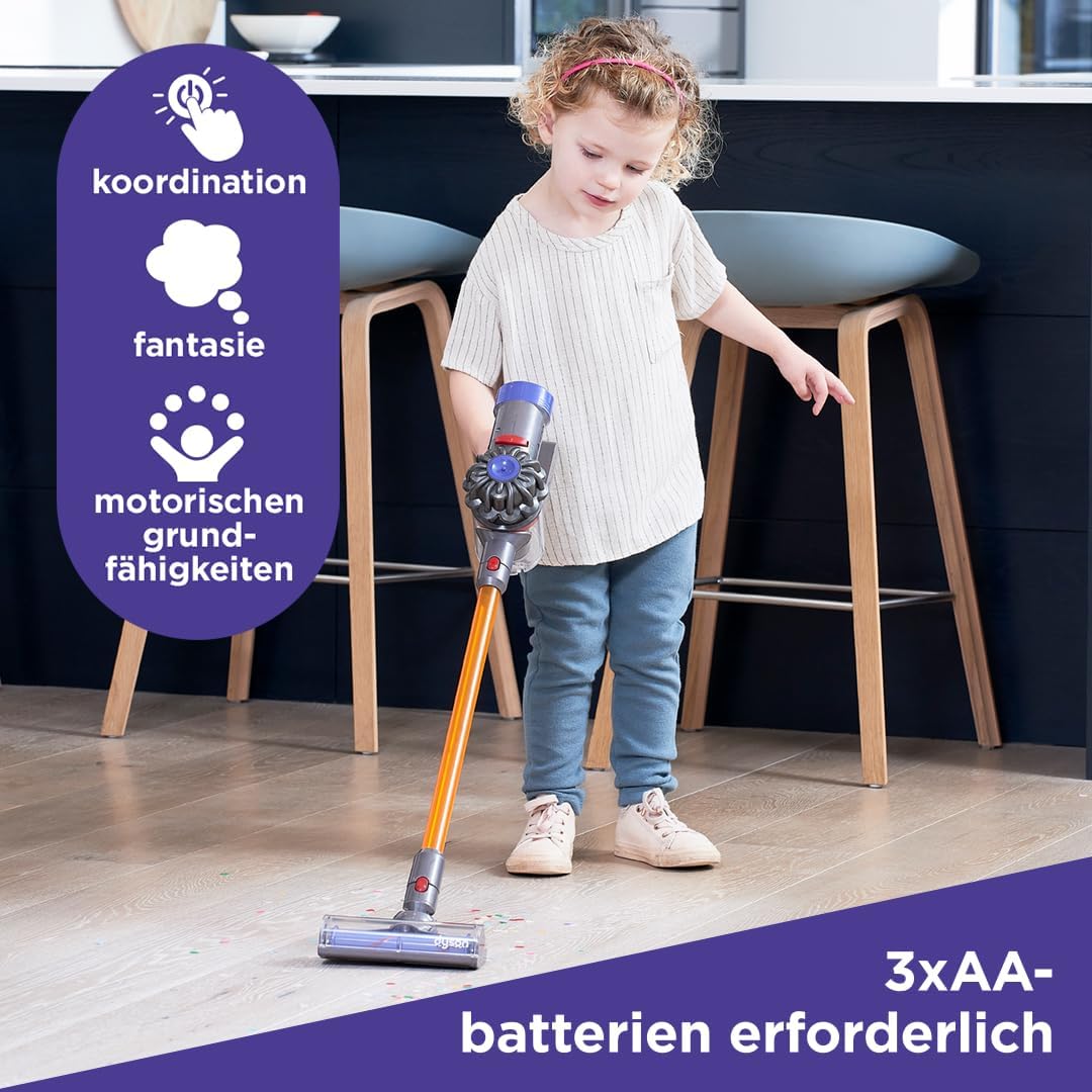 IMPARA GIOCANDO: infinite possibilità di gioco fantasioso incoraggiando al tempo stesso la coordinazione, stimolando la creatività e migliorando le capacità motorie di base con ogni movimento ampio MODI MULTIPLI PER GIOCARE: usa la bocchetta corta per aspirare manualmente o il manico lungo per girare e girare. GIOCO DI RUOLO REALISTICO: questo aspirapolvere giocattolo con licenza ufficiale assomiglia proprio al famoso aspirapolvere senza filo di Dyson e garantisce un gioco di ruolo realistico! INCLUSO: Aspirapolvere senza fili Dyson con licenza ufficiale con contenitore per lo sporco rimovibile, funzione ciclone simulata, accessori a rilascio facile e una bocchetta lunga e corta FACILE DA SPOSTARE: Peso (kg): 0,64, Lunghezza (cm): 23,5, Larghezza (cm): 10,0, Altezza (cm): 68 in posizione verticale. Apertura dell'aspirapolvere - 2,5 cm ADATTO PER GRUPPI D'ETÀ 3 anni in su: sono necessarie 3 batterie AA L'aspirapolvere aspira solo carta formato coriandoli, ma non è adatto per la pulizia