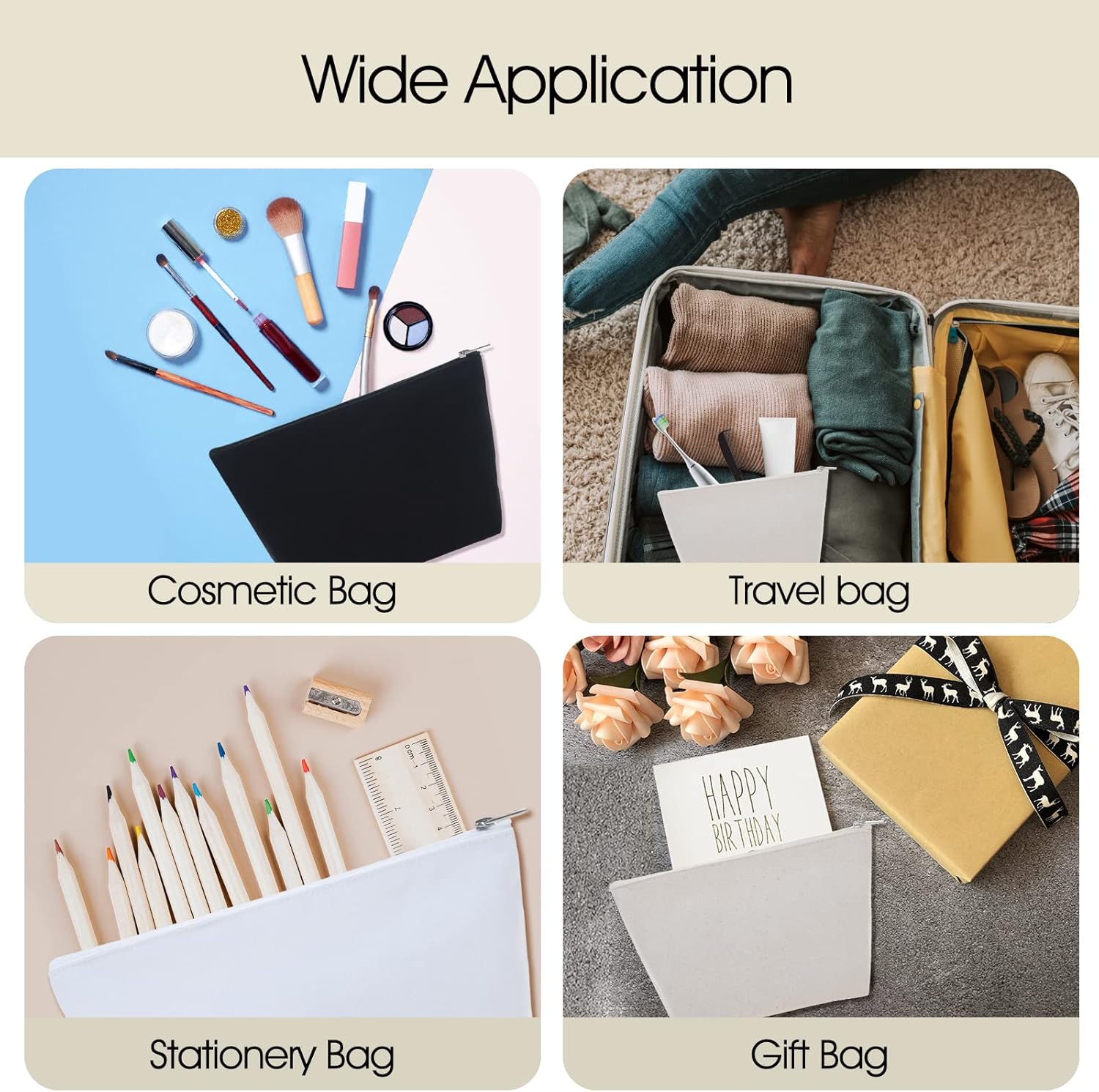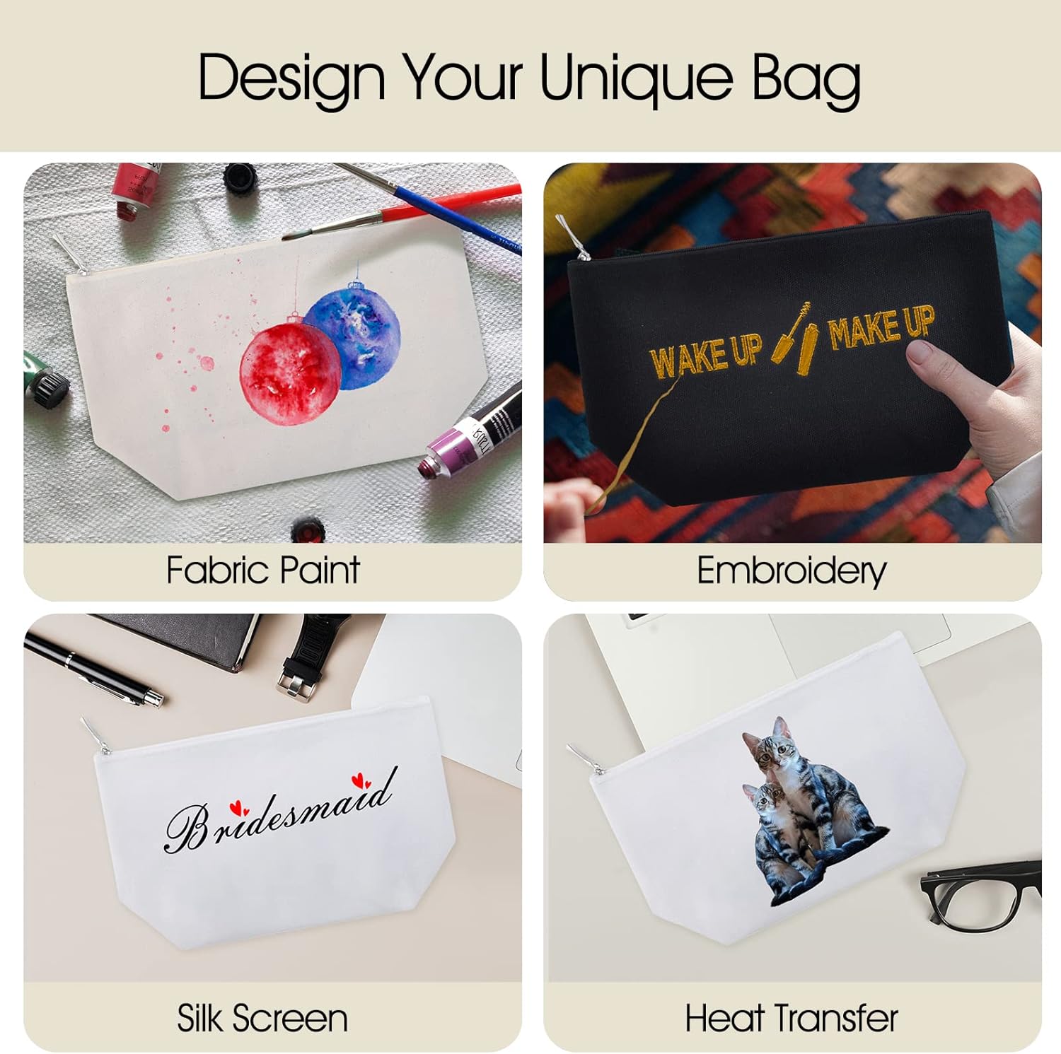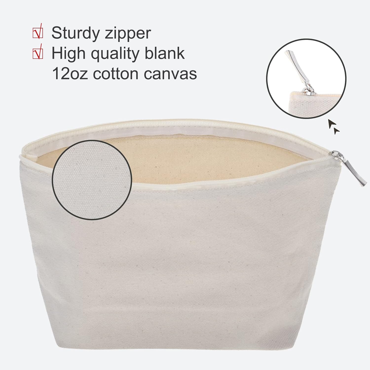 Prezzo per confezione da 6 borse portaoggetti; risparmia spazio e tempo quando riponi e cerchi le tue cose e mostra il tuo buon gusto. Qualità durevole: realizzata in tela di cotone da 12 once; La cerniera in plastica si apre facilmente e mantiene il contenuto sicuro e pulito. Facile da trasportare: ca. 9-1/2" di larghezza x 5-1/2" di altezza x 3" di profondità (24 x 14 x 7,5 cm); si adatta facilmente alla valigia o alla borsa; comodo per riporre cosmetici, accessori elettronici, oggetti essenziali da viaggio e altre piccole cose Ottima scelta per progetti fai da te: la tela bianca consente la decorazione con vernice per tessuti, pennarelli e materiale per collage, perfetta per dipingere, ricamare, serigrafare e stampare a trasferimento termico, puoi farne una borsa unica che desideri Va notato che prima di applicare il calore all'esterno, puoi apri ogni sacchetto e metti dentro un pezzo di stoffa o di carta per evitare che la tela si attacchi.