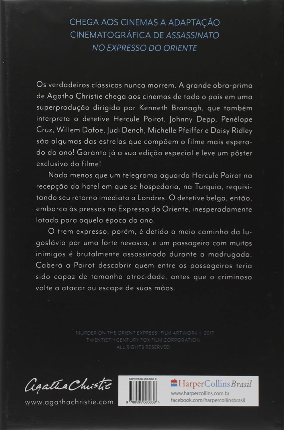 Comprei o livro para reler, pois já não me recordava dos detalhes da história. Em primeiro lugar, a edição da Harper Collins foi uma excelente surpresa. A capa dura, a diagramação, a qualidade das páginas, dão um nível extra de conforto à leitura. Quanto ao conteúdo, as reviravoltas e as intrigas investigadas pelo sempre magnífico detetive Hercule Poirot nos fazem sentir presentes no próprio Expresso do Oriente. A escrita de Agatha é fluida e agradável, e é capaz de contar a história de maneira bem mais cadenciada que o filme. Recomendo muito a quem gosta do gênero suspense, especialmente visto que hoje se encontra cheio de clichês. Se hoje tem um molde tão copiado, se deve a pessoas como Agatha Christie, que formularam a maneira original de se fazer suspense.