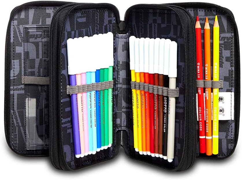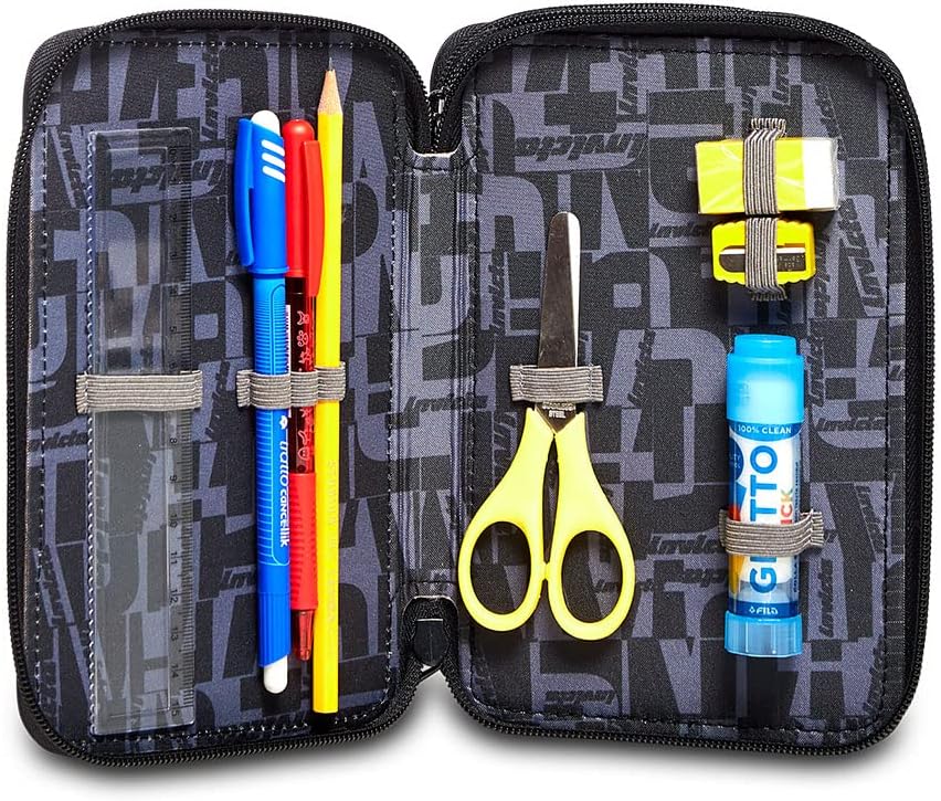 Astuccio 3 Zip Invicta Logo, Nero, Completo di Matite, Pennarelli etc.., Scuola & Tempo Libero